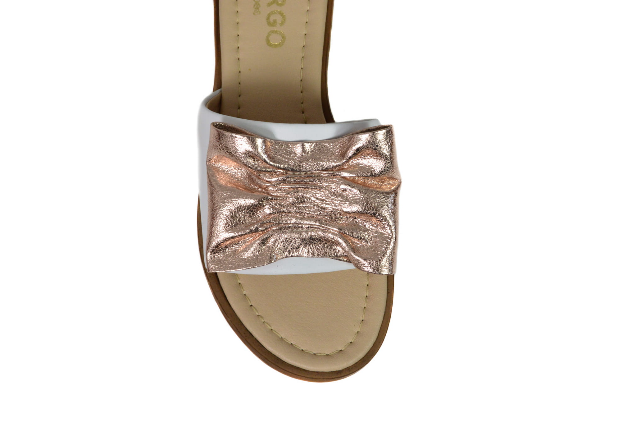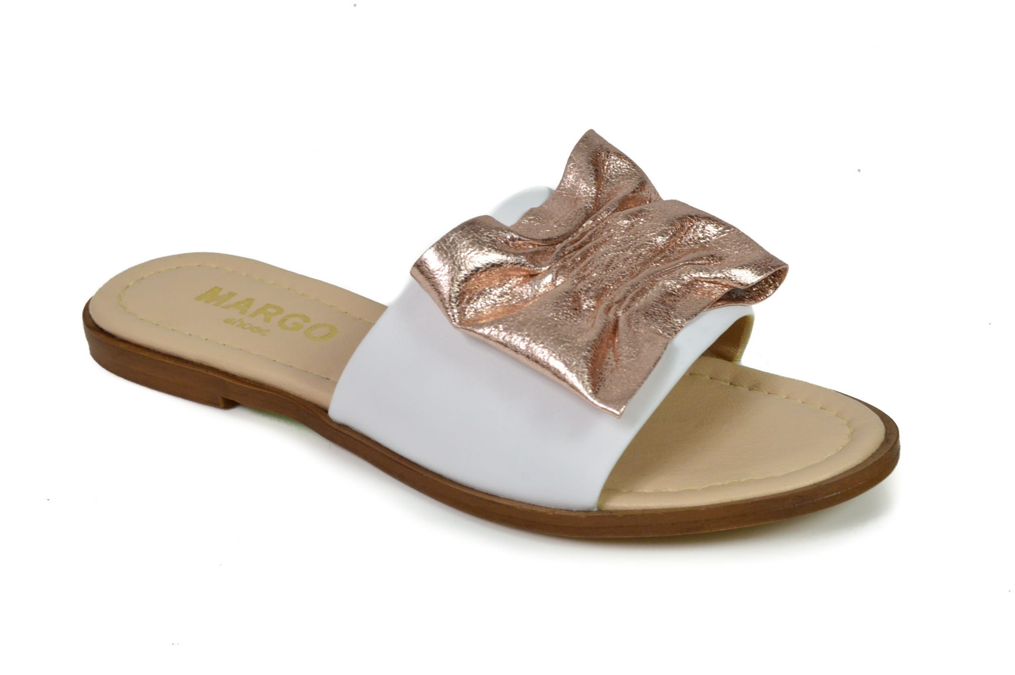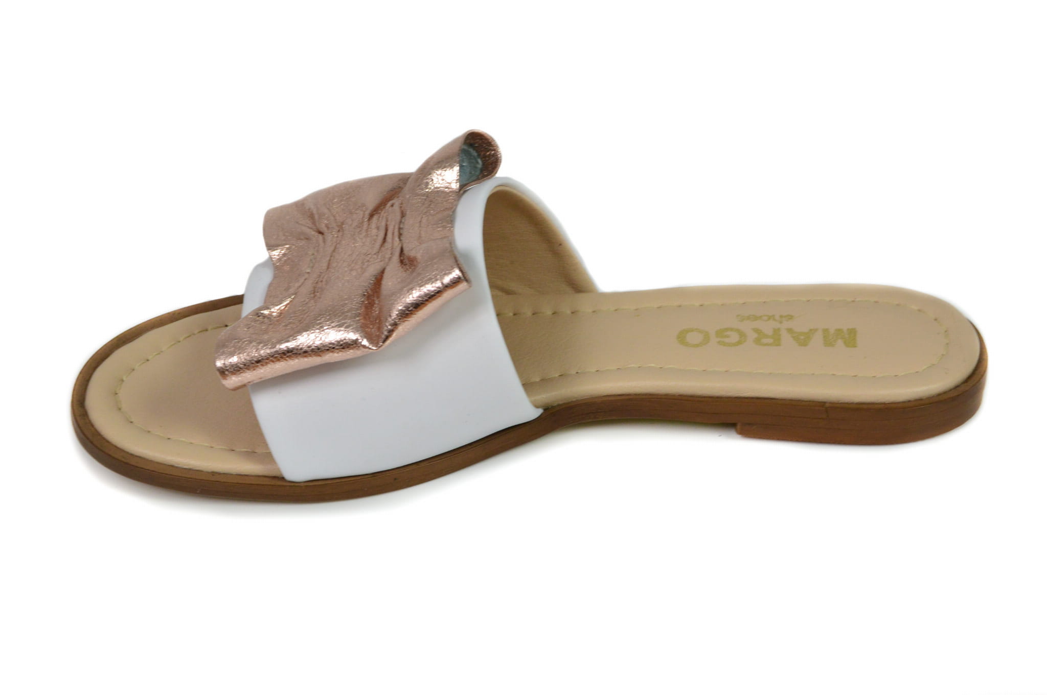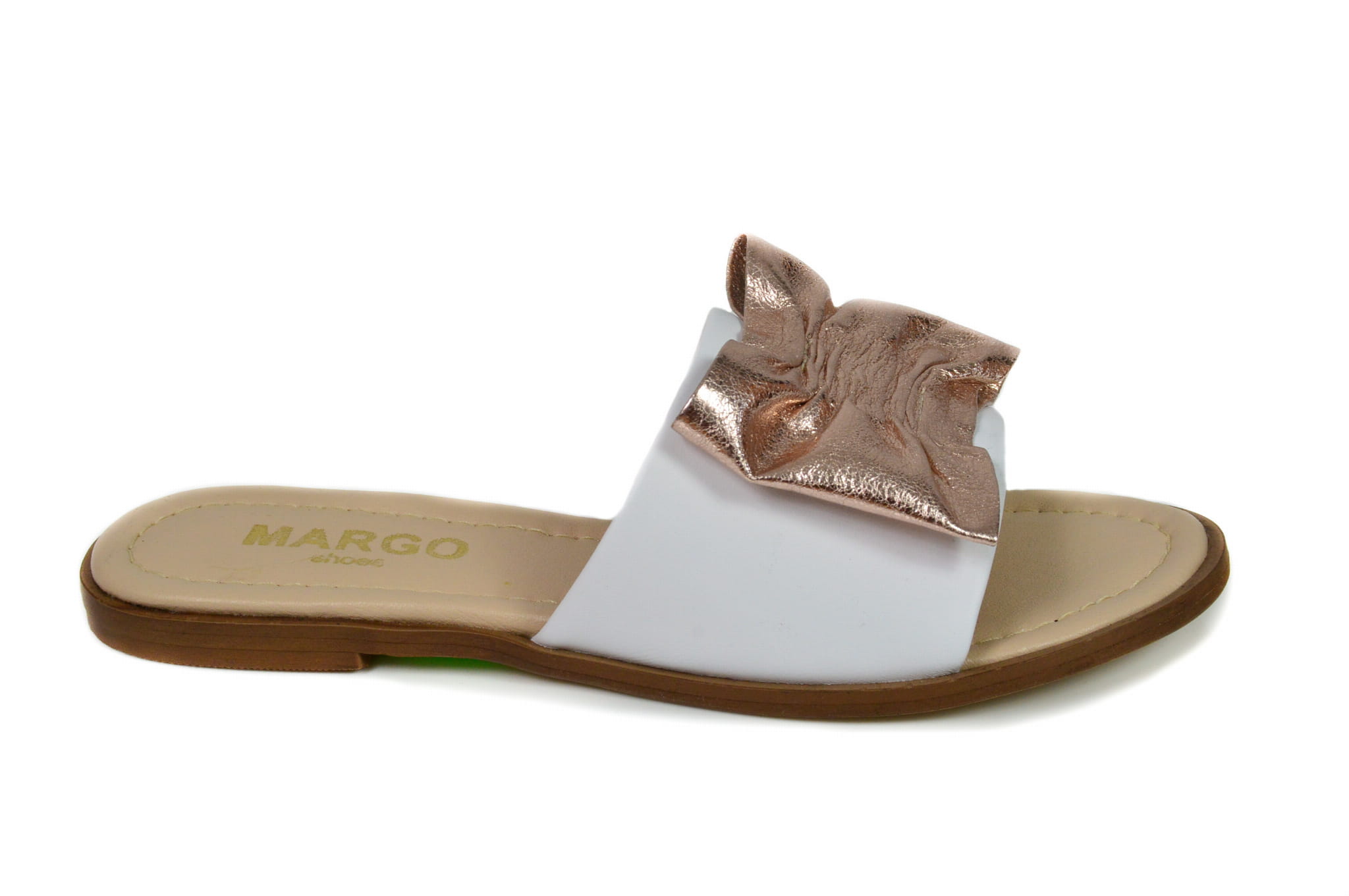 Białe klapki damskie z różową ozdobą, wykonane ze skóry naturalnej. Buty polskiej produkcji marki MargoShoes. W klapkach zastosowano płaską podeszwę.