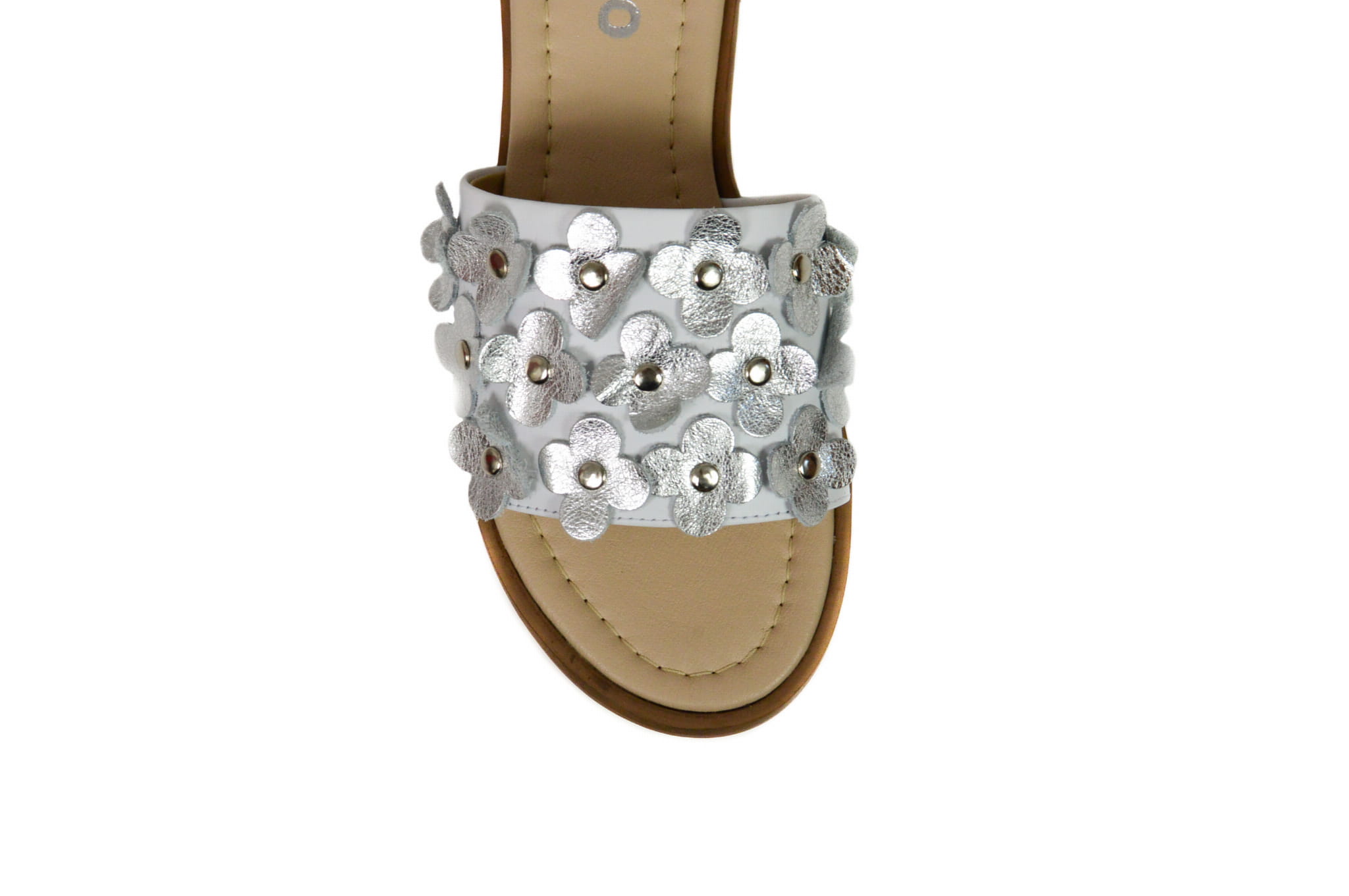 Biało - srebrne klapki z kwiatkami na płaskiej podeszwie - skóra naturalna