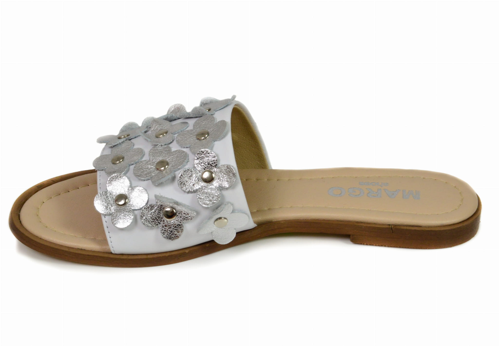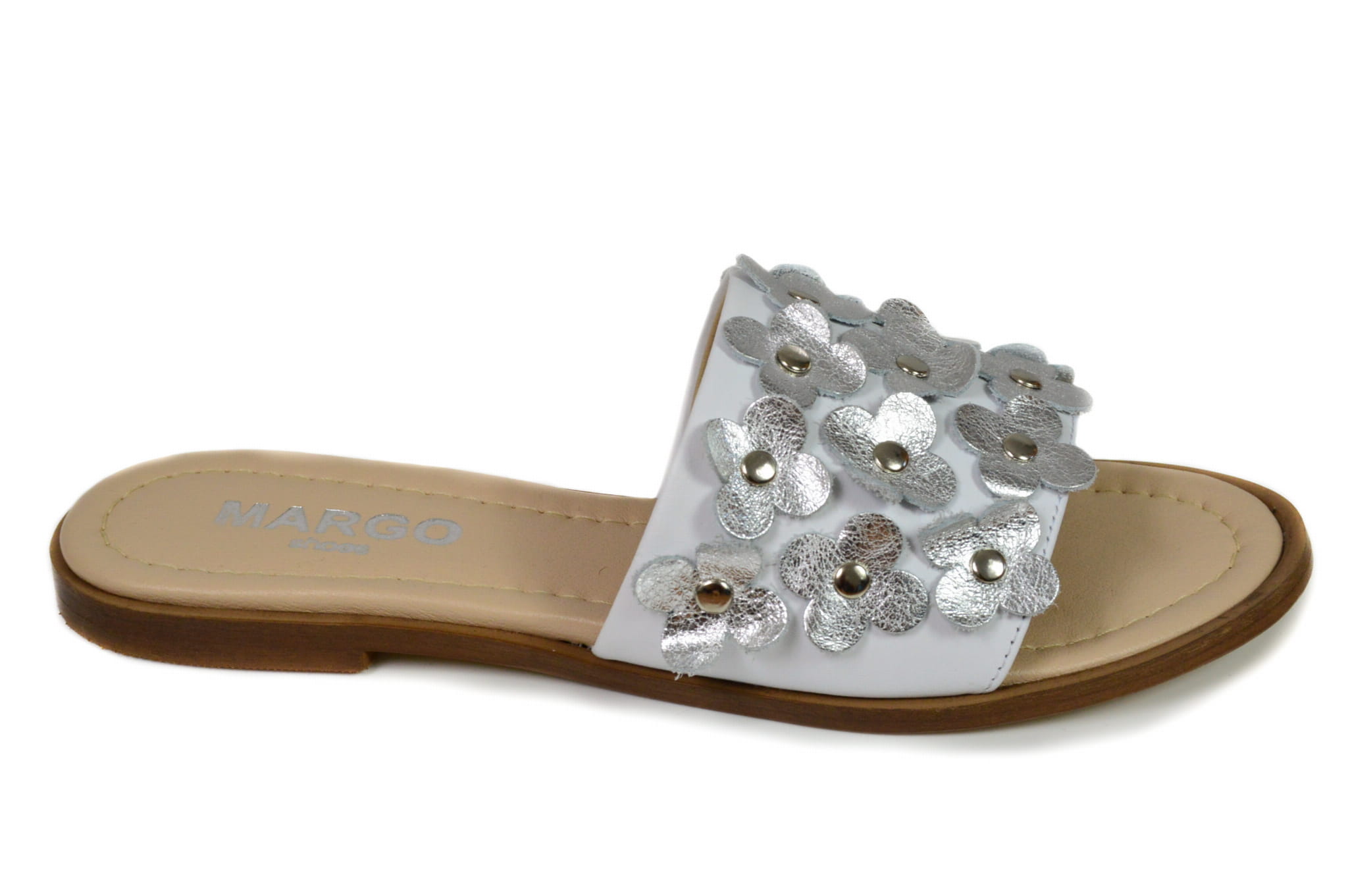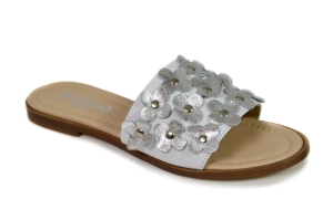 Biało- srebrne klapki damskie z kwiatkami, wykonane ze skóry naturalnej. Buty polskiej produkcji marki MargoShoes. W klapkach zastosowano płaską podeszwę.