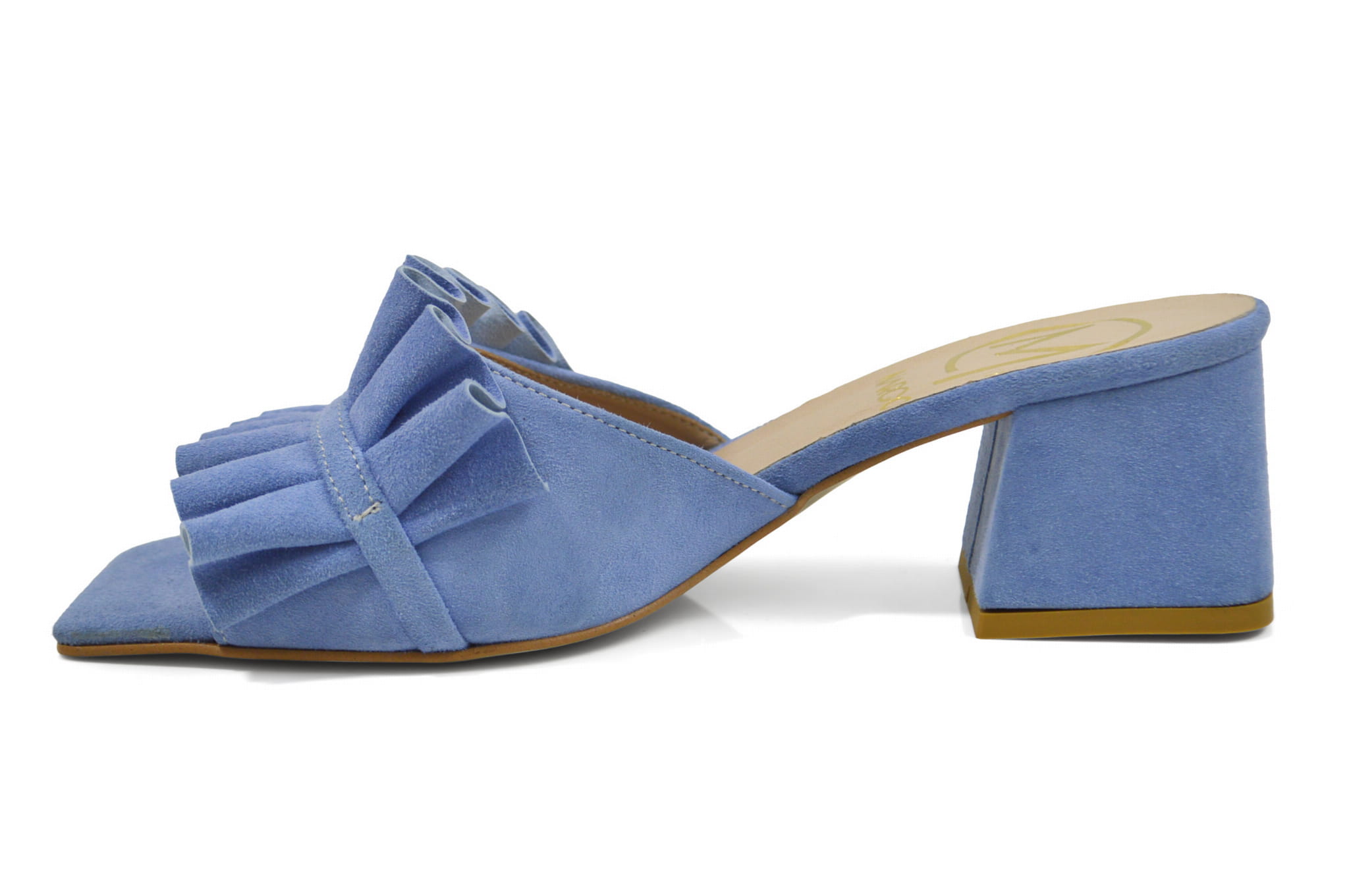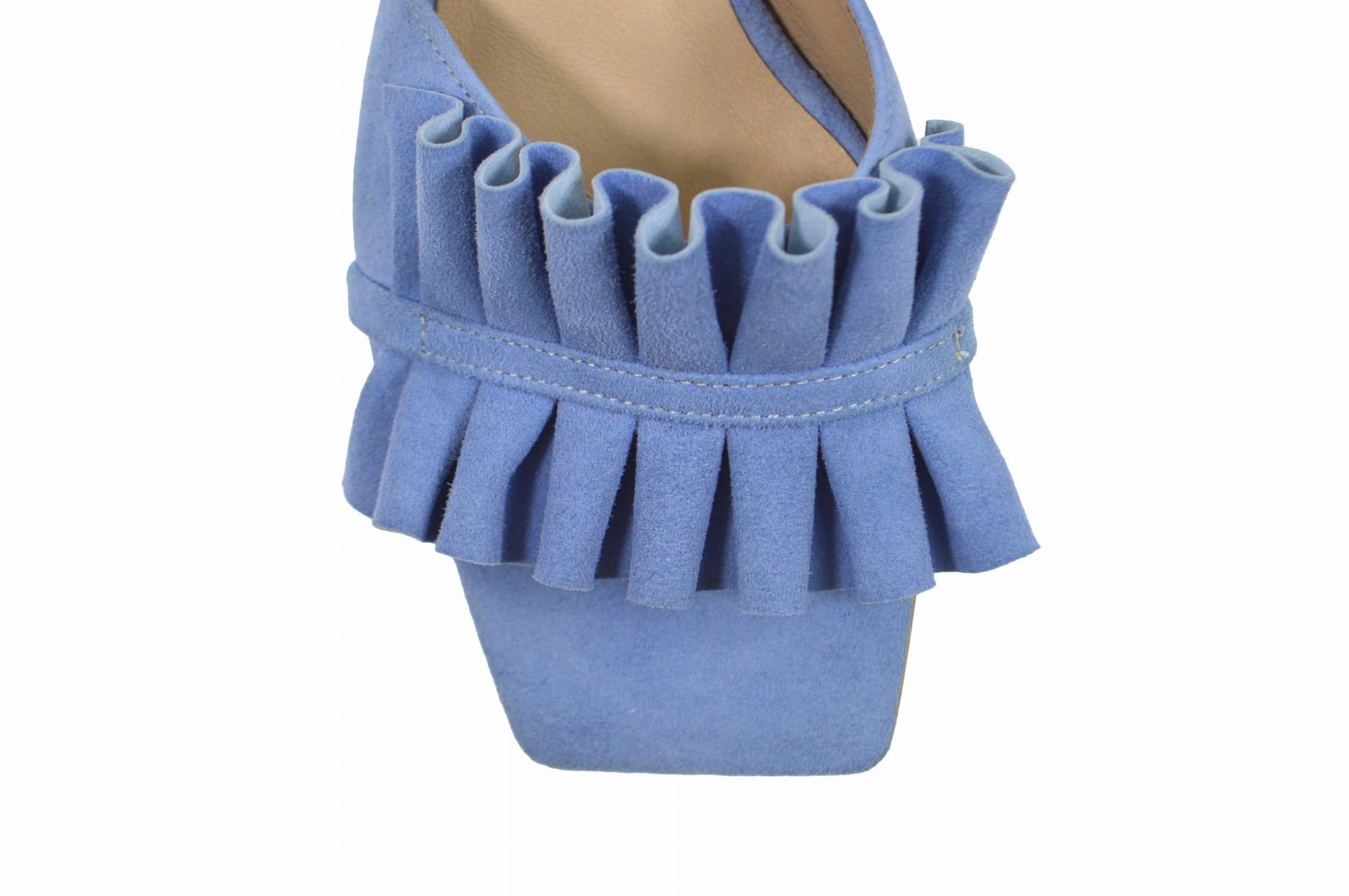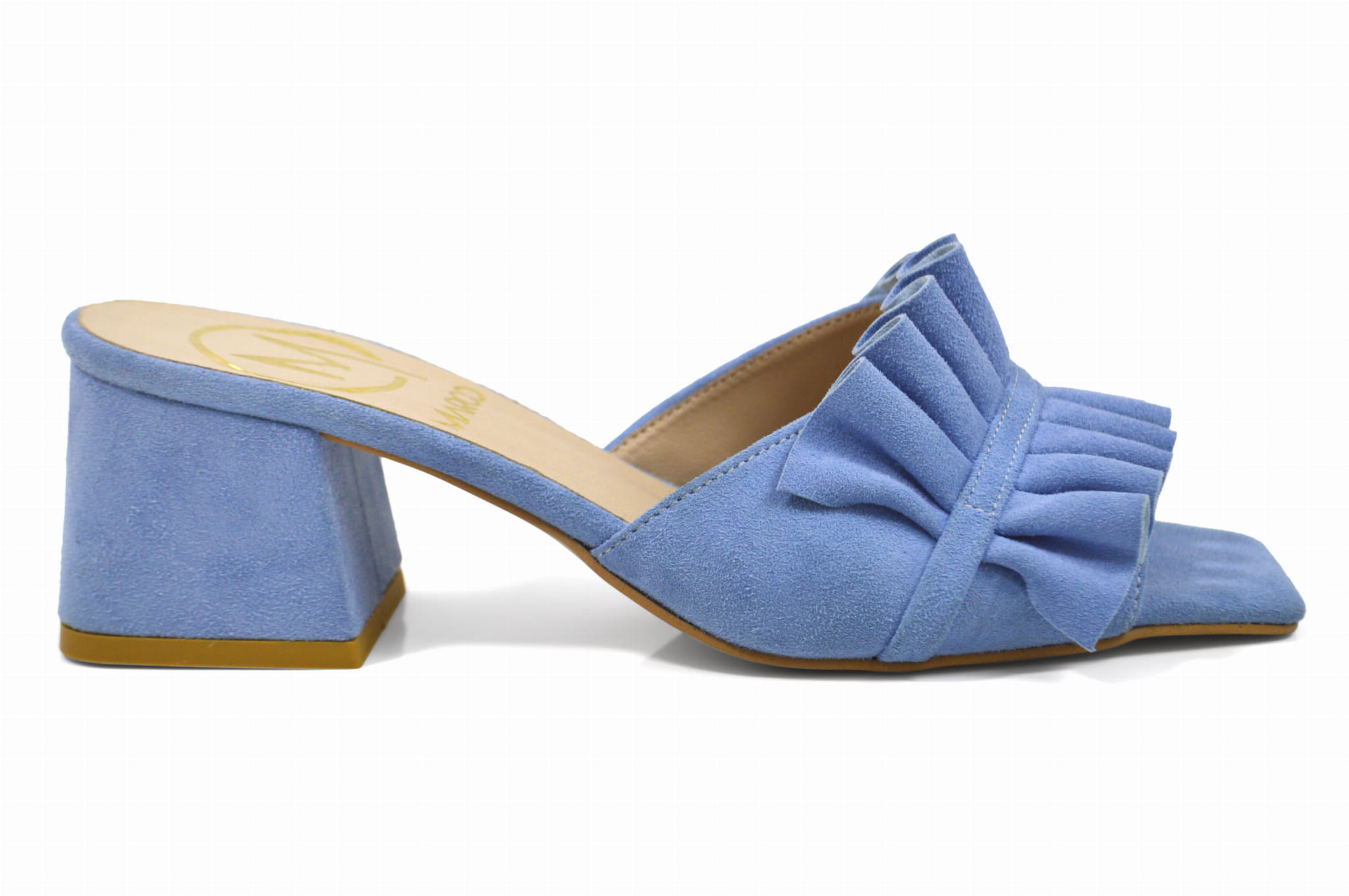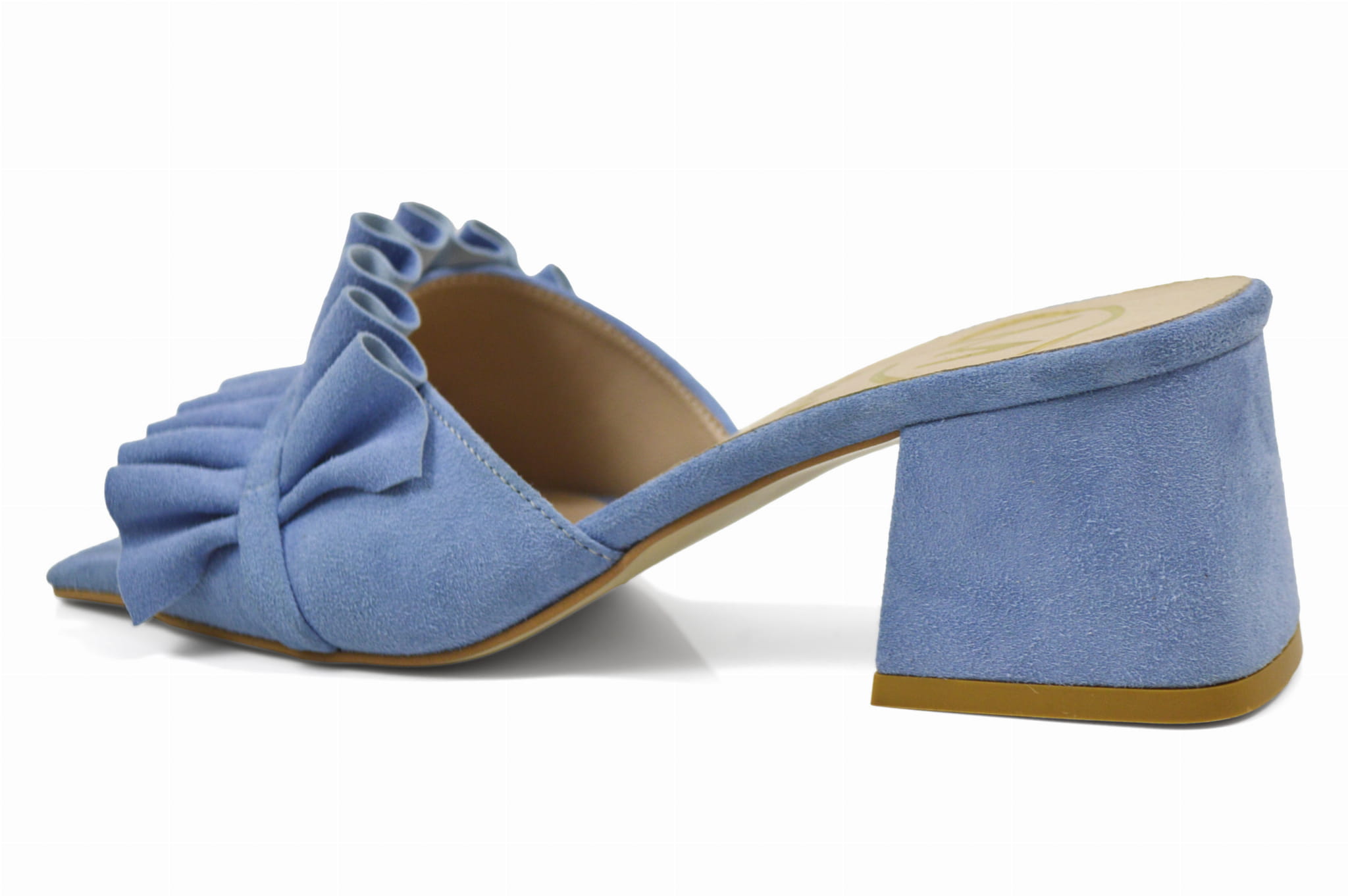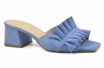 Błękitne klapki zamszowe z ozdobą rozkloszowany obcas klocek