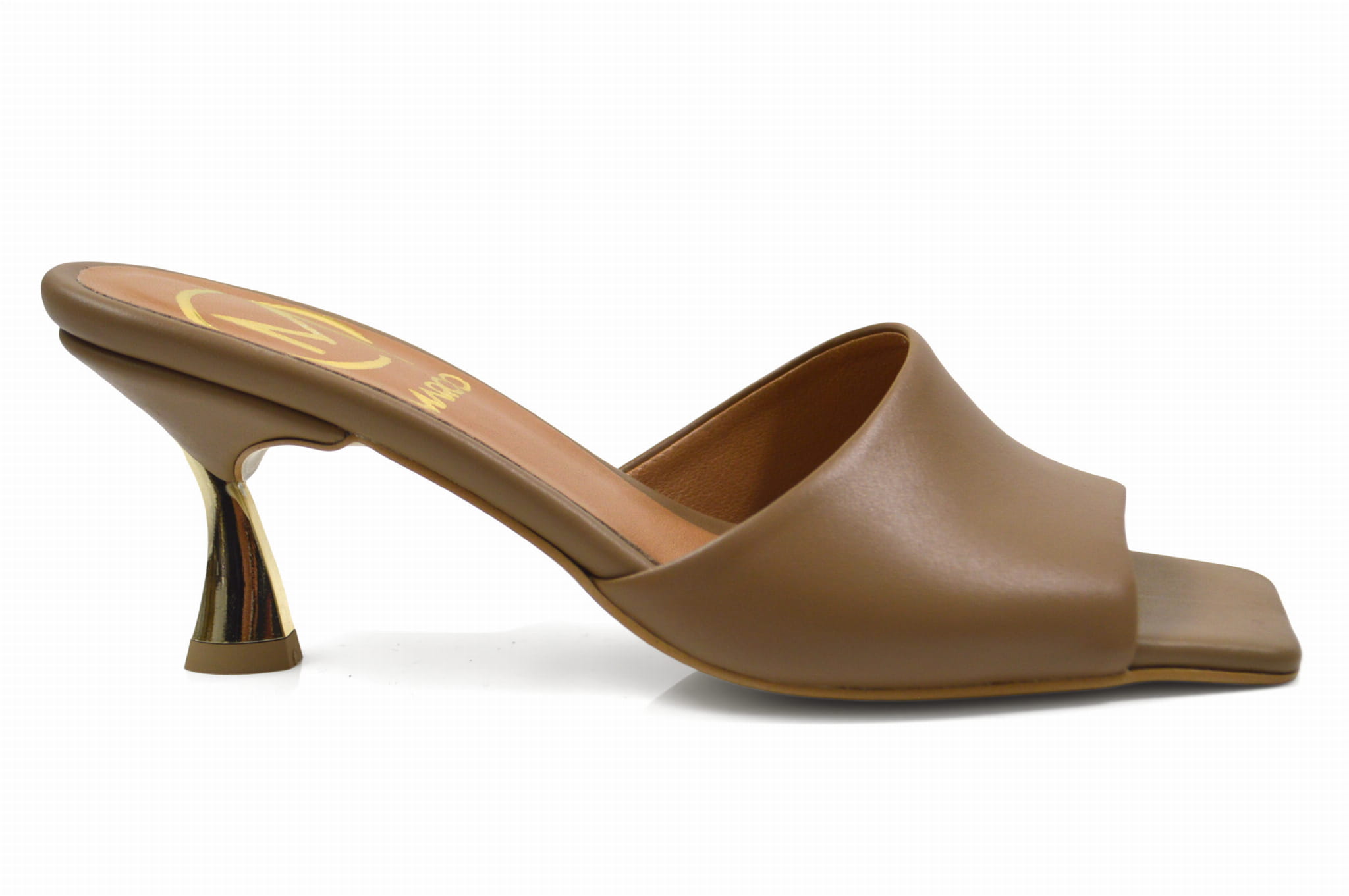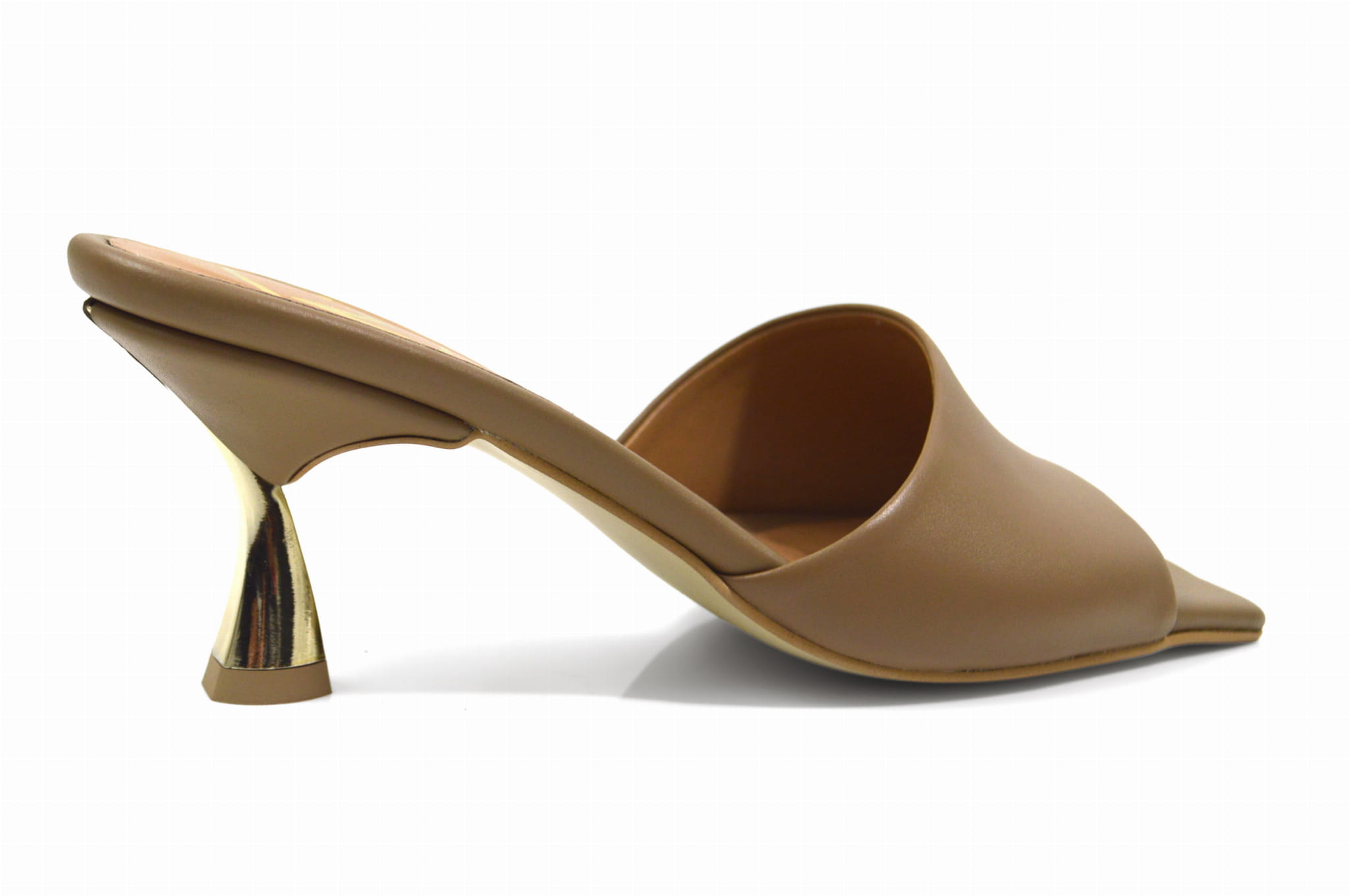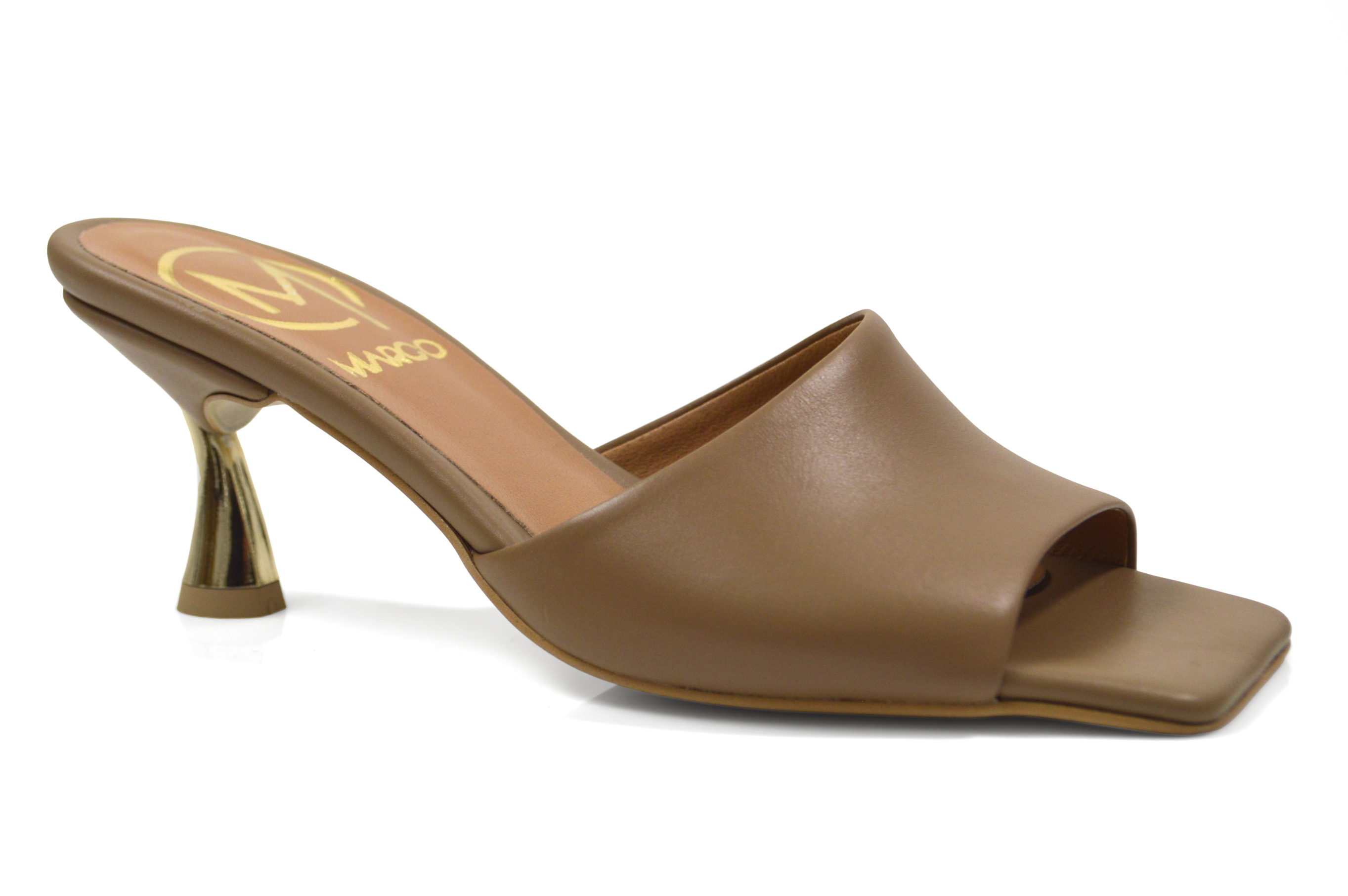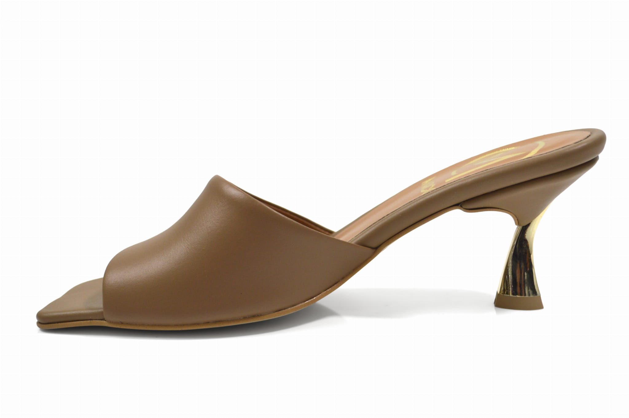 Brązowe klapki skórzane rozkloszowany złoty obcas szpilka