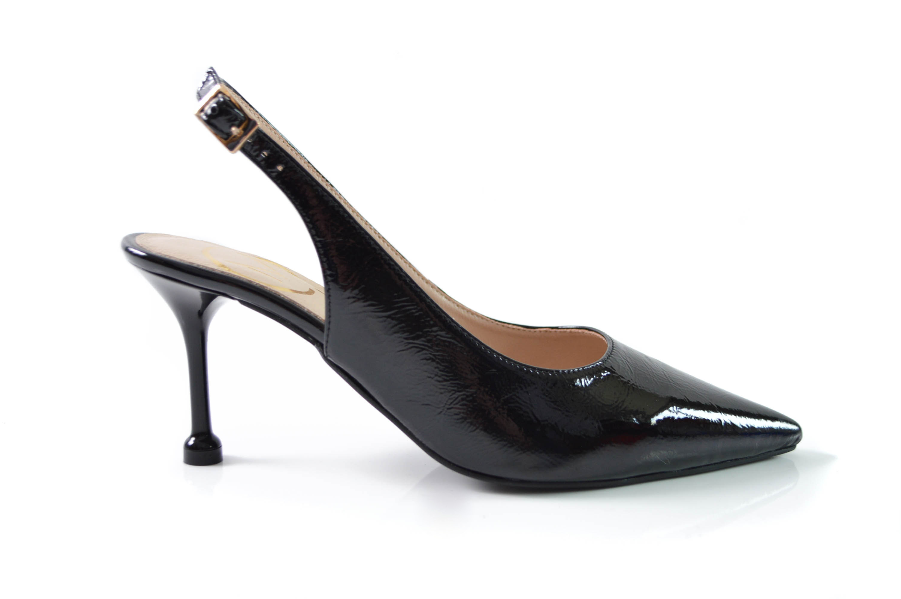 Nosek w szpic optycznie wysmukla stopę i dodaje sylwetce lekkości, a szpilka o wysokości 7,5 cm zapewnia idealne proporcje pomiędzy elegancją a komfortem noszenia. Odkryta pięta nadaje całości nowoczesnego charakteru, a pasek zapinany na klamerkę gwarantuje stabilność i perfekcyjne dopasowanie. Klasyczna czerń w lakierowanym wykończeniu to wybór niezwykle uniwersalny, który doskonale dopełnia zarówno minimalistyczne, jak i bardziej wyraziste stylizacje.
