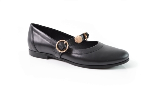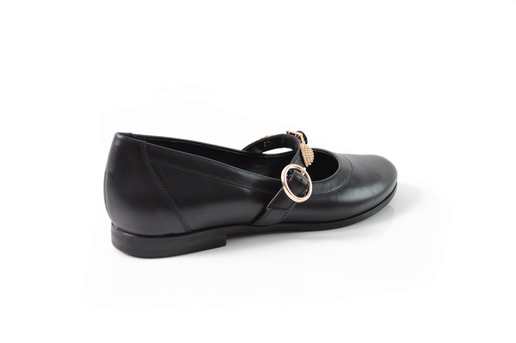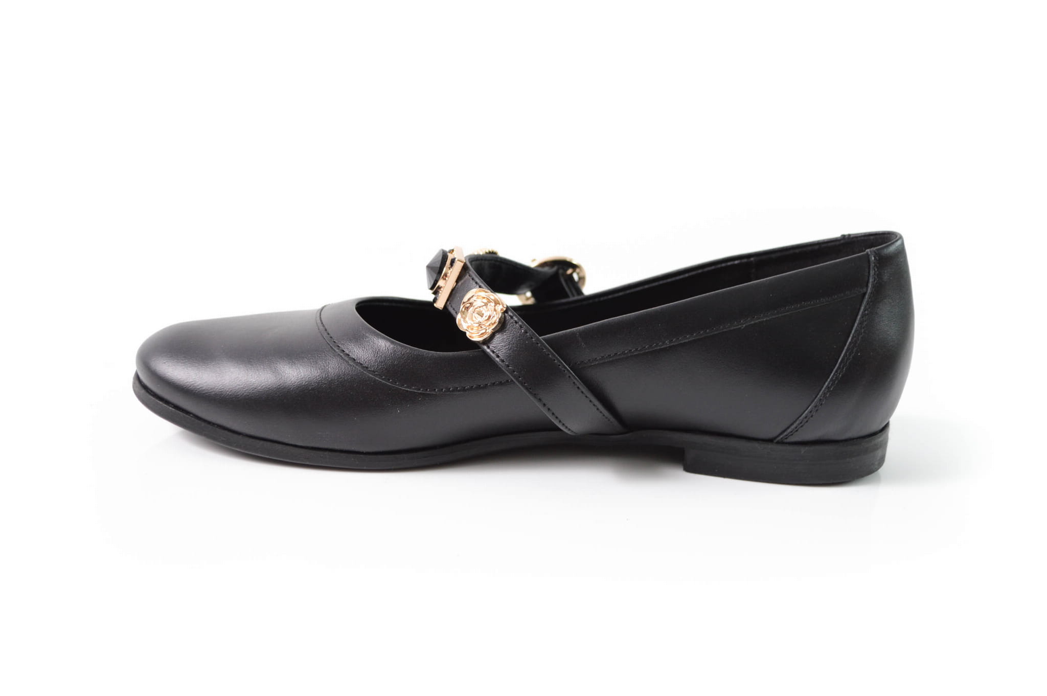 Czarne licowe baleriny z paskiem i złotymi ozdobami