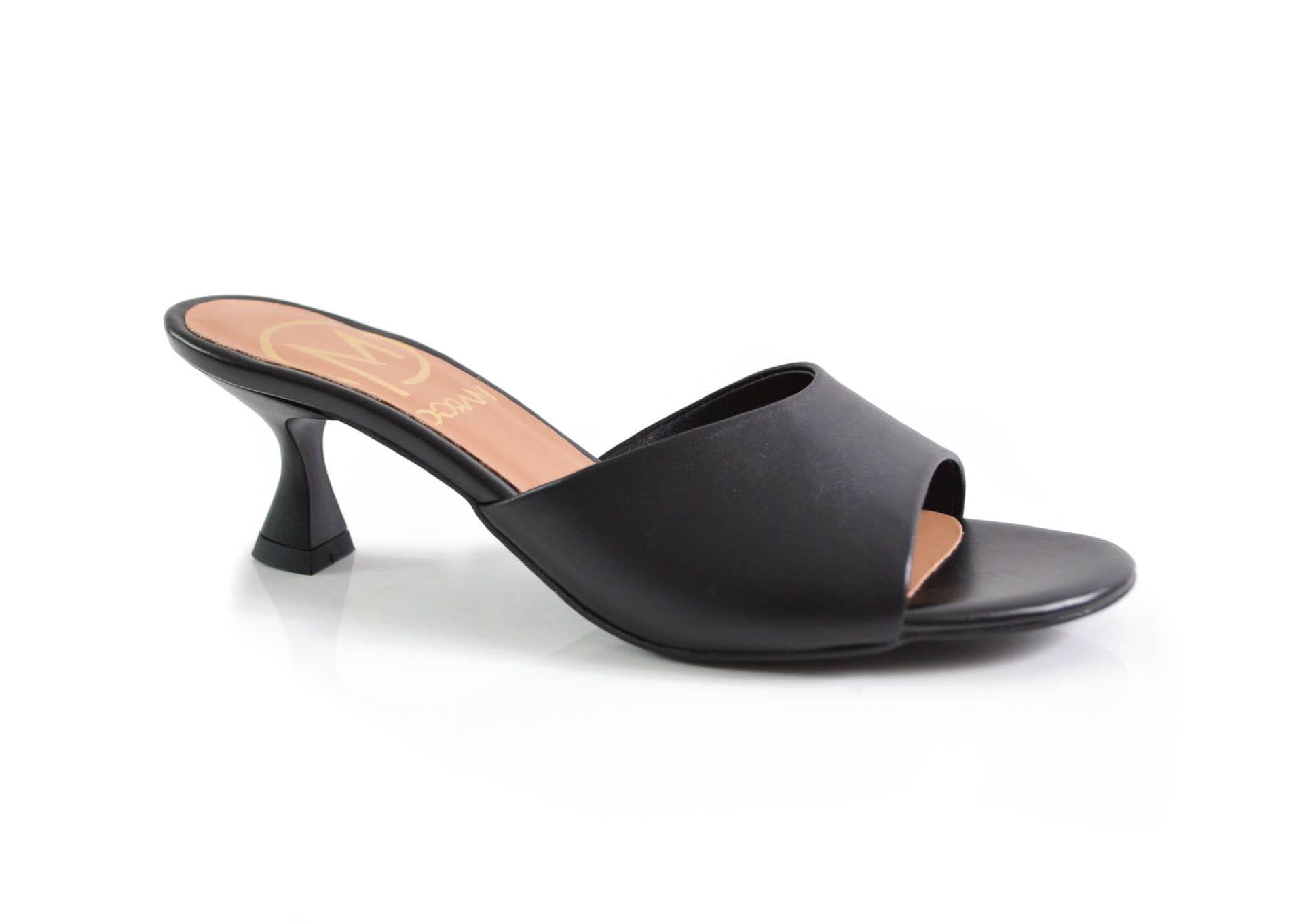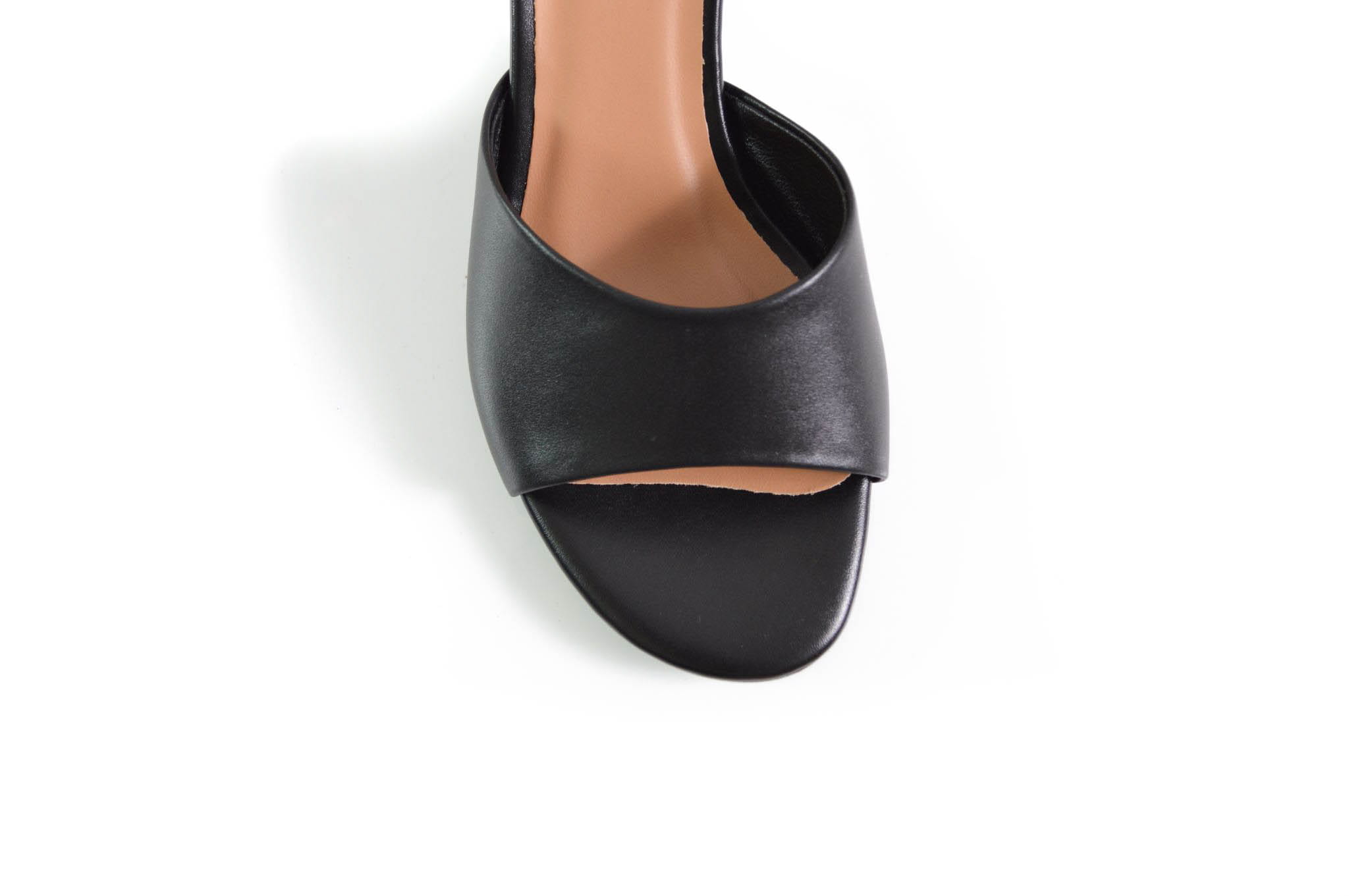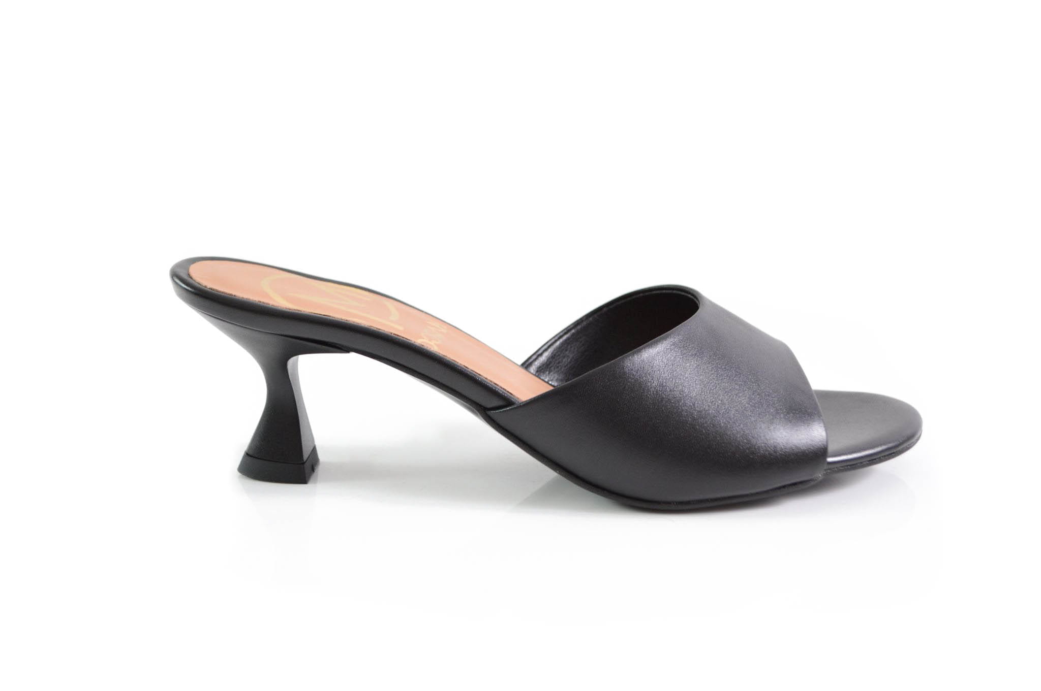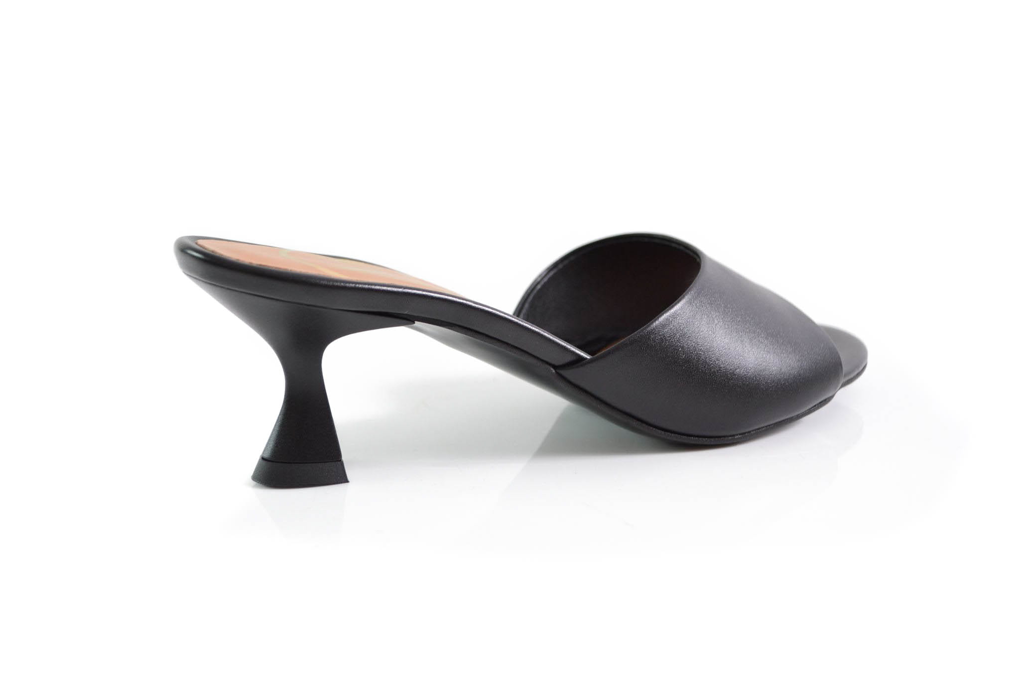 Minimalistyczne, ale z charakterem – te czarne klapki wykonane z wysokiej jakości skóry licowej to połączenie klasycznej elegancji i nowoczesnej formy. Stabilny, rozkloszowany obcas o nietuzinkowym kształcie dodaje im modowego sznytu i subtelnie wysmukla sylwetkę, nie rezygnując przy tym z komfortu.