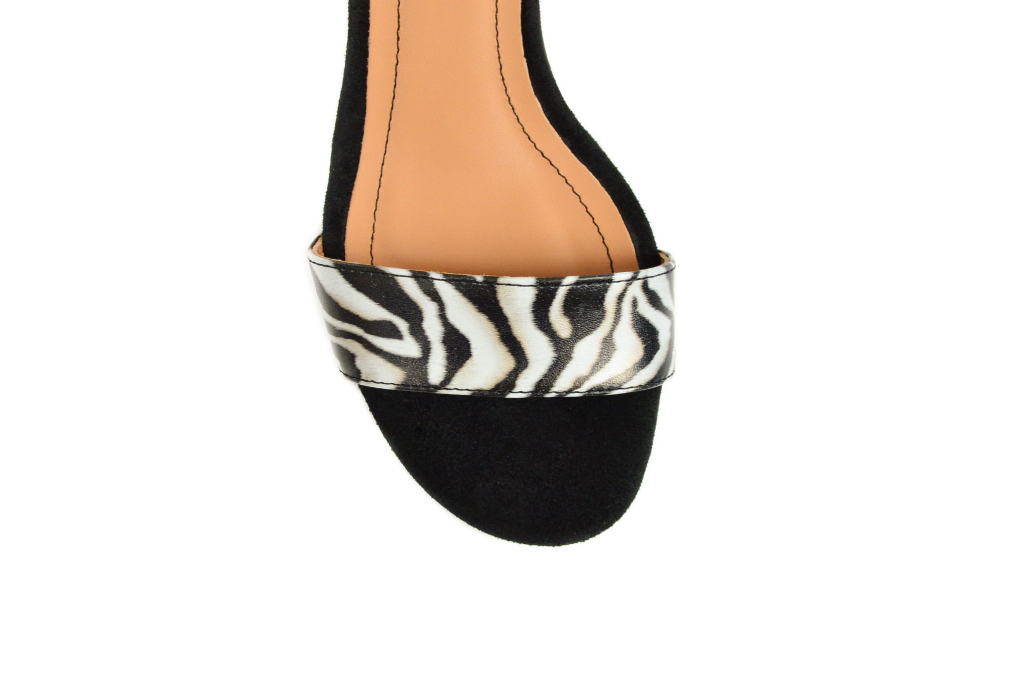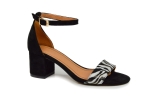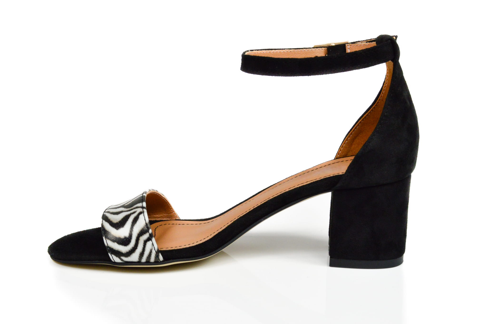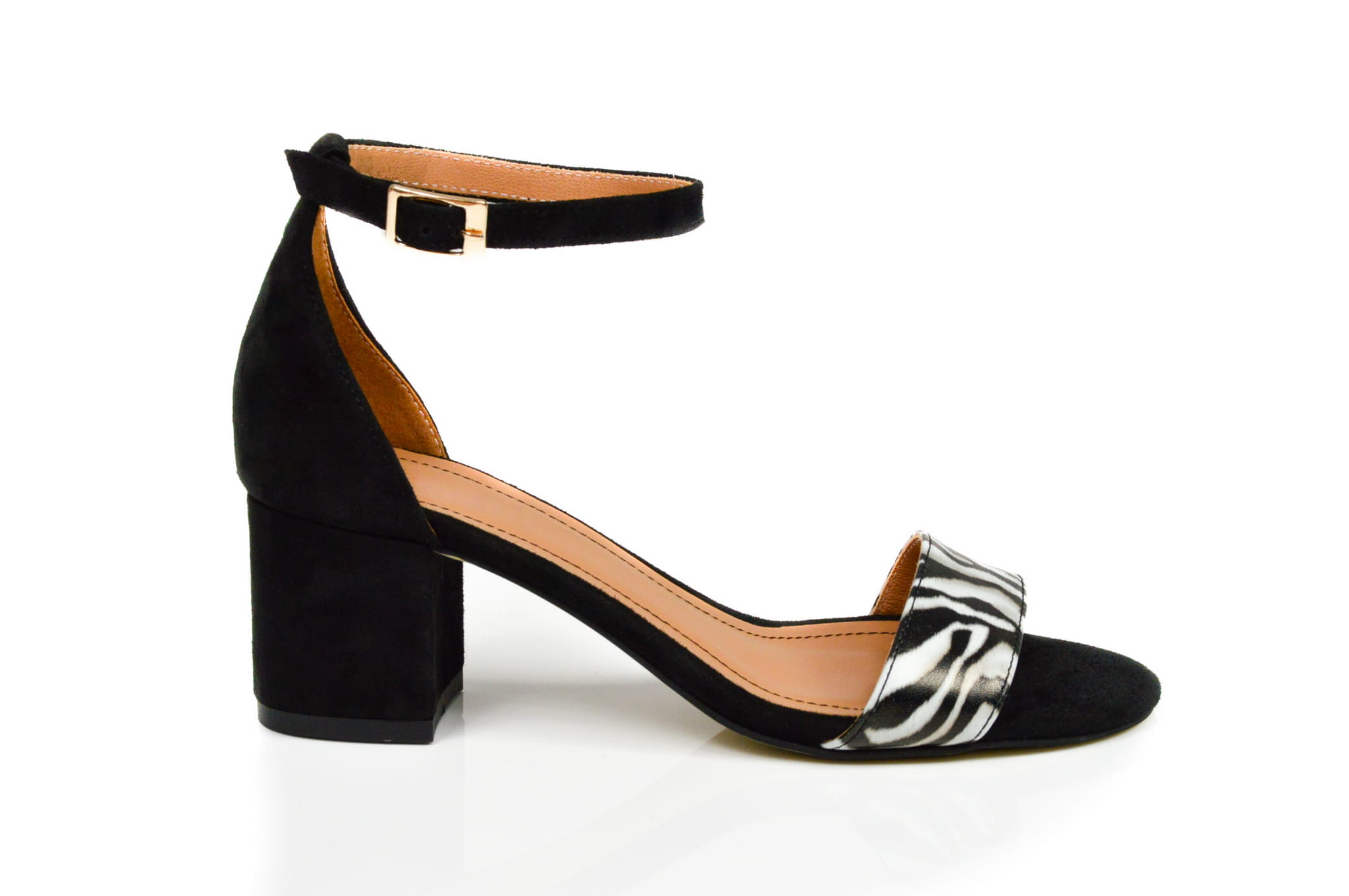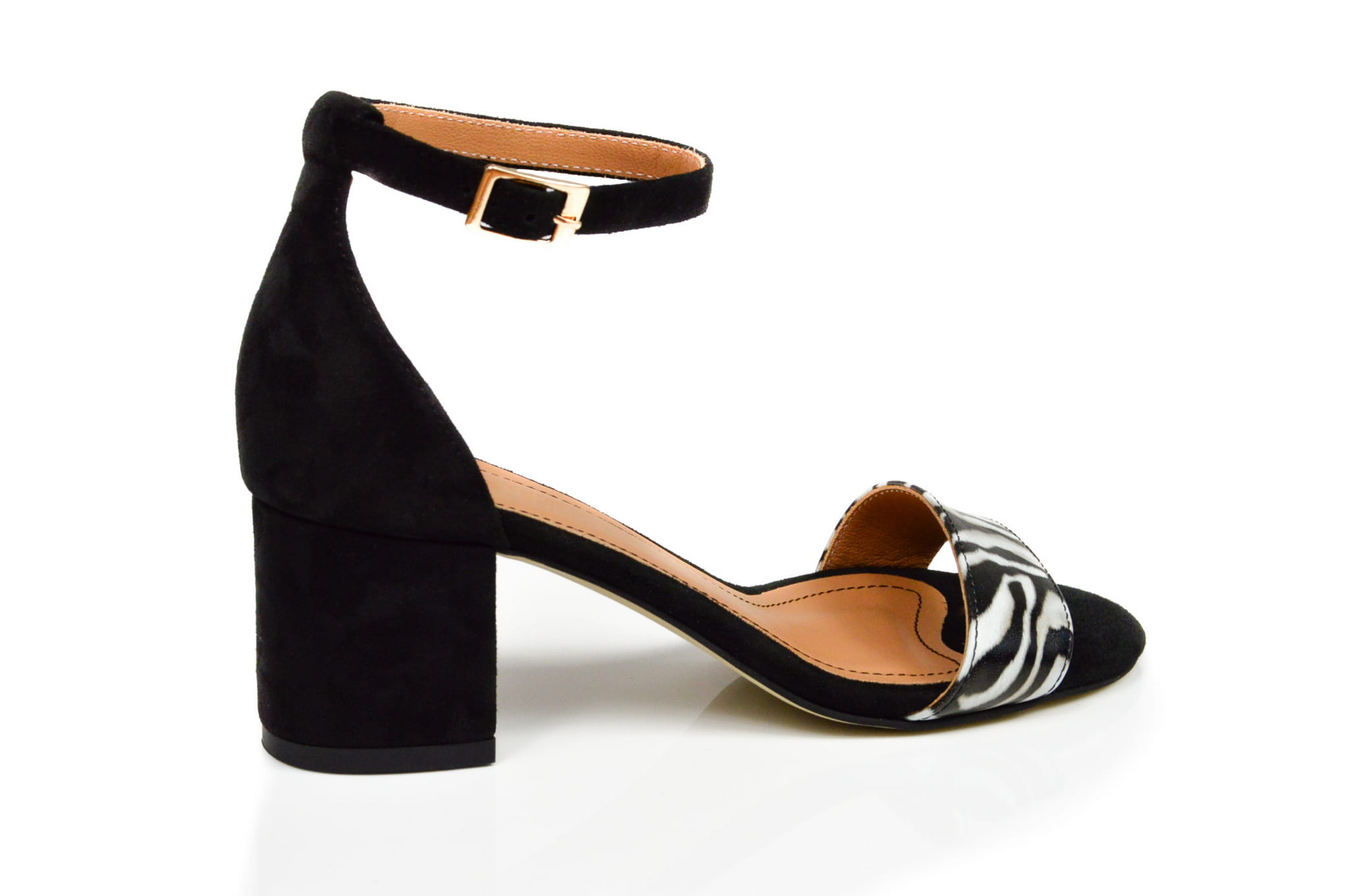 Czarno- zeberkowe sandałki damskie, wykonane ze skóry naturalnej: zamszowej, w butach zastosowano obcas typu klocek wysokości: 5,5 cm. Sandałki zapinane wokół kostki na klamerkę.