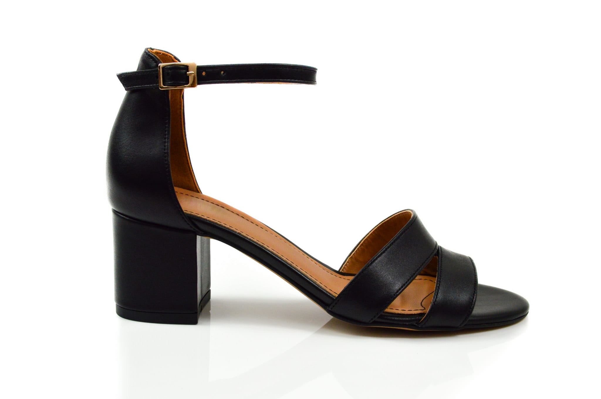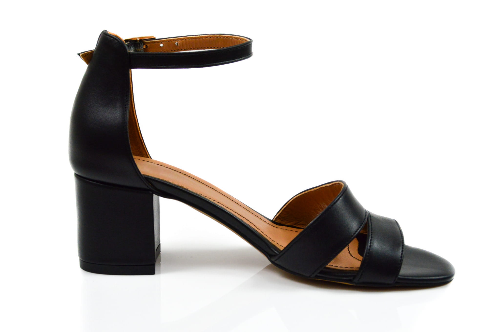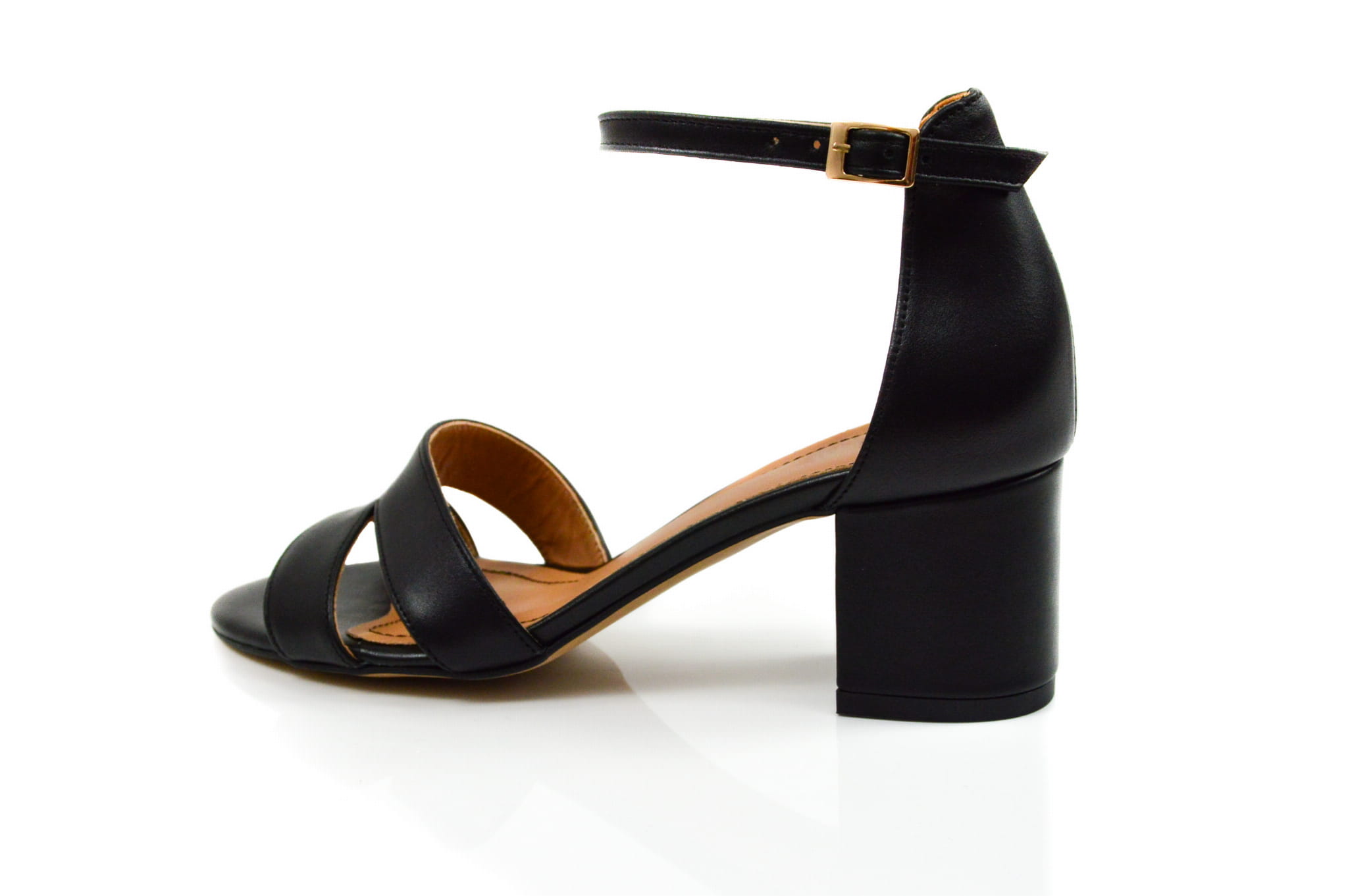 Czarne licowe sandałki damskie, wykonane ze skóry naturalnej, w butach zastosowano obcas typu klocek wysokości: 5,5 cm. Sandałki zapinane wokół kostki na klamerkę.