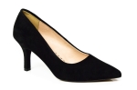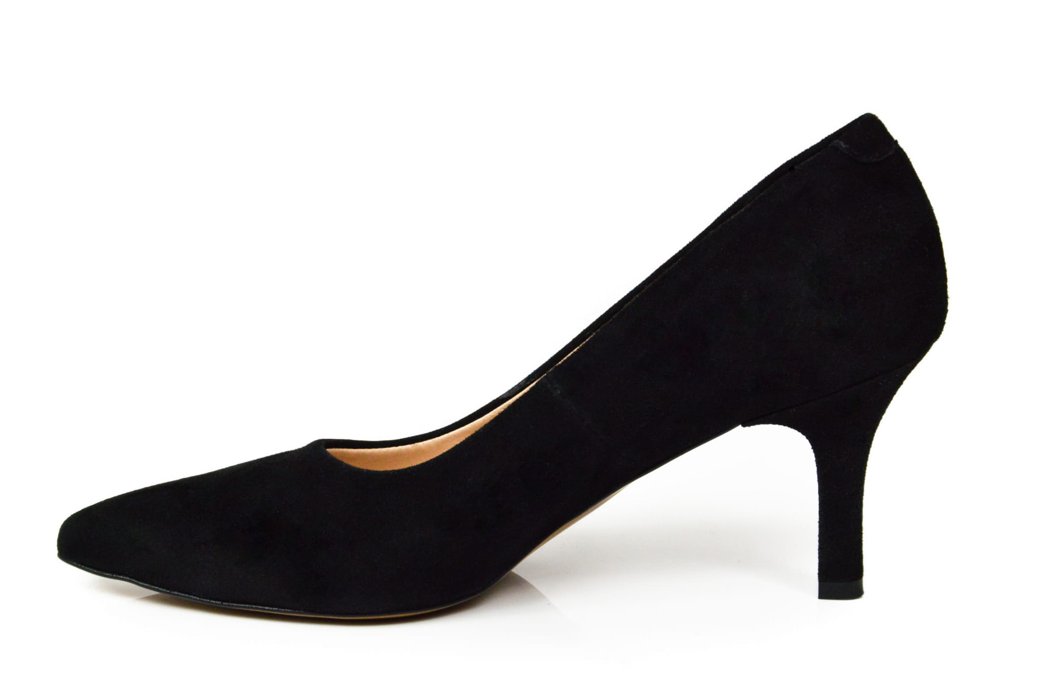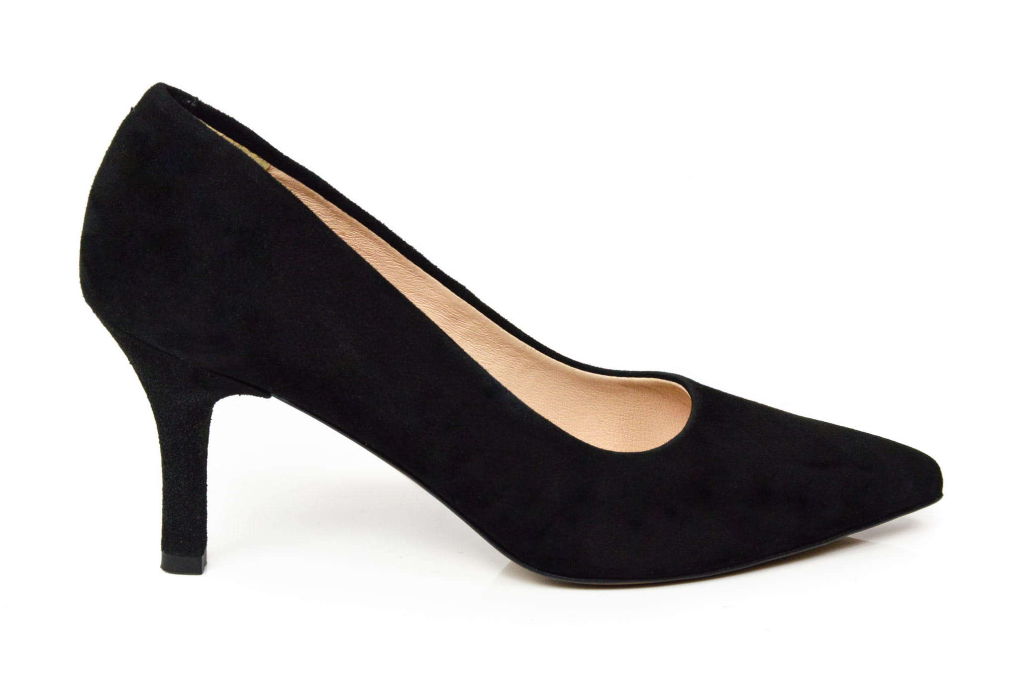 Czarne czółenka damskie w szpic, polskiej marki MargoShoes, wykonane ze skóry naturalnej- zamszowej, w butach zastosowano obcas typu szpilka o wysokości 7 cm.