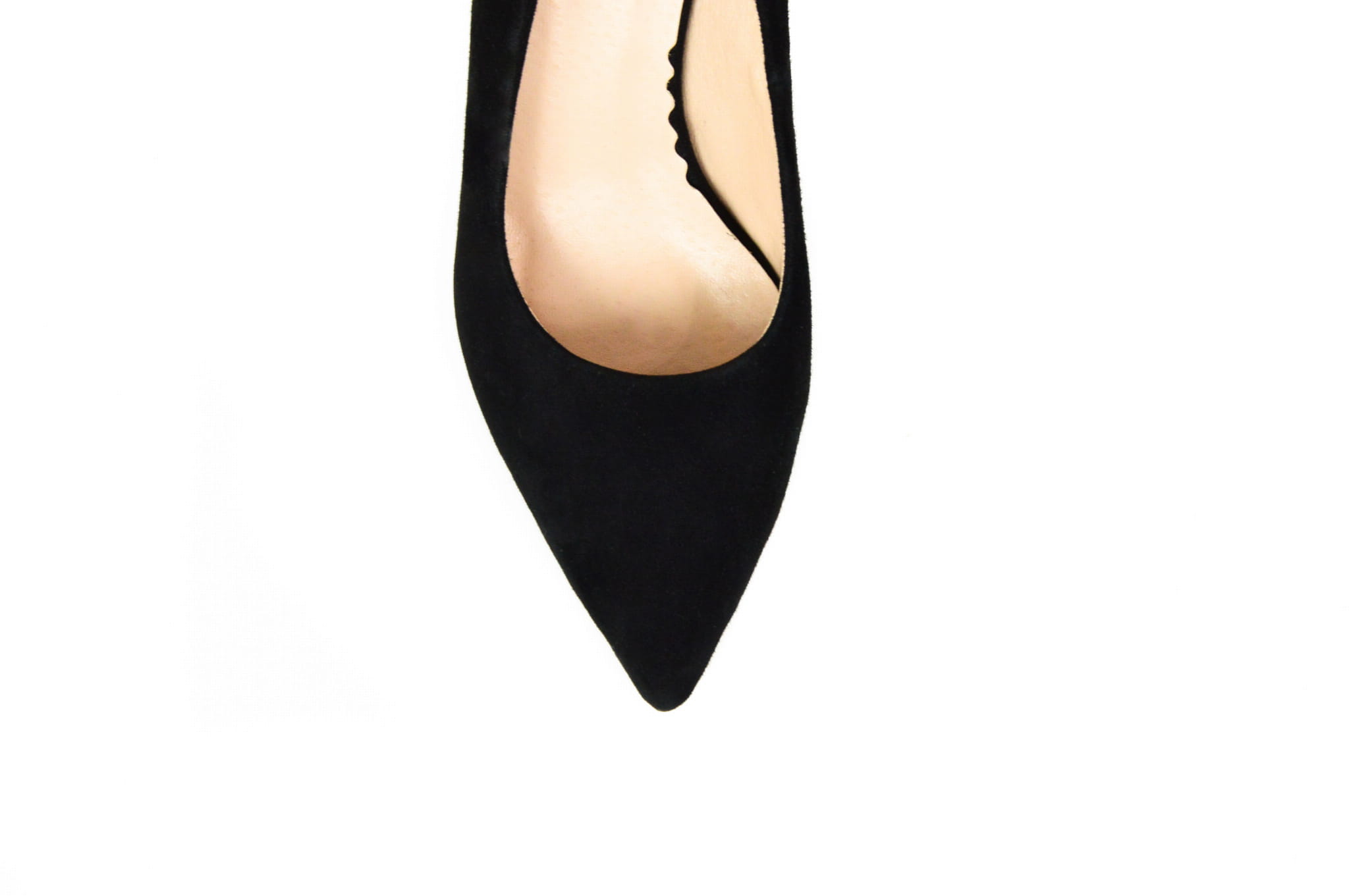 Czarne skórzane czółenka na szpilce 7 cm w szpic skóra zamszowa