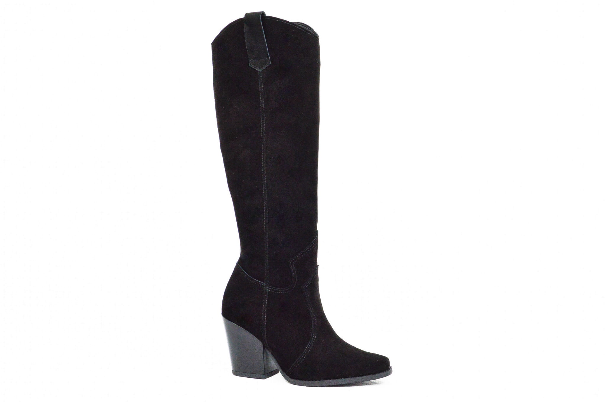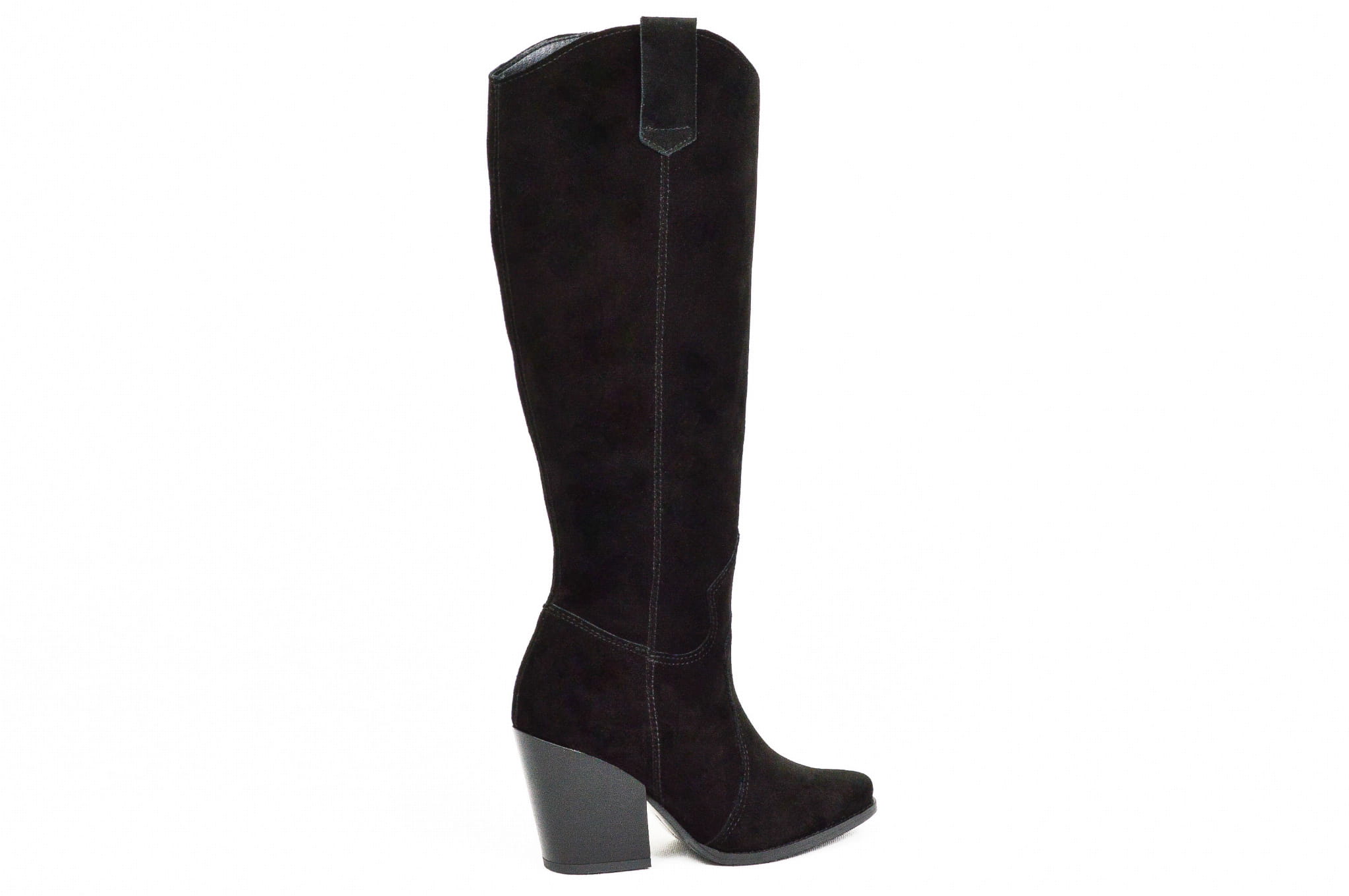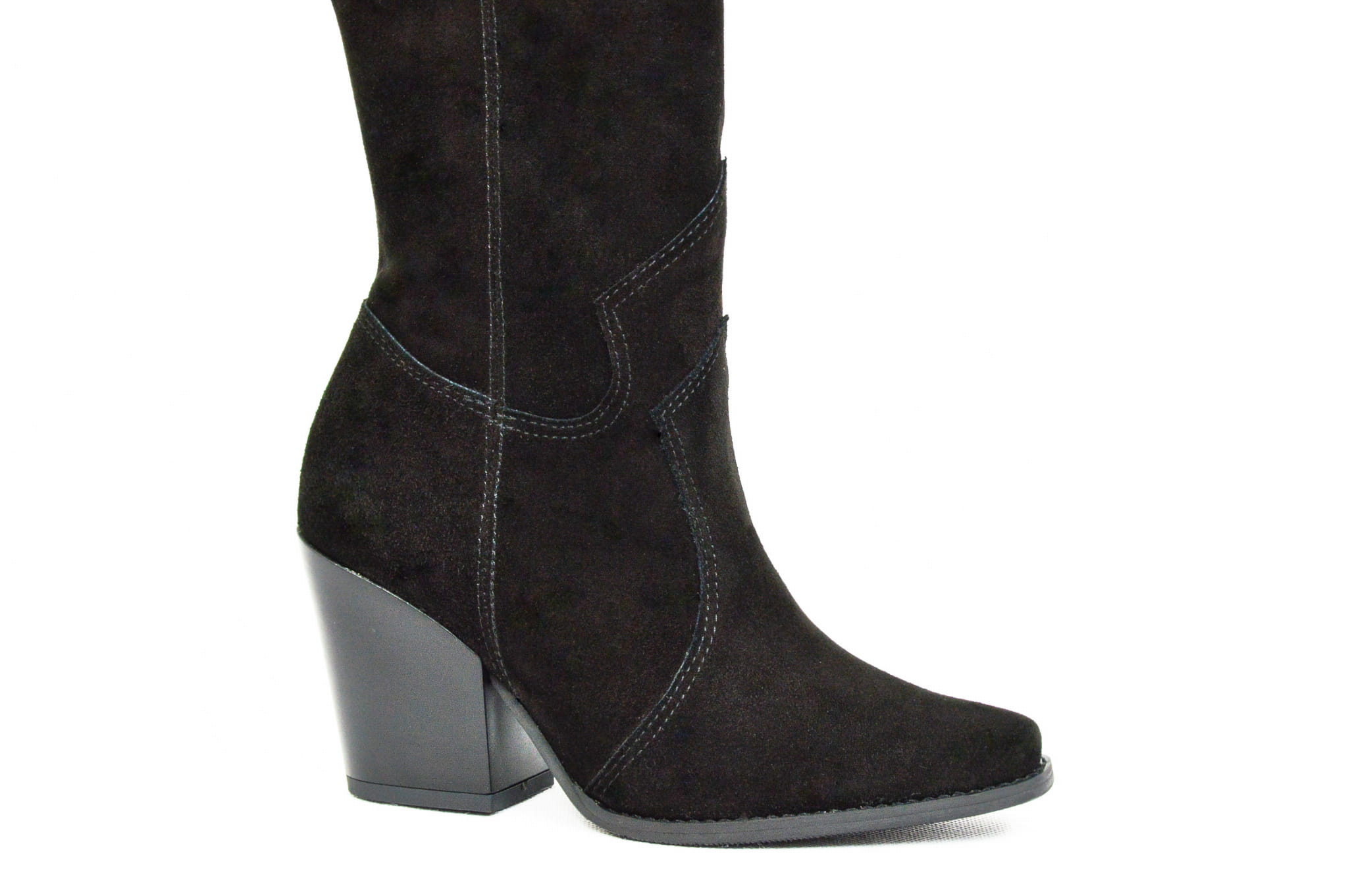 Czarne skórzane kowbojki kozaki stabilny obcas słupek zamszowe ostry czubek