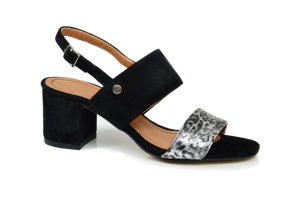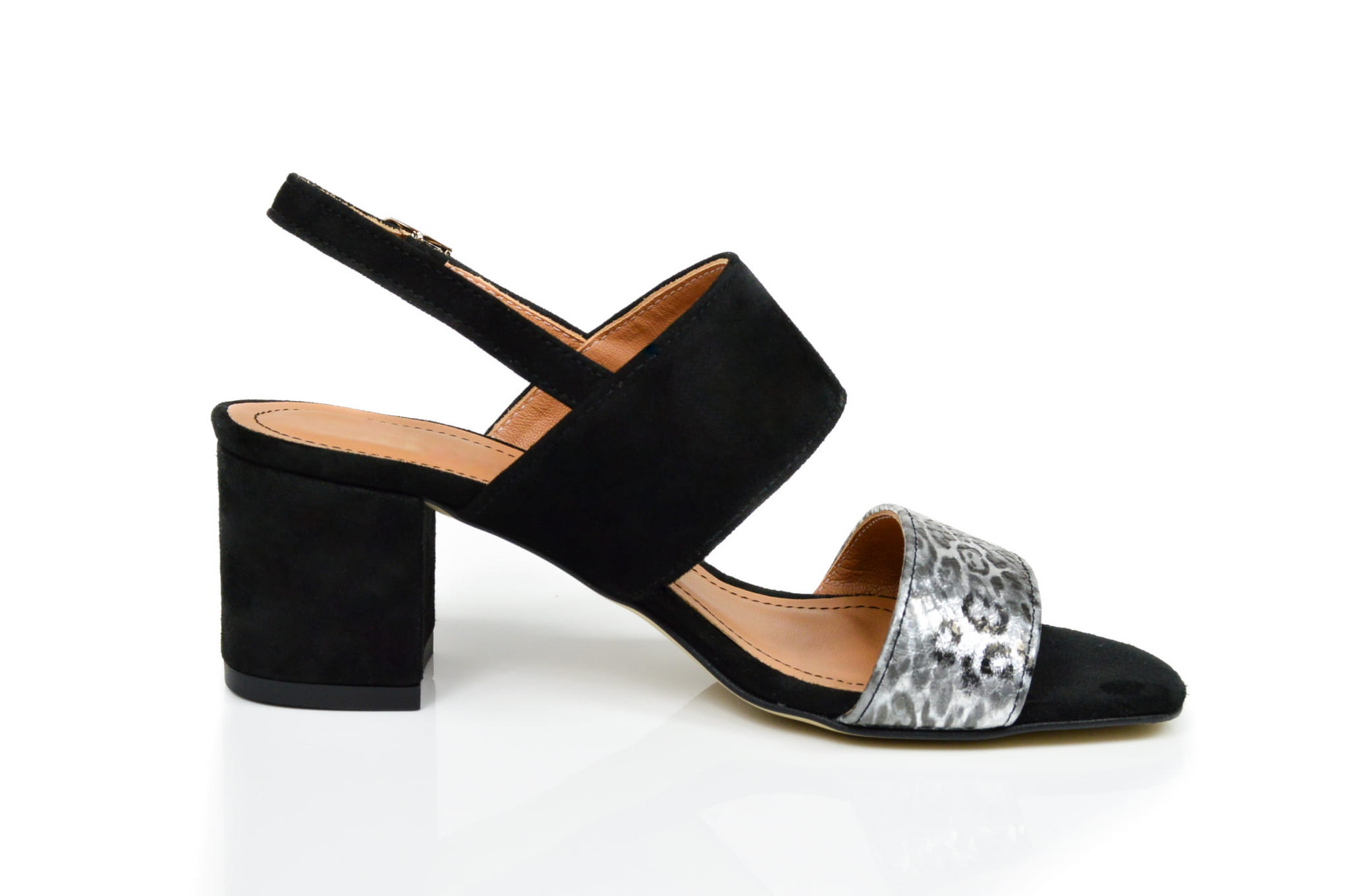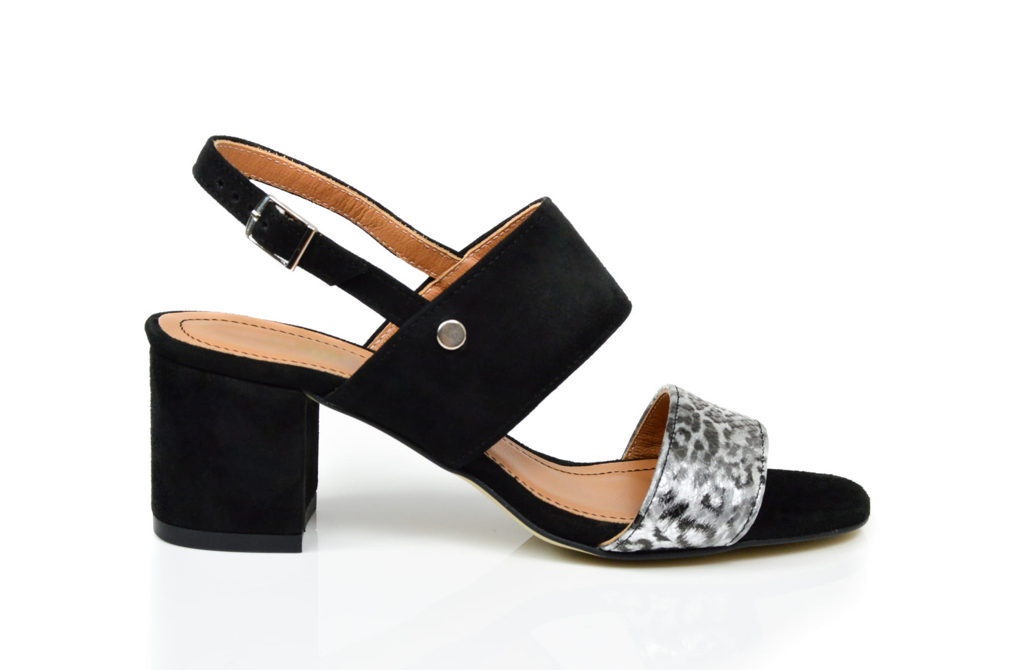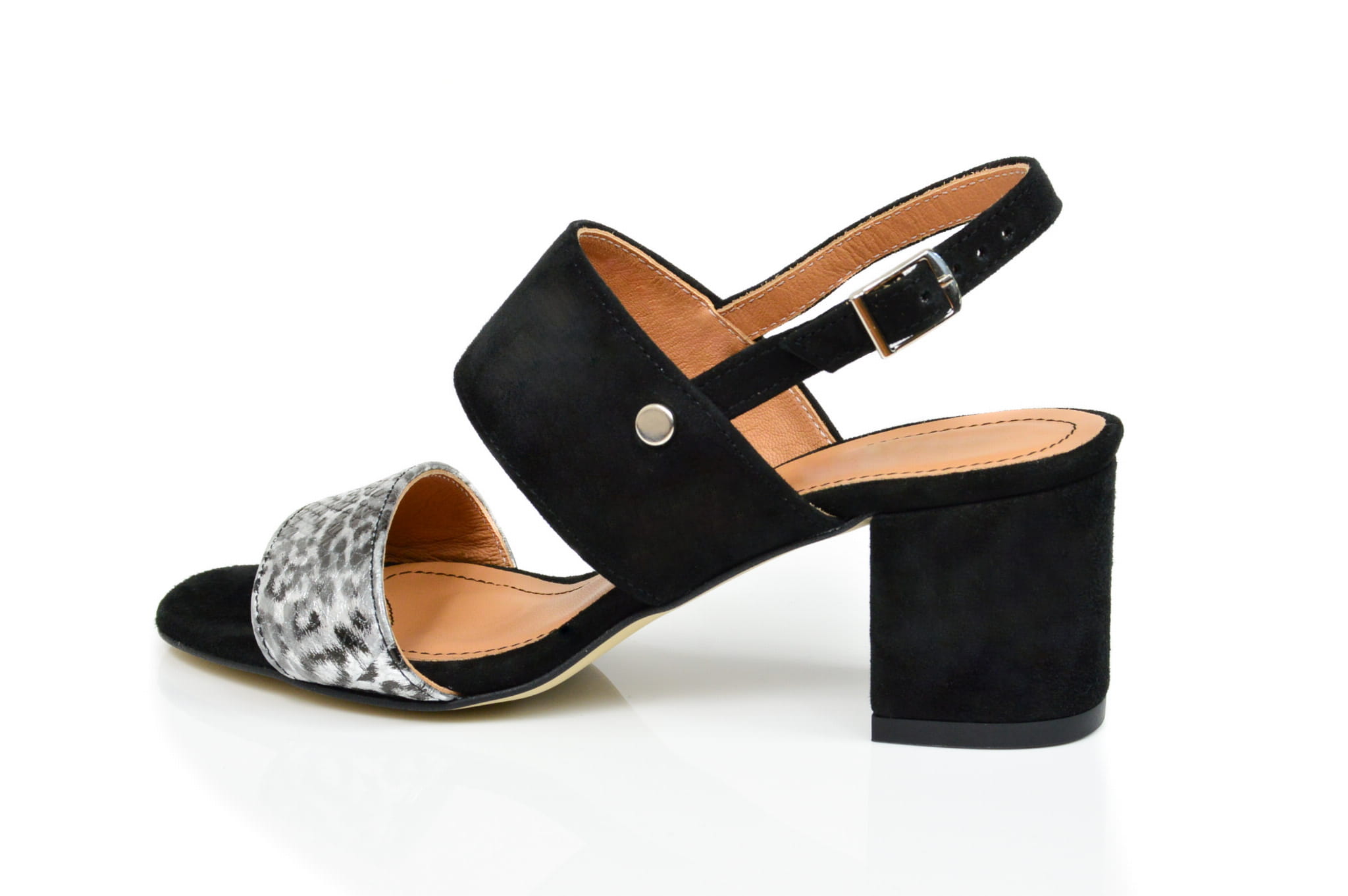 Czarno- srebrne sandałki damskie, wykonane ze skóry naturalnej: zamszowej, w butach zastosowano obcas typu klocek wysokości: 5,5 cm. Sandałki zapinane wokół kostki na klamerkę.