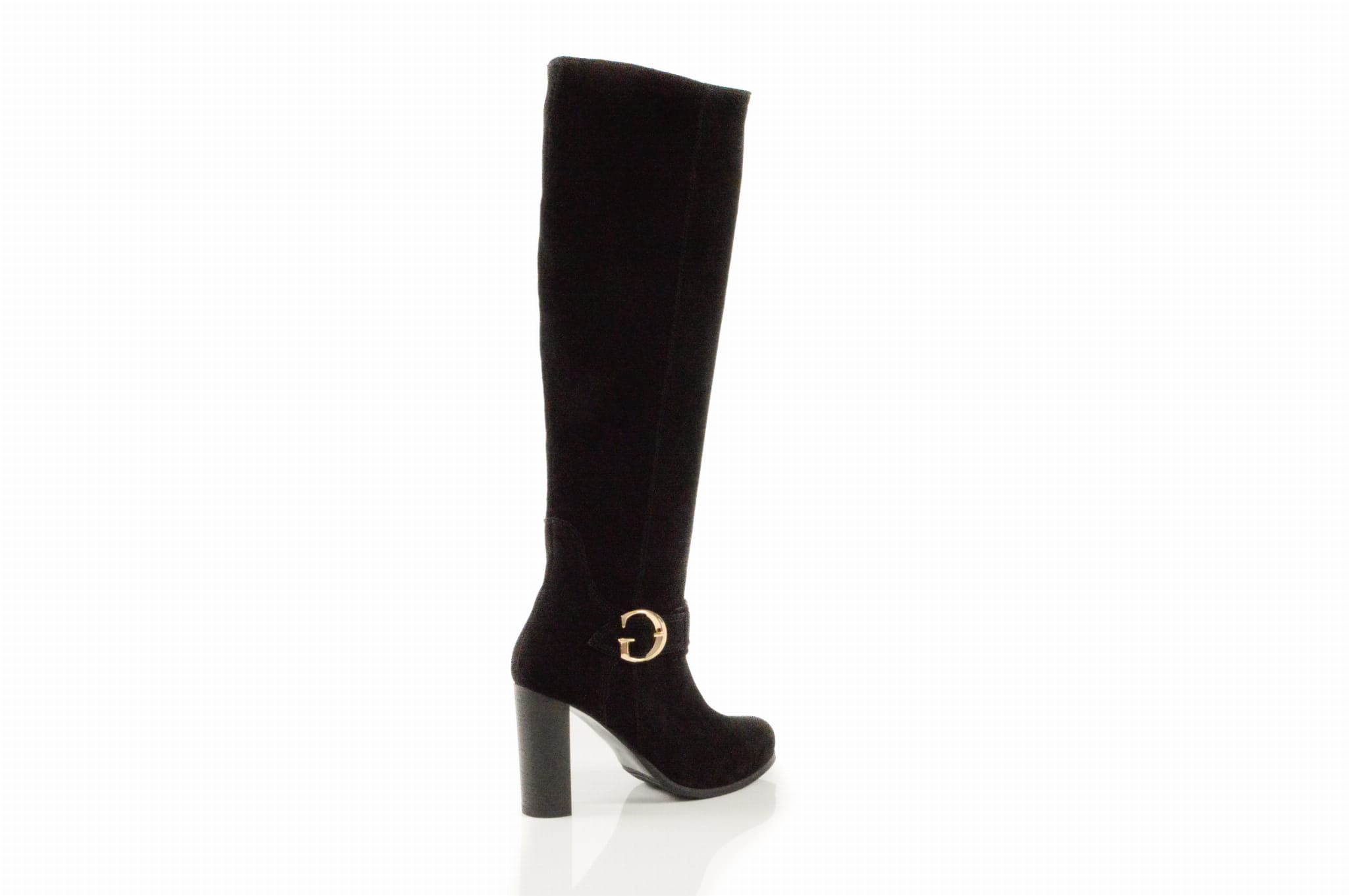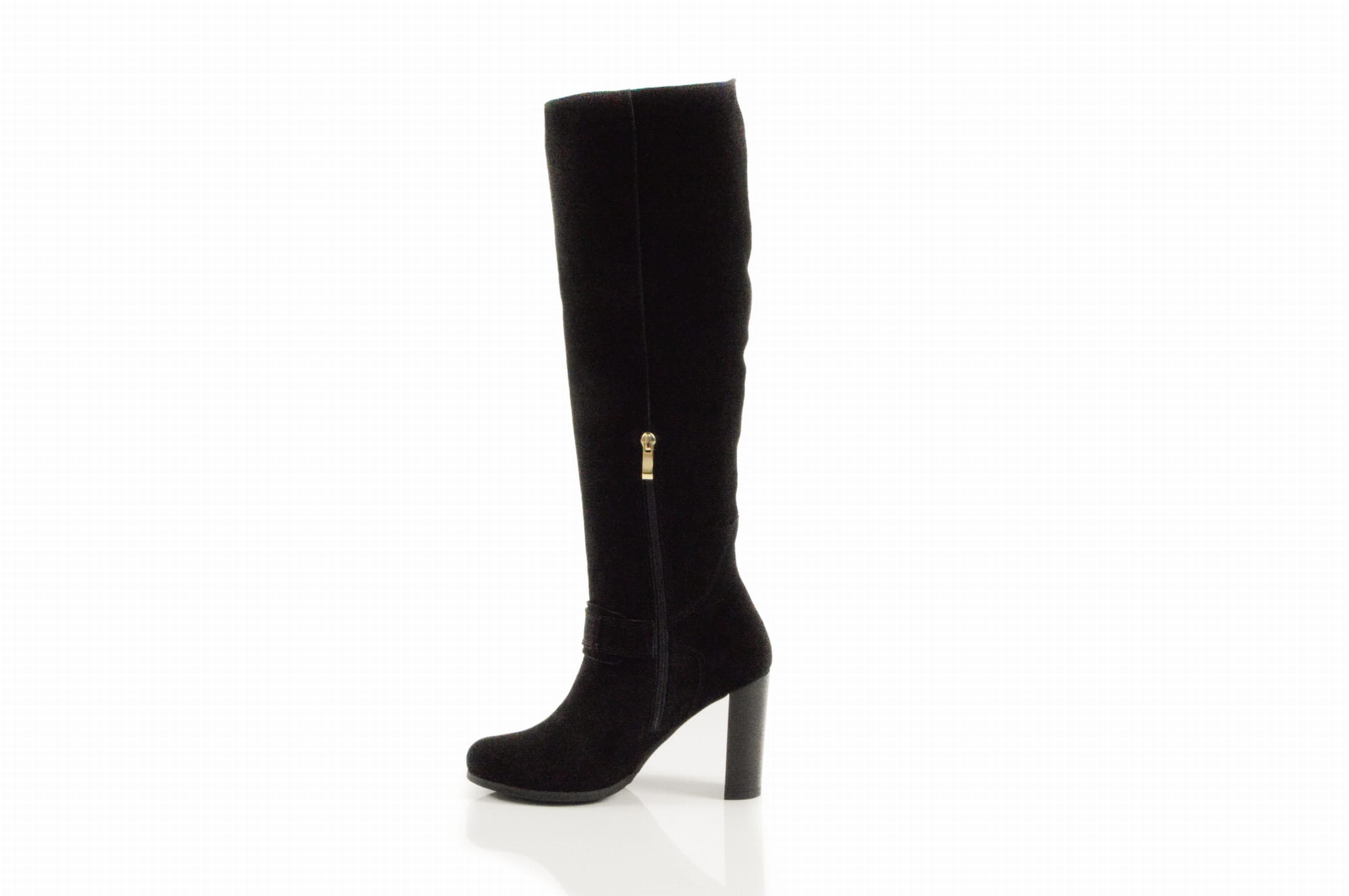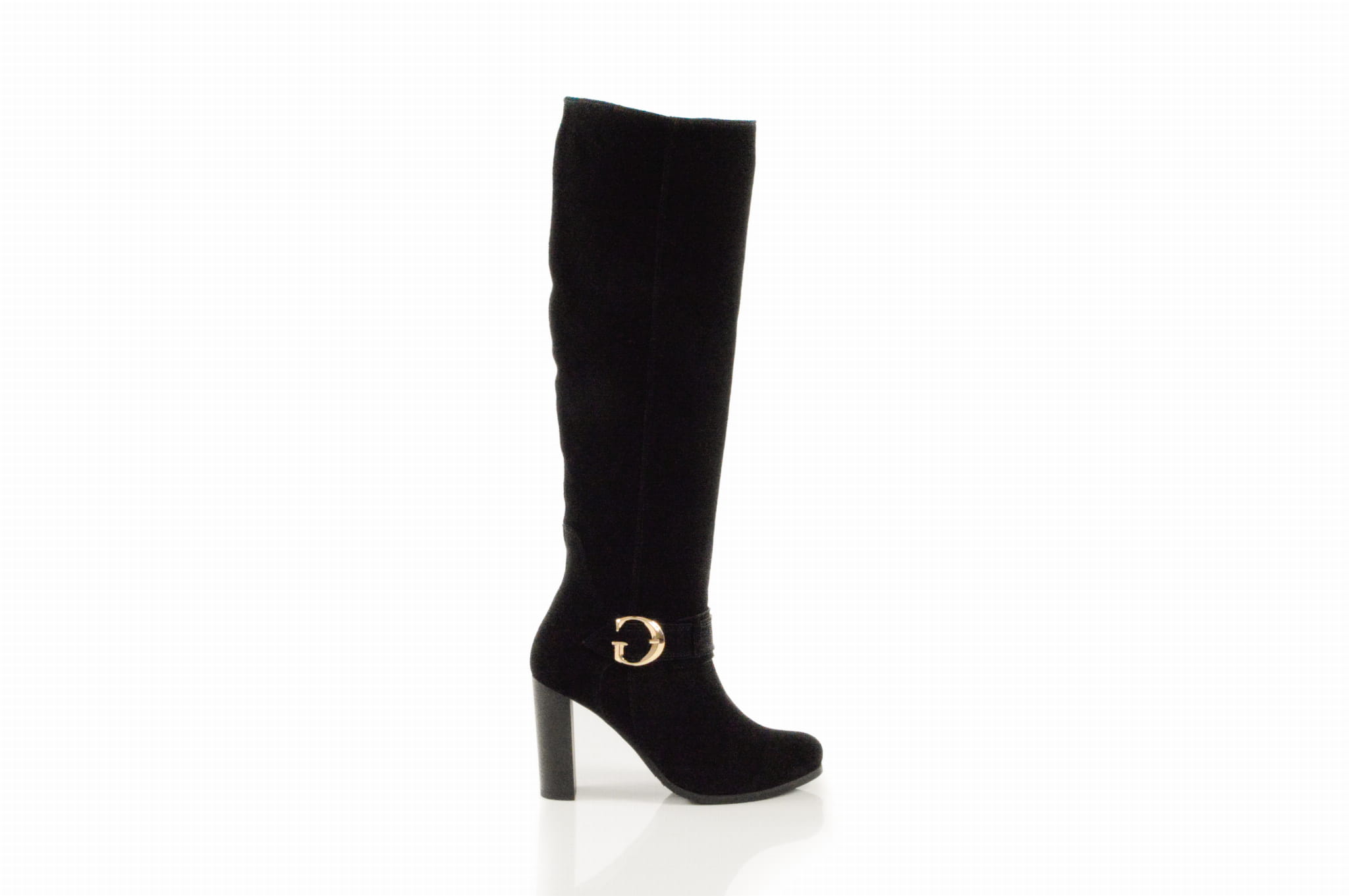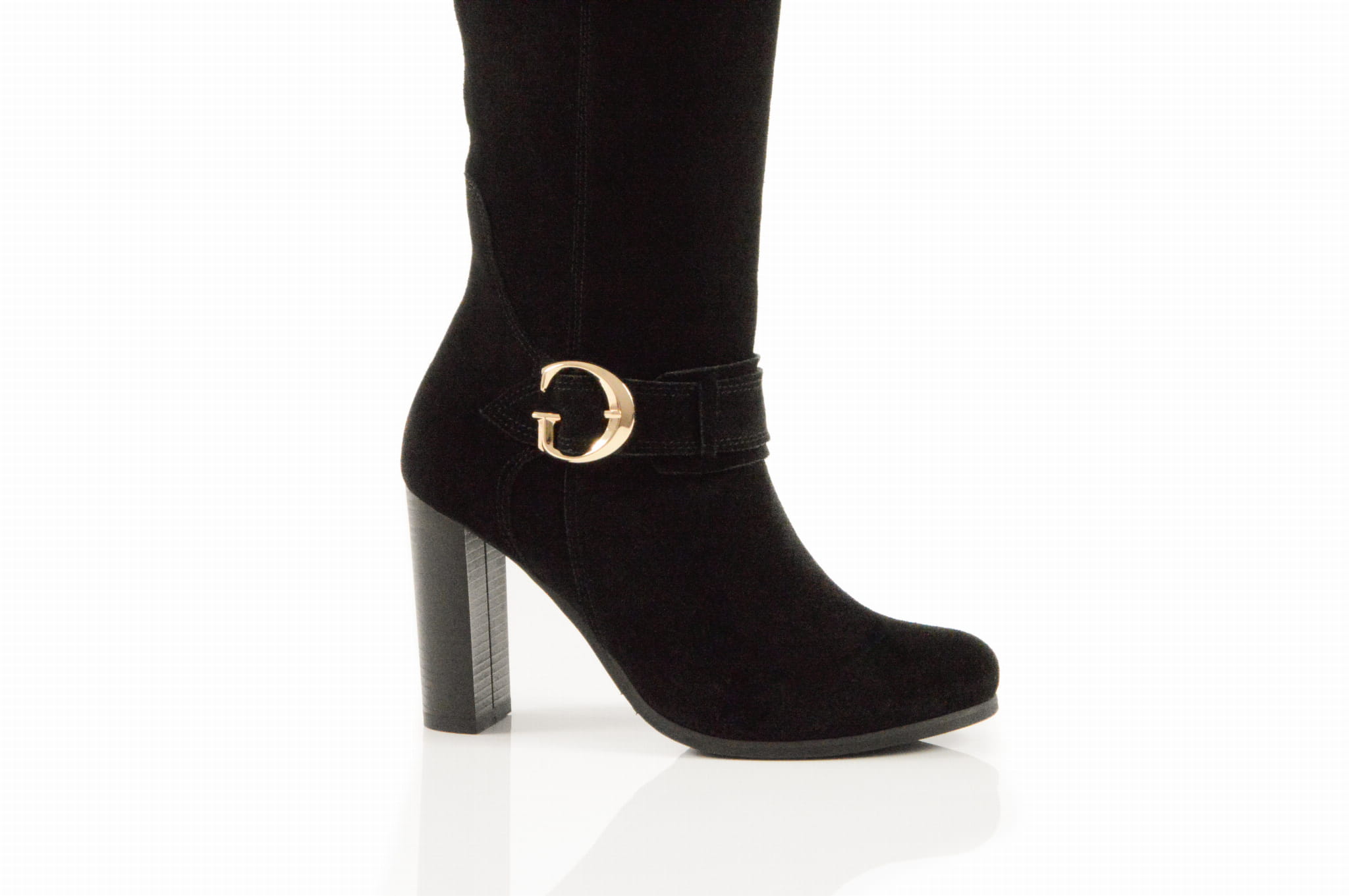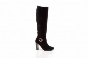 Czarne welurowe kozaki na obcasie słupku złota klamra skóra naturalna