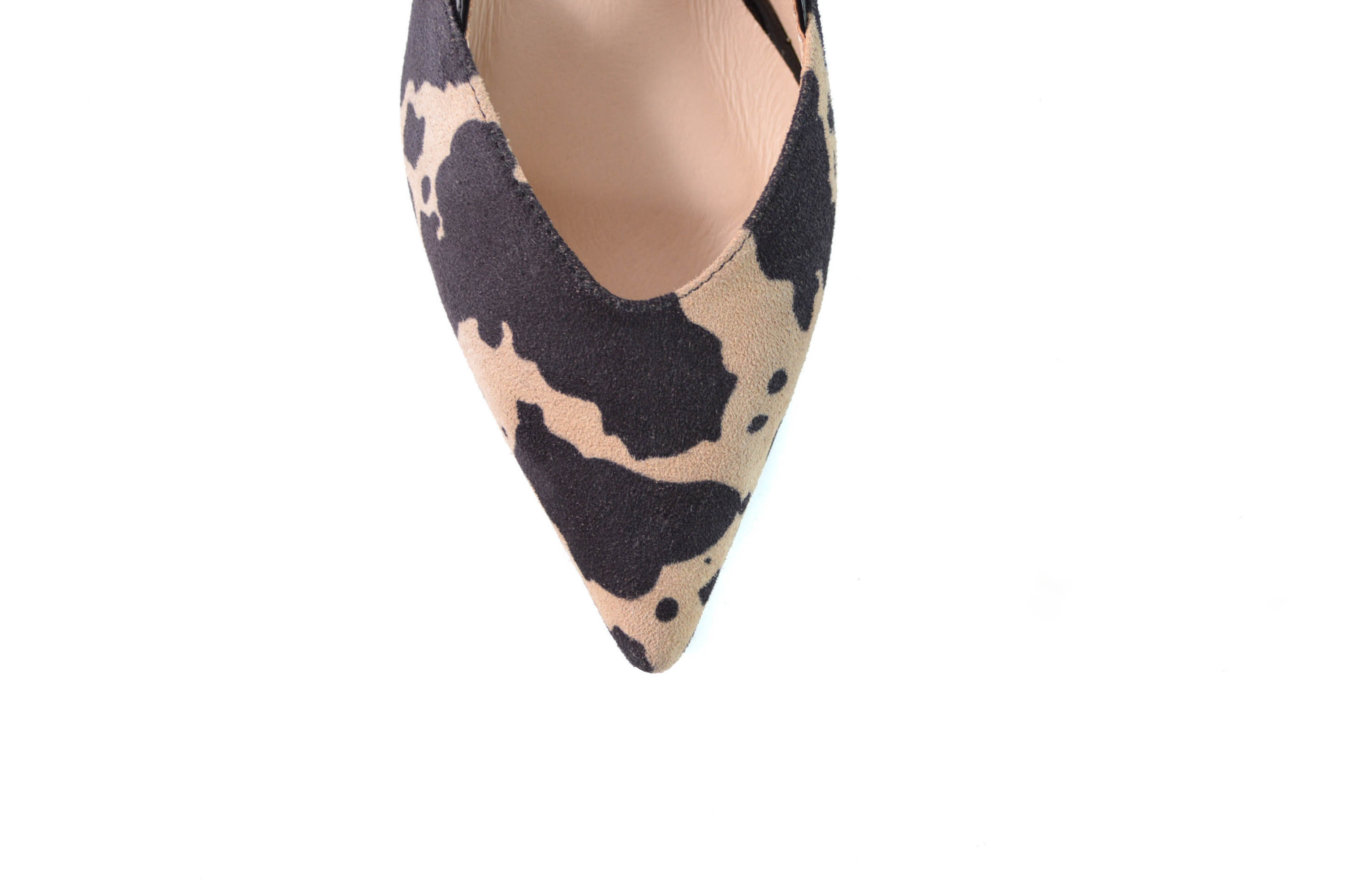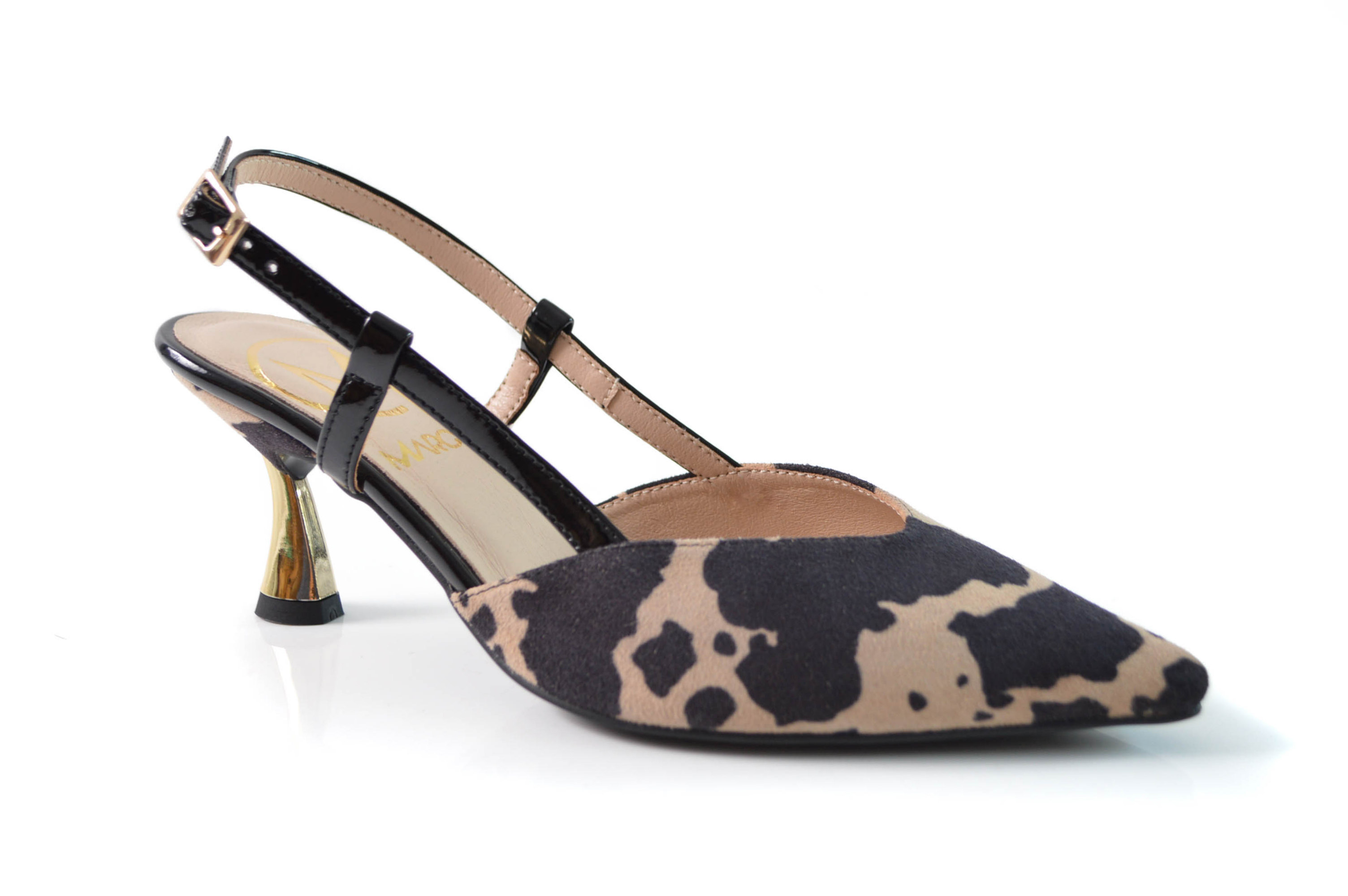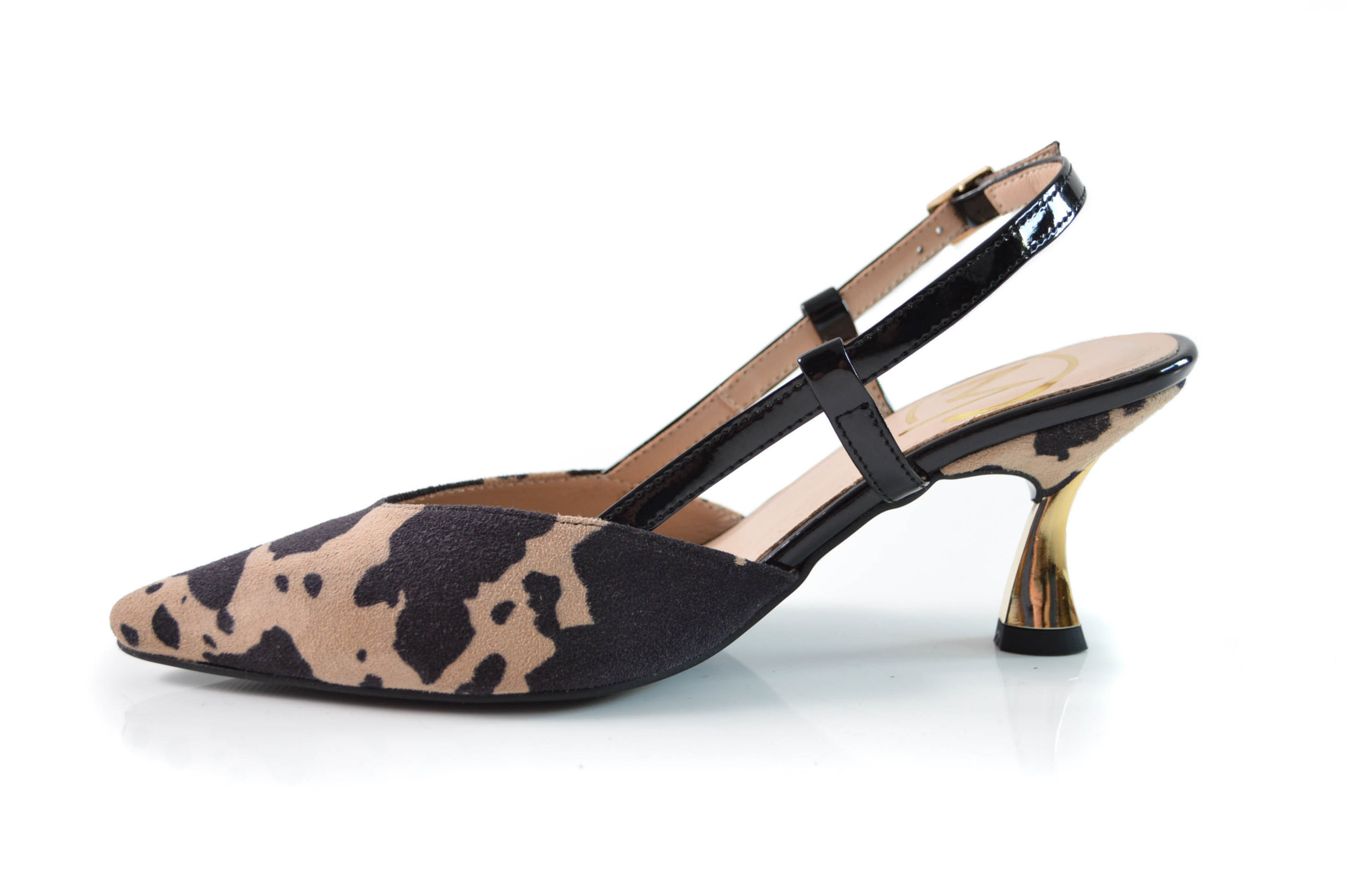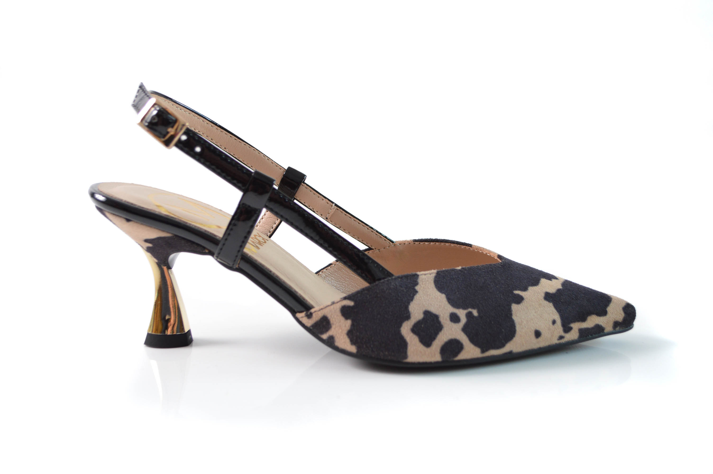 Te czarno-beżowe czółenka damskie z odkrytą piętą to propozycja dla kobiet, które lubią łączyć klasyczną elegancję z odważnym, modowym akcentem. Model wyróżnia się efektownym wzorem w centki inspirowanym motywem „krowy”, który przyciąga spojrzenia i nadaje stylizacji unikalnego charakteru. Wykonane z naturalnej skóry zamszowej, zachwycają miękką fakturą oraz starannym wykończeniem.