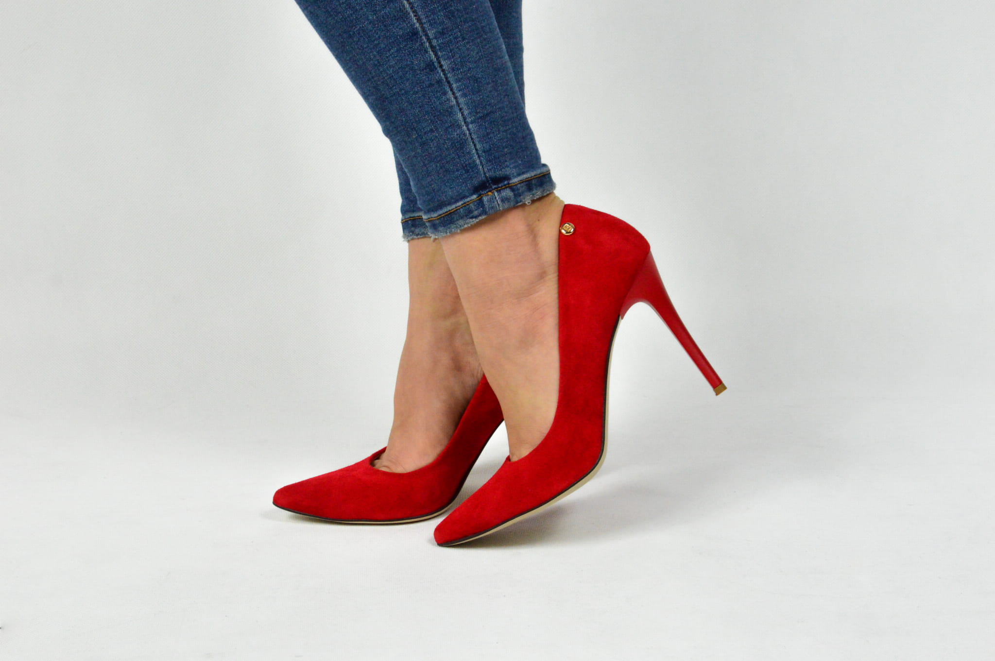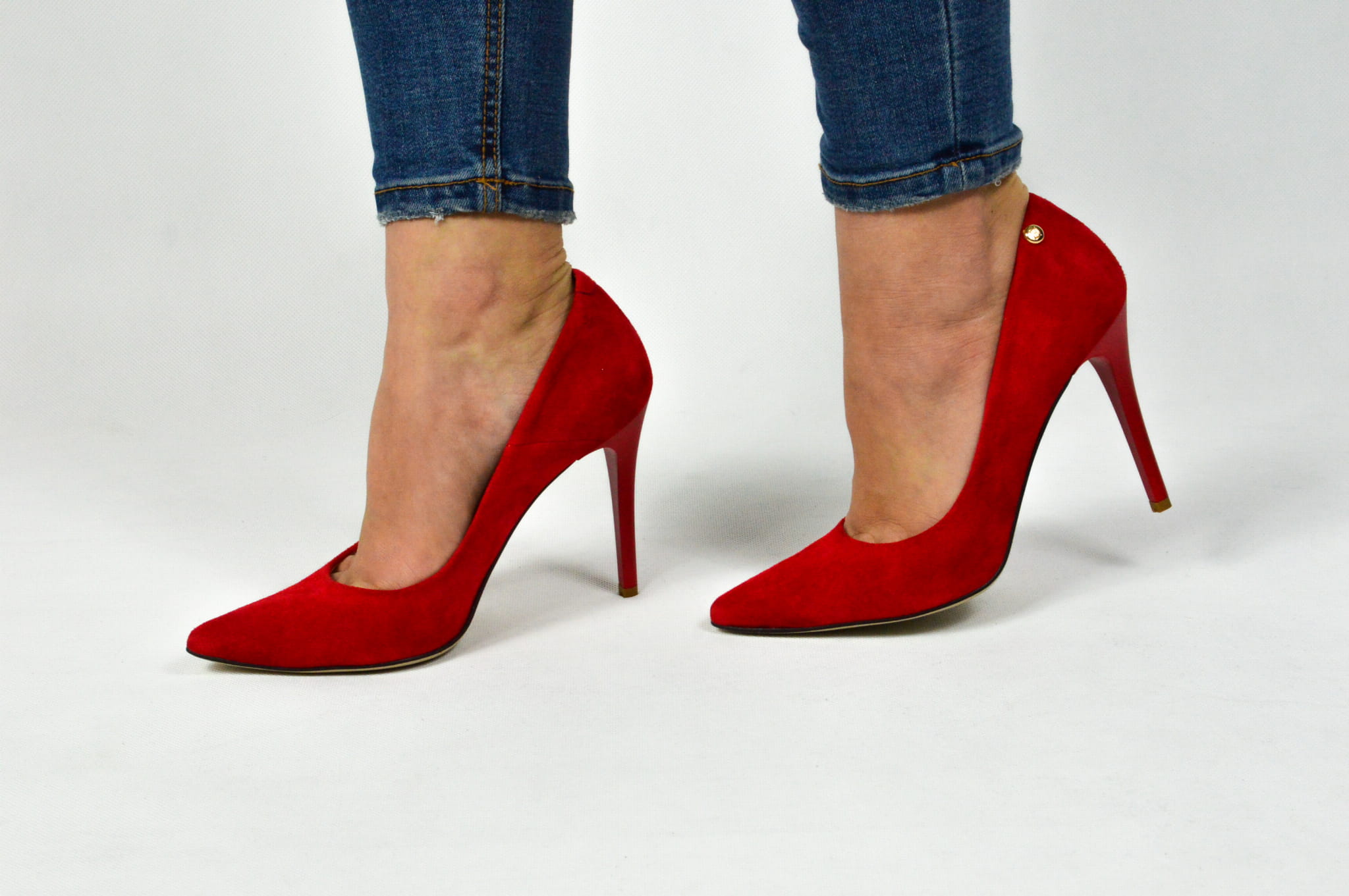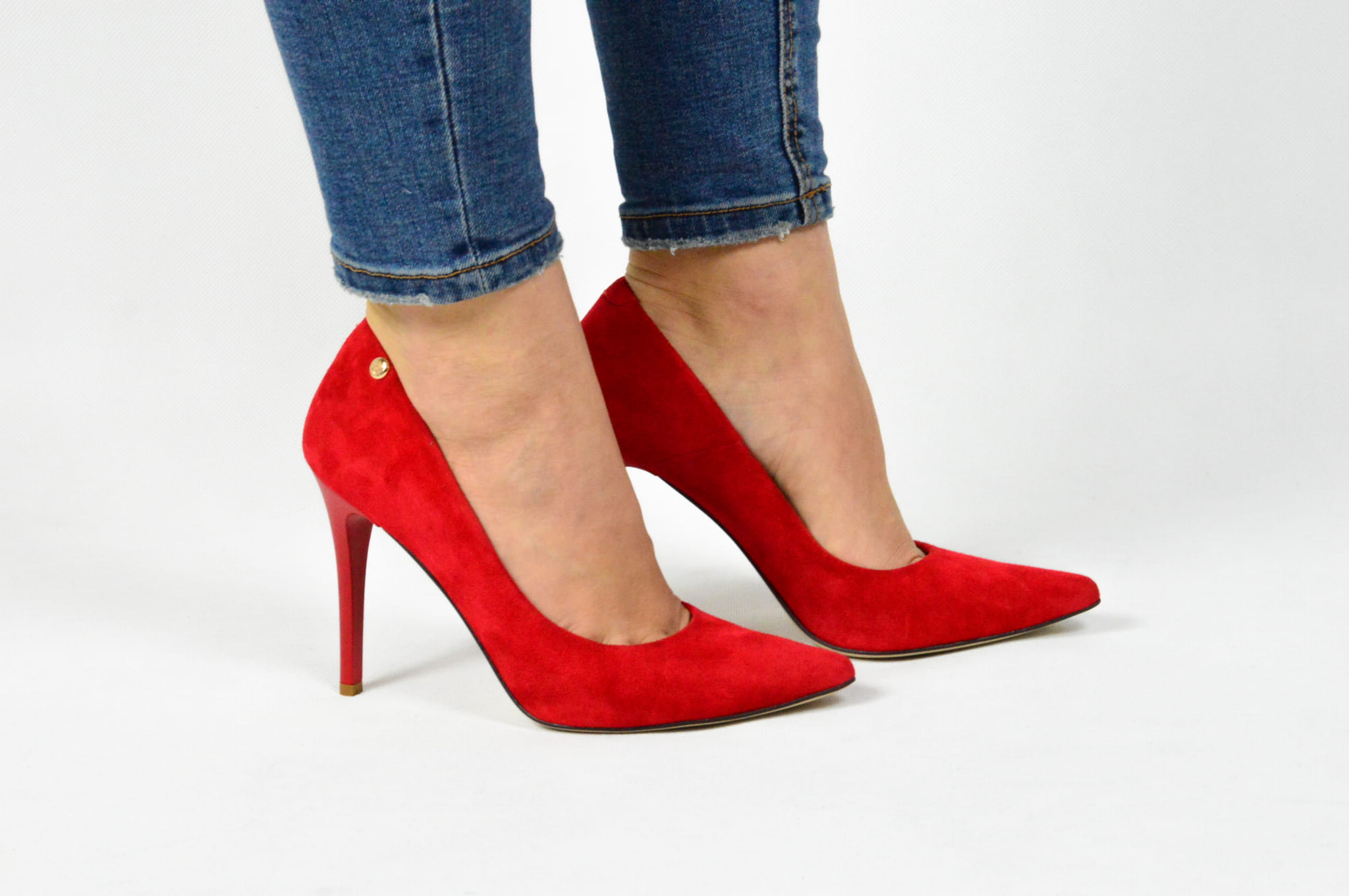 Czerwone czółenka skórzane zamszowe na szpilce
