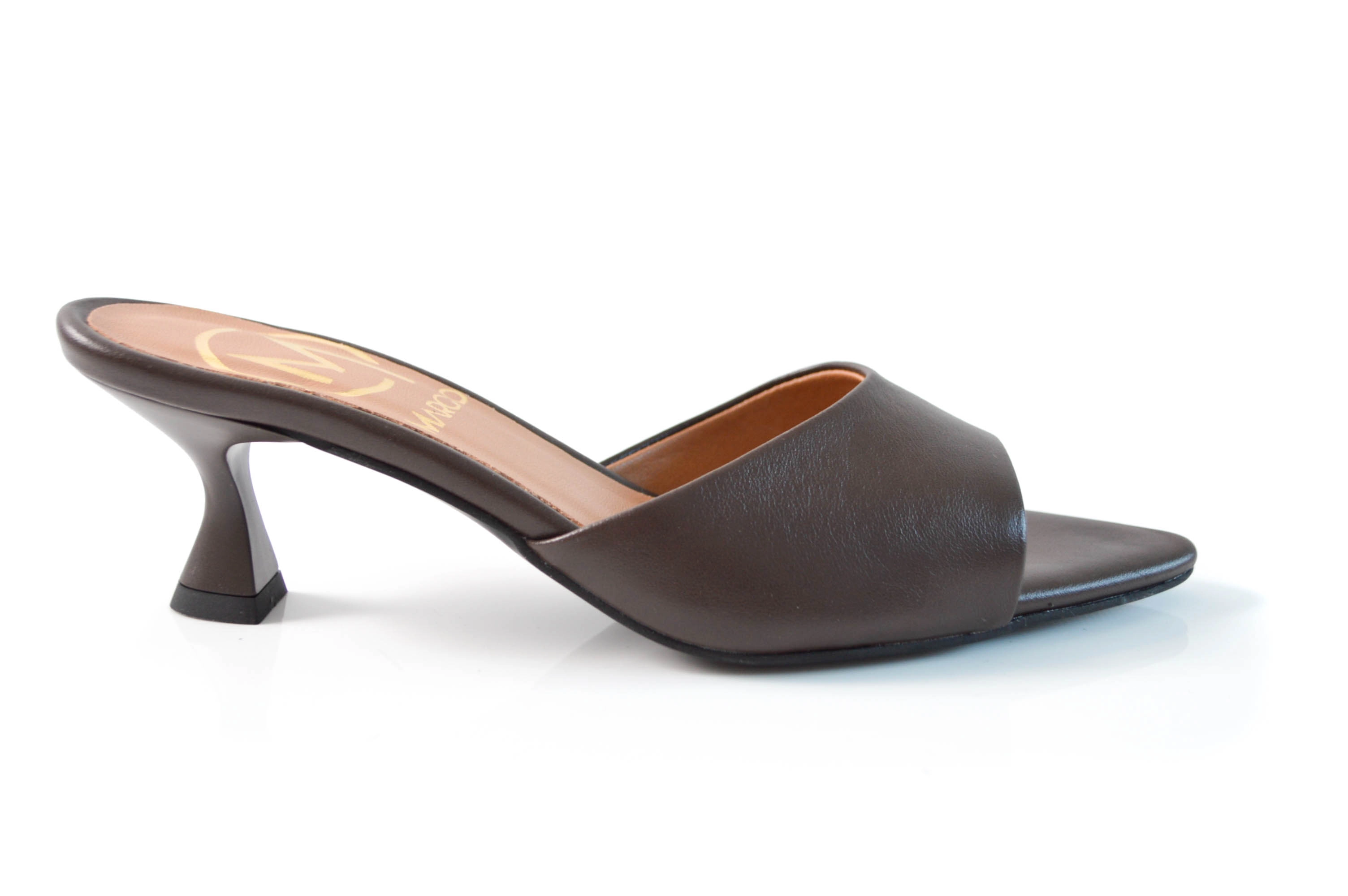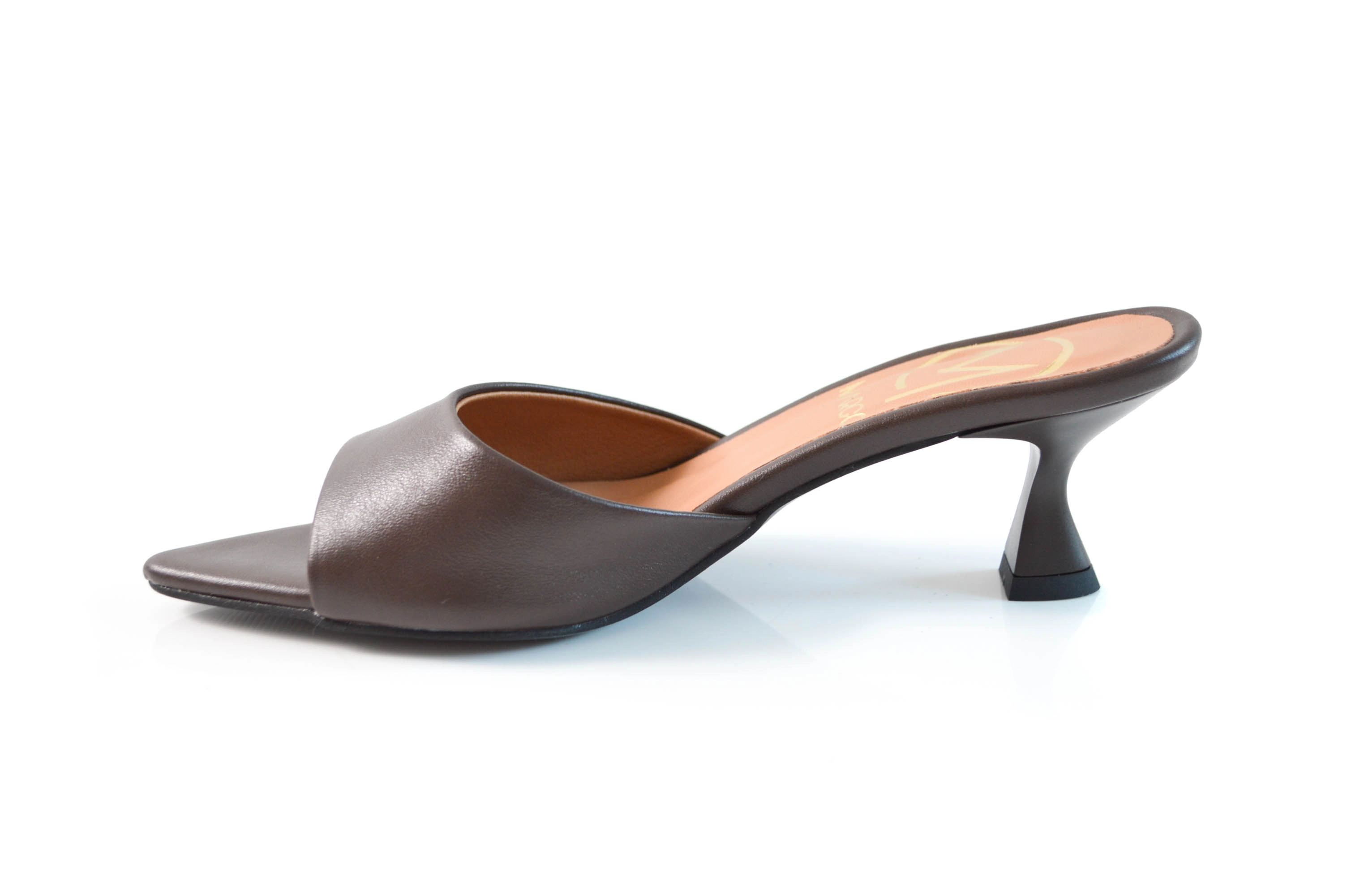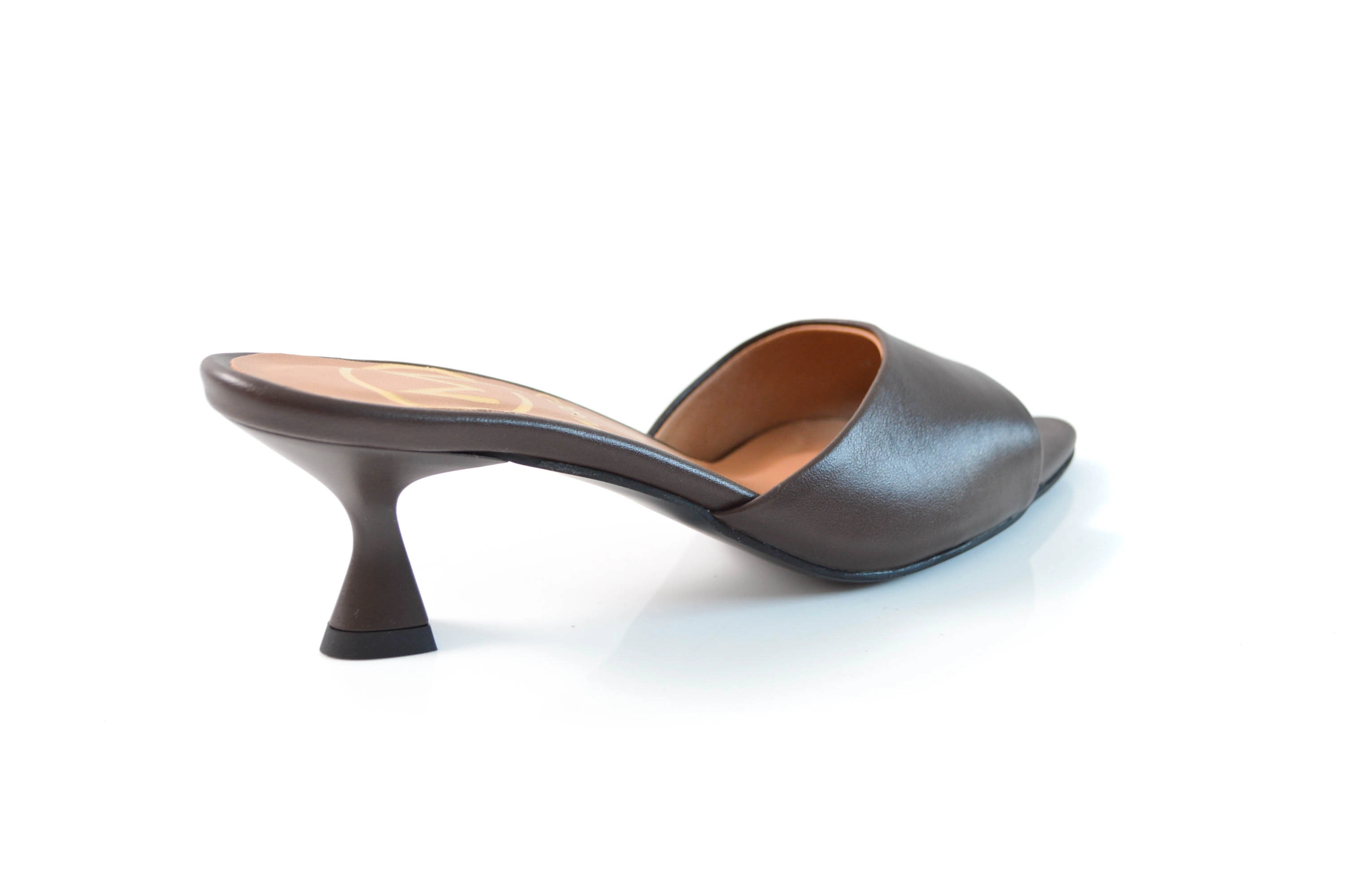 Skórzane klapki na niskiej szpilce w kolorze czekoladowego brązu – elegancja w głębokim, szlachetnym odcieniu