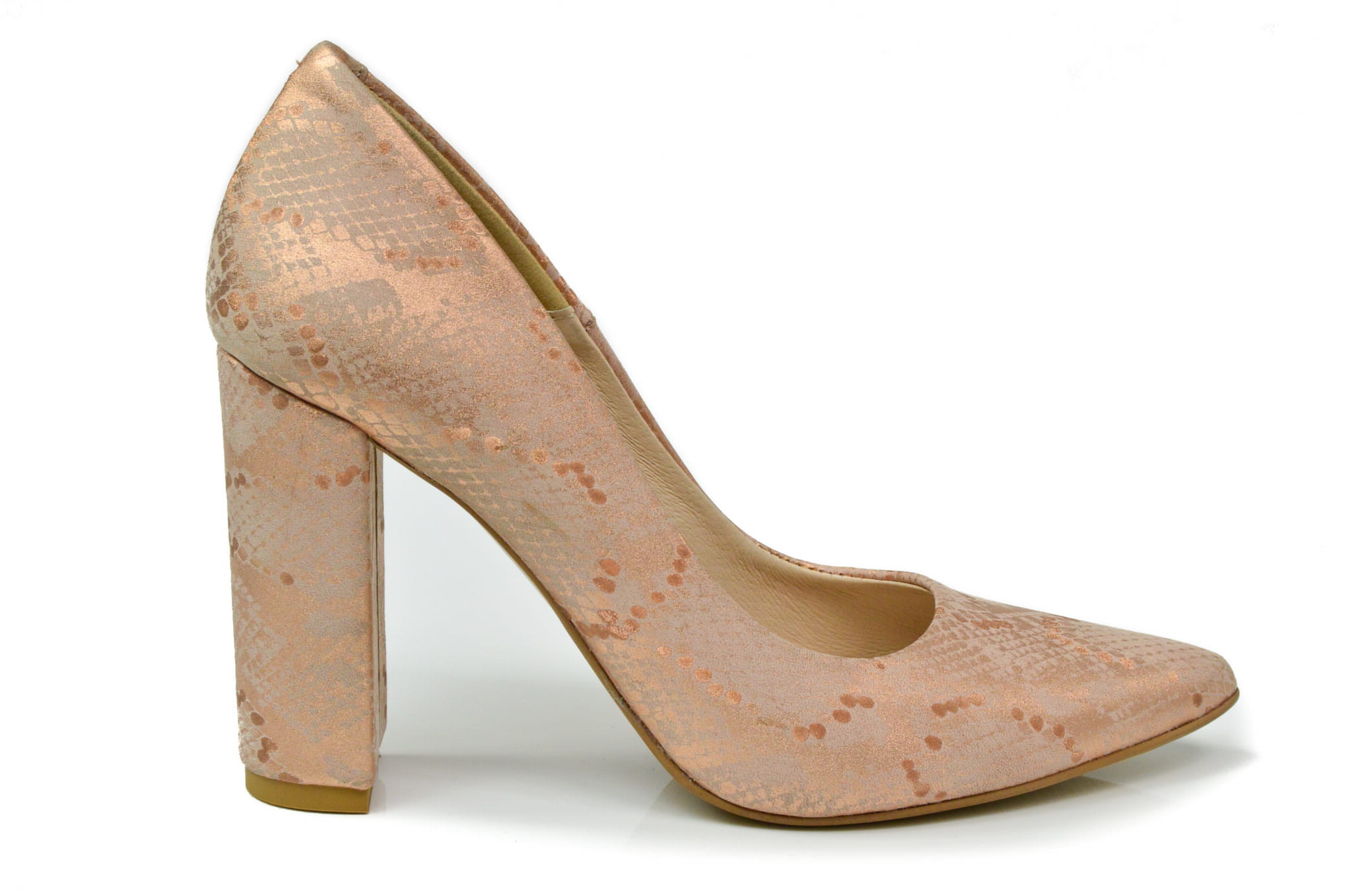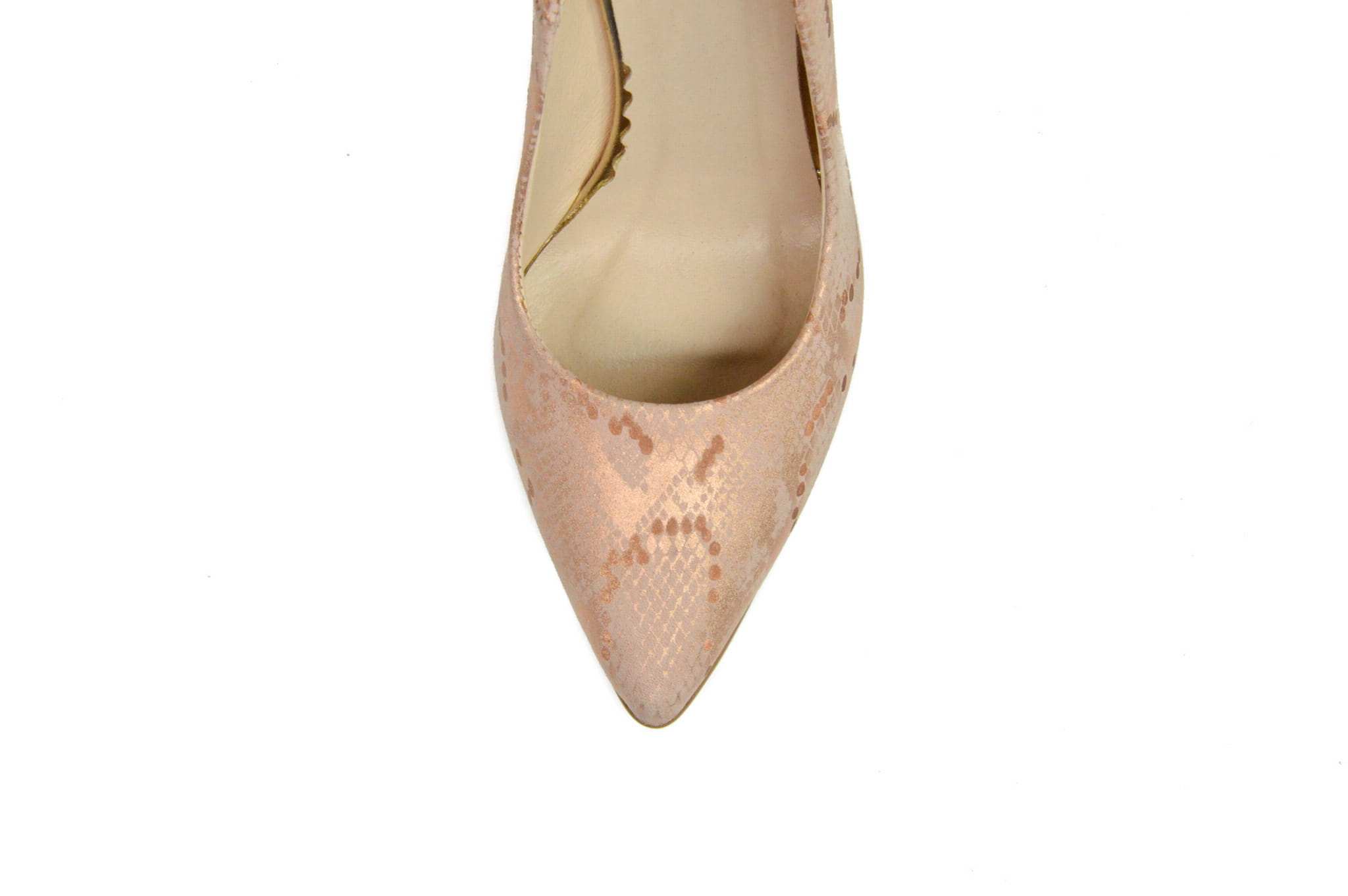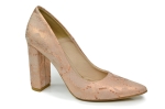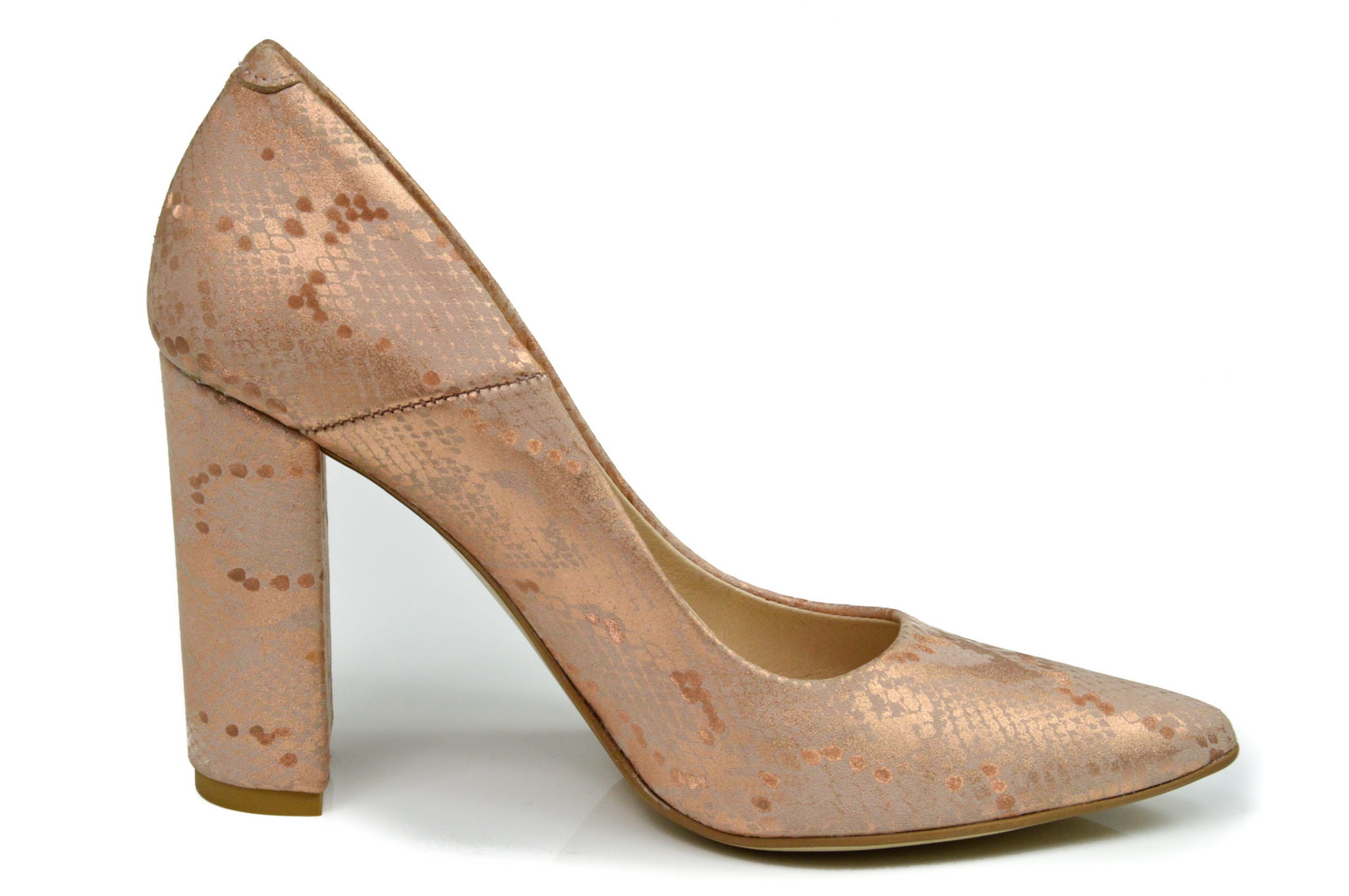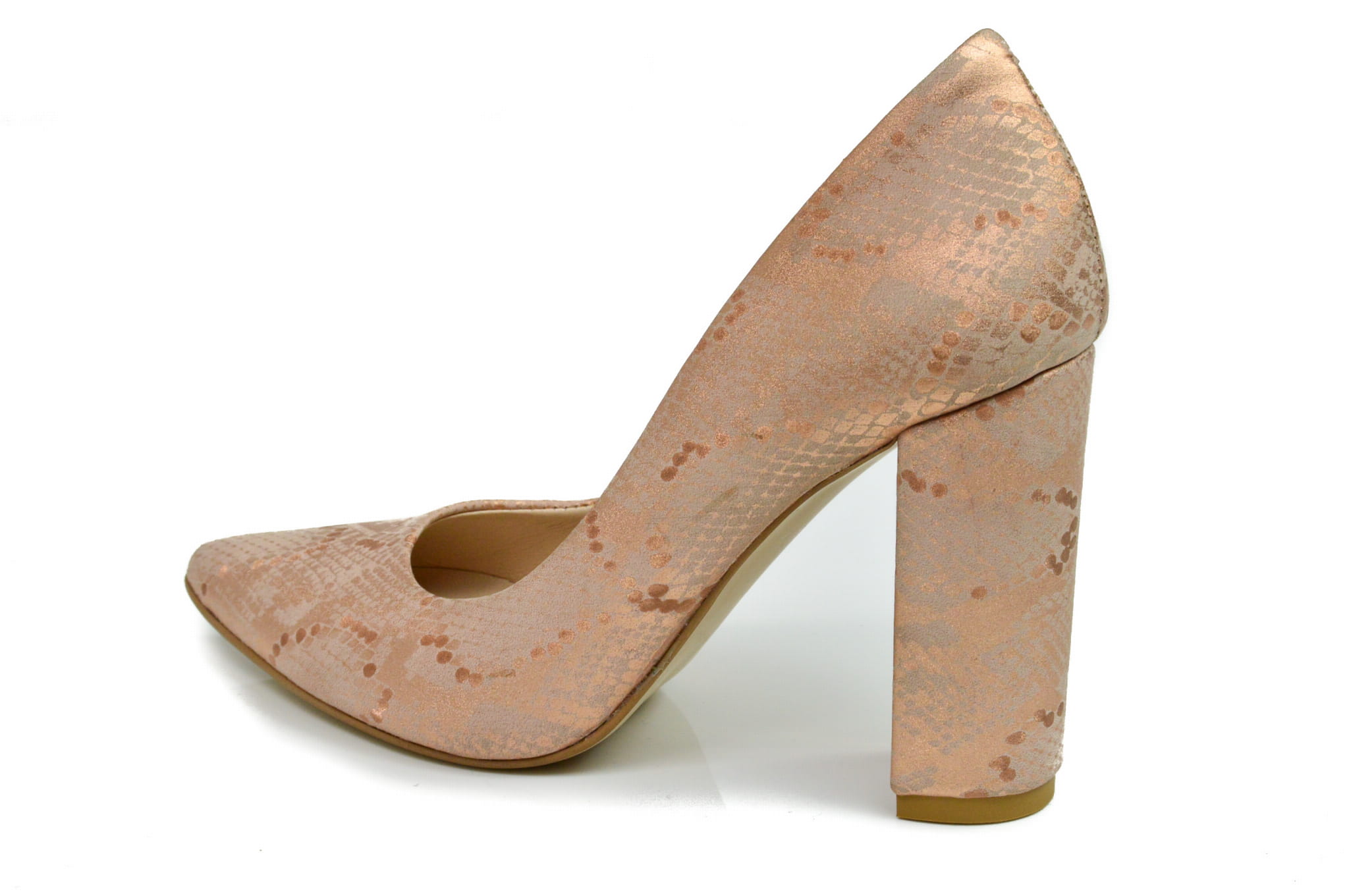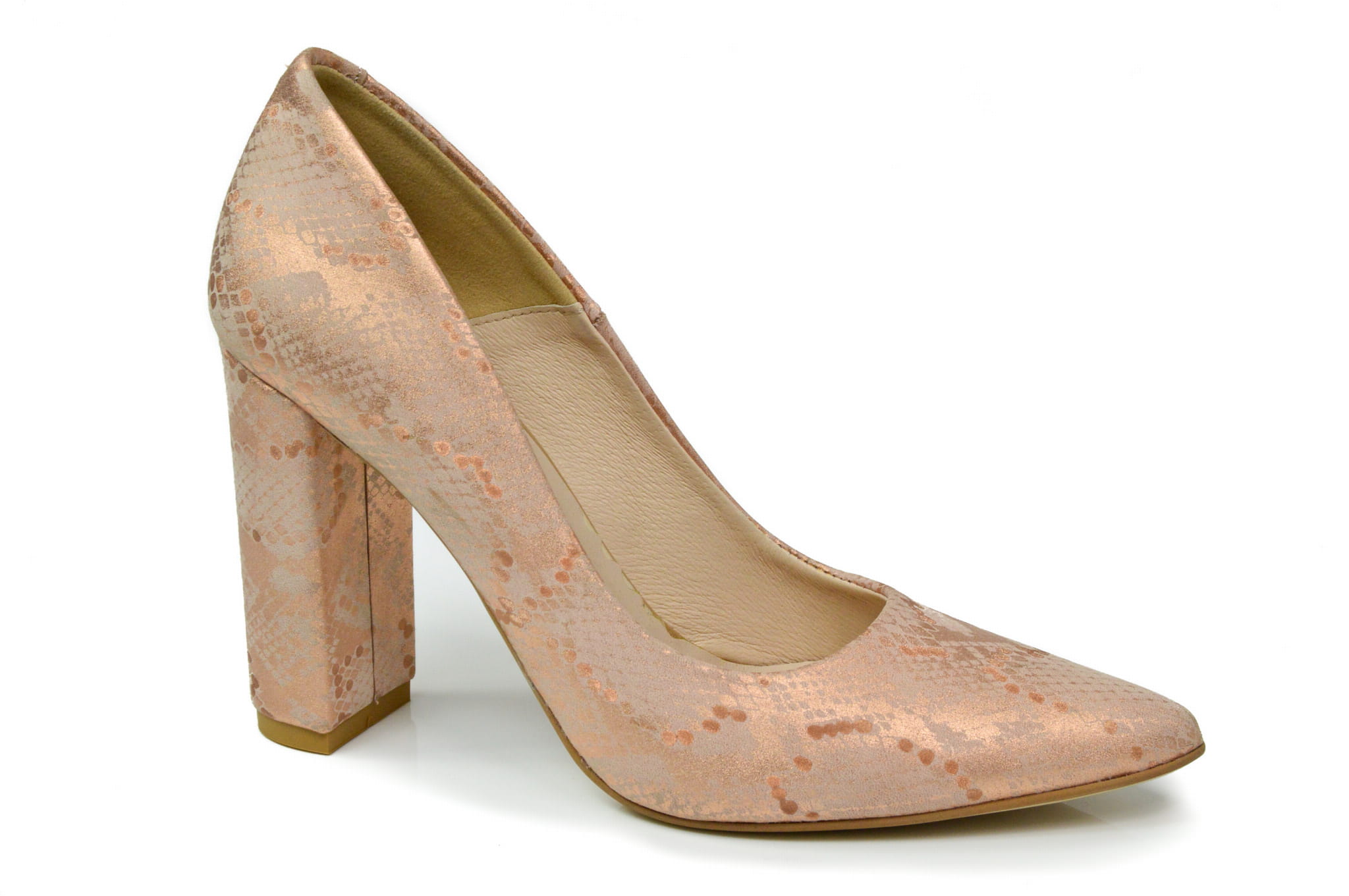 Łososiowe czółenka damskie, wykonane ze skóry naturalnej z motywem węża. Buty polskiej produkcji marki MargoShoes. W szpilkach zastosowano smukły, stabilny obcas typu- słupek o wysokości 9 cm, kształt czubka- ostry.