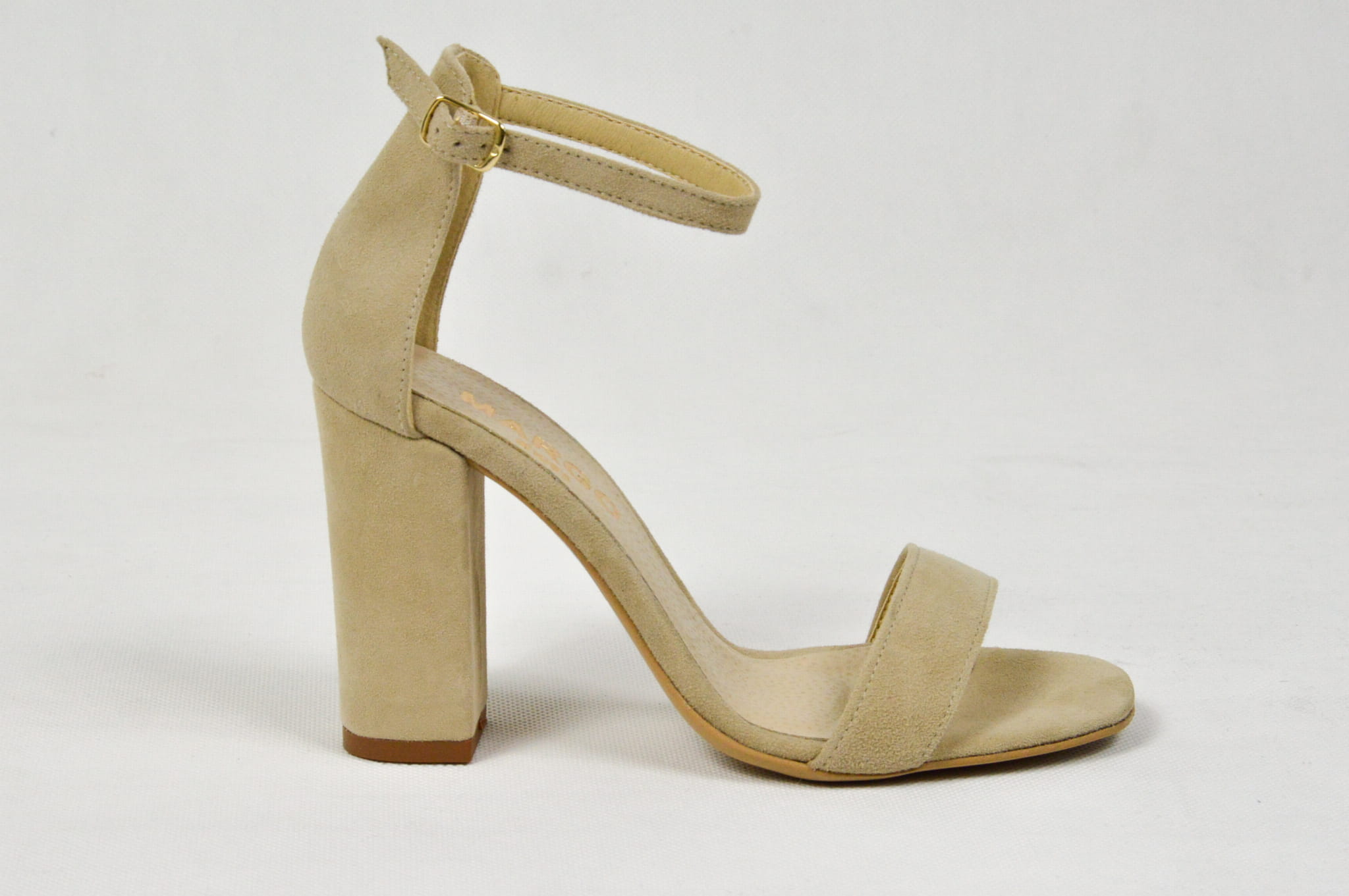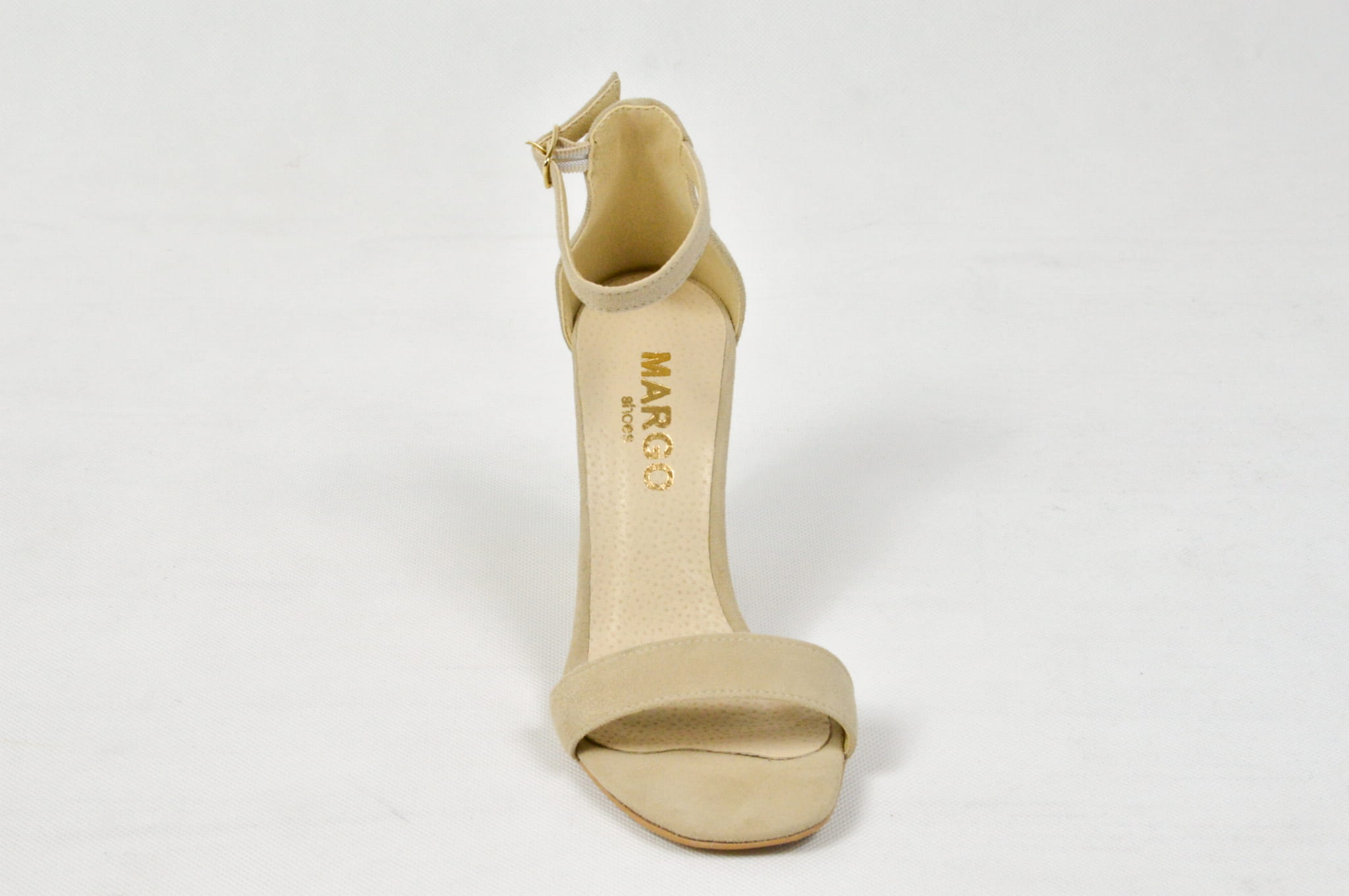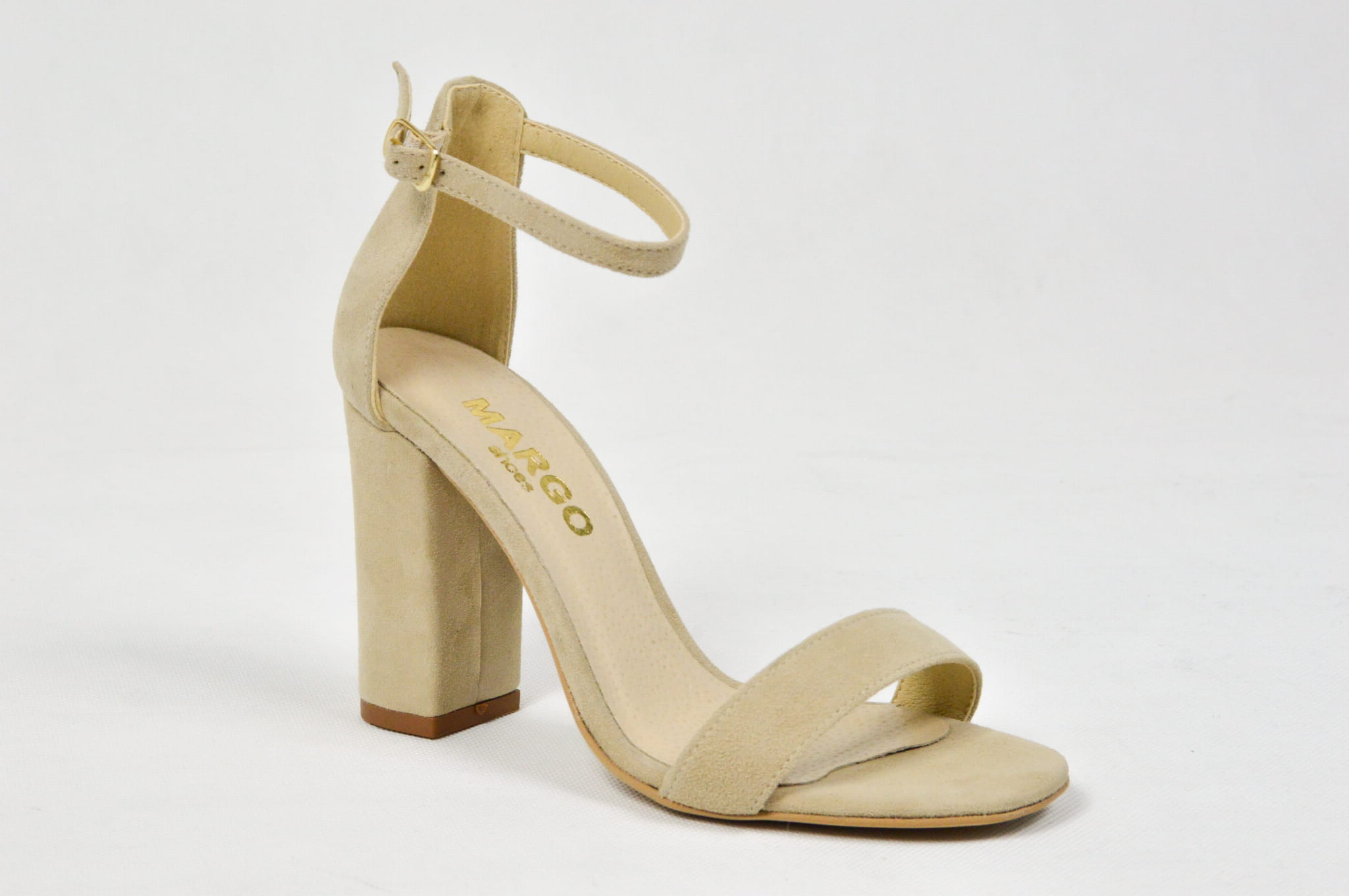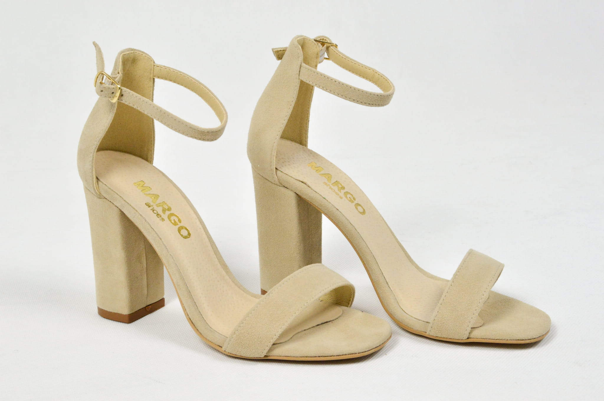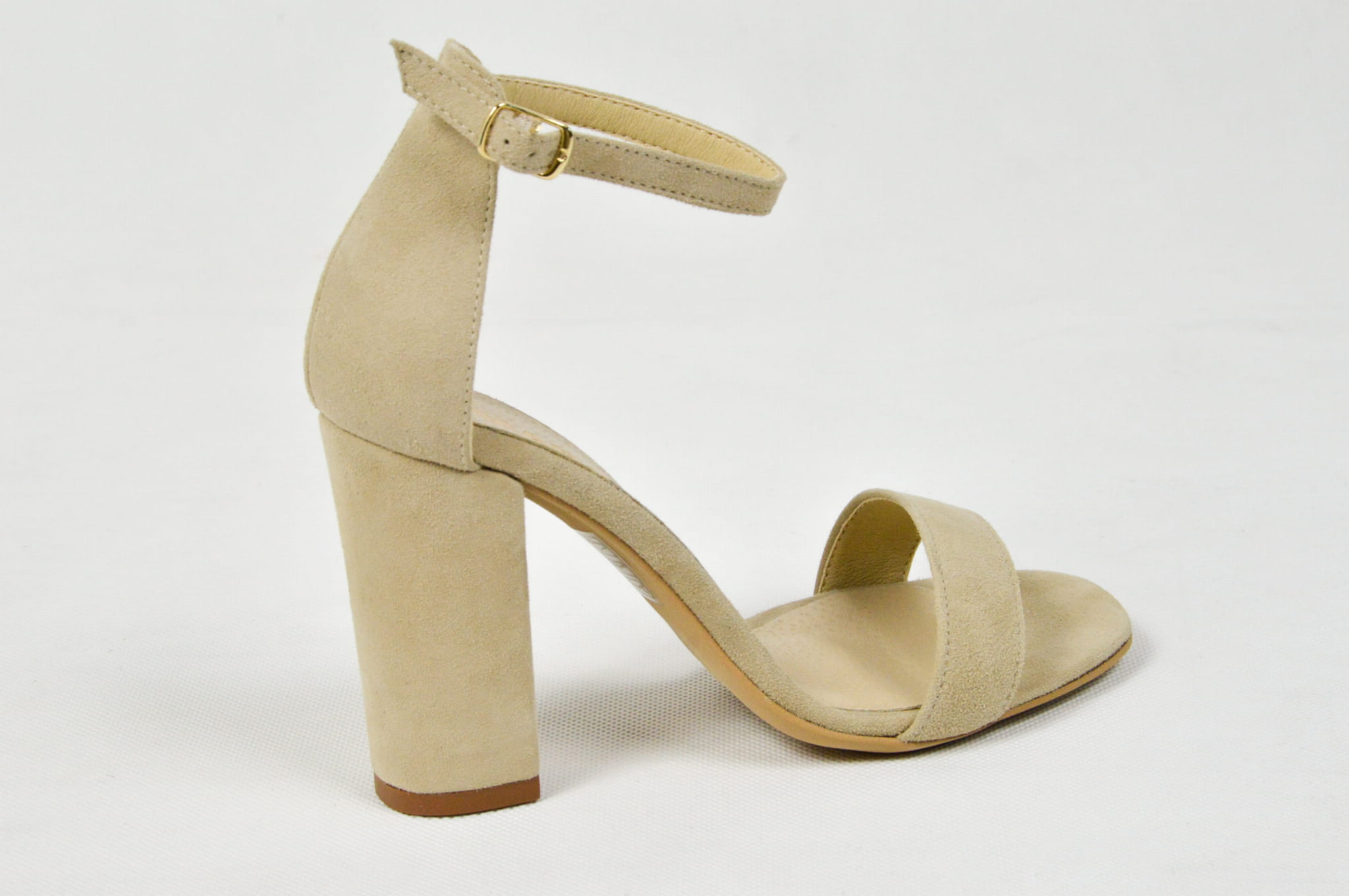 MargoShoes beżowe zamszowe sandałki na obcasie słupku zapinane wokół kostki skóra naturalna