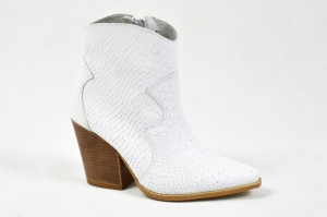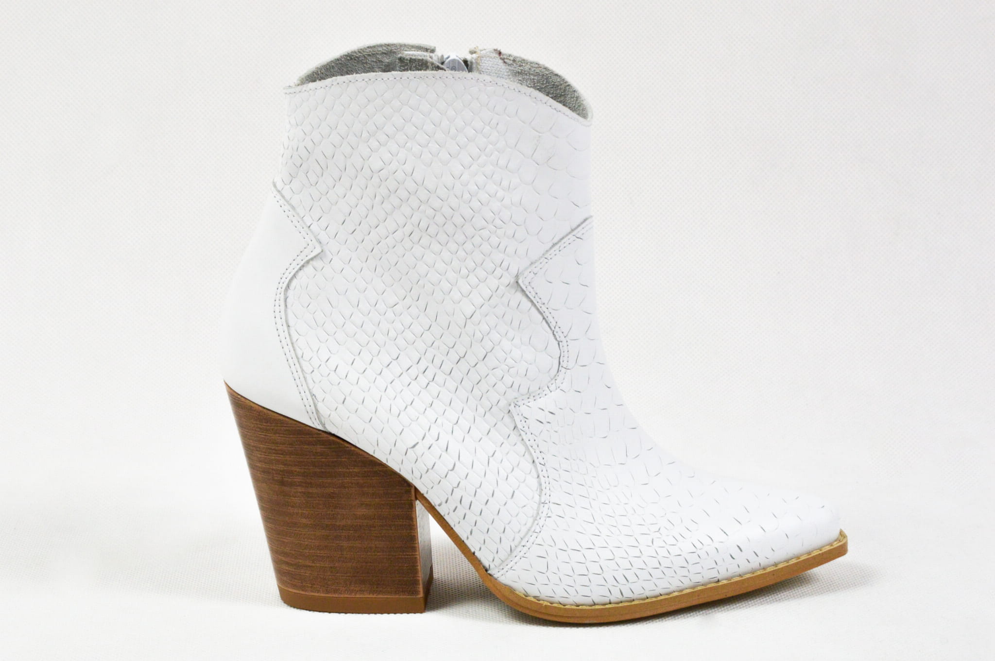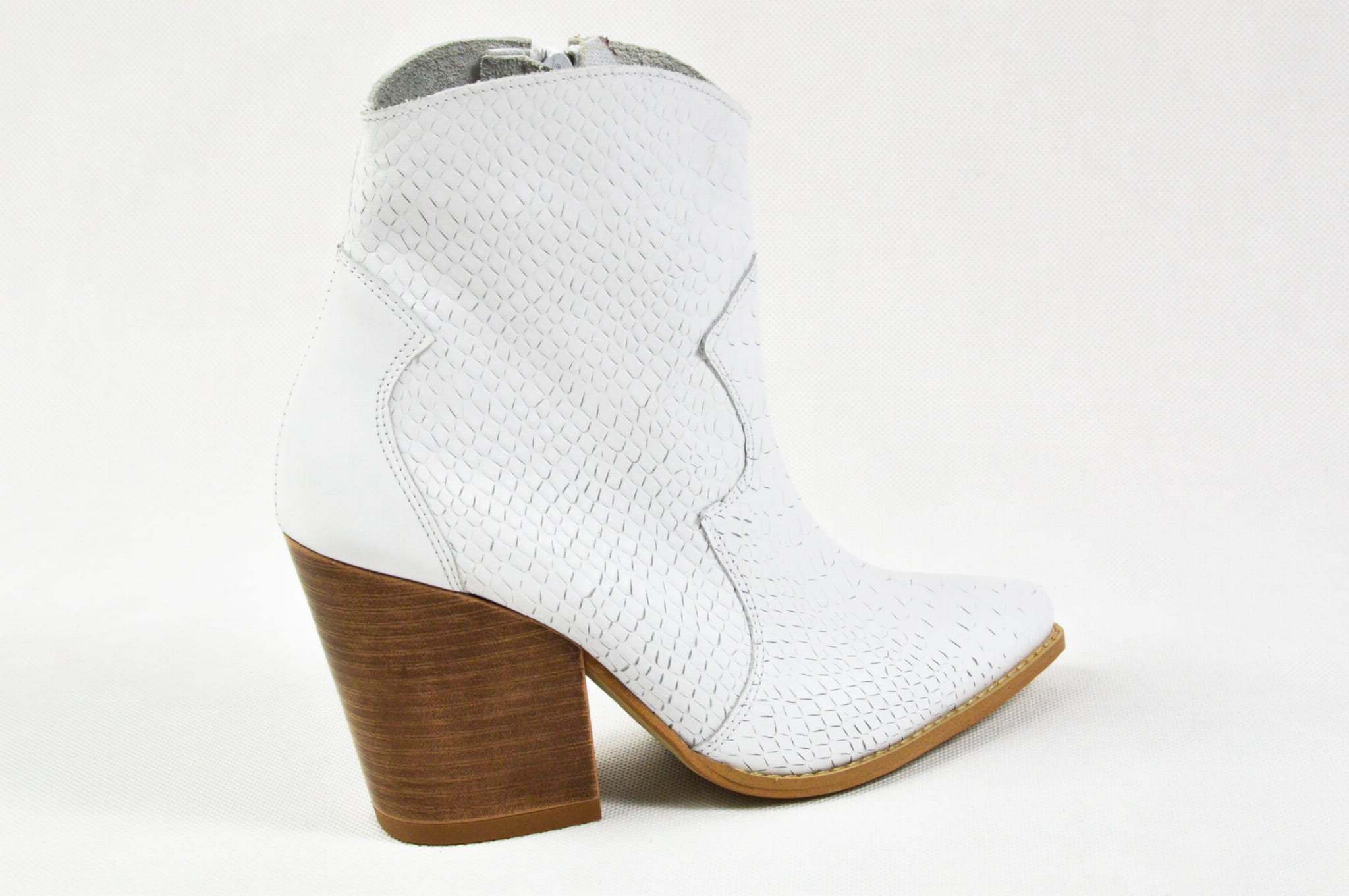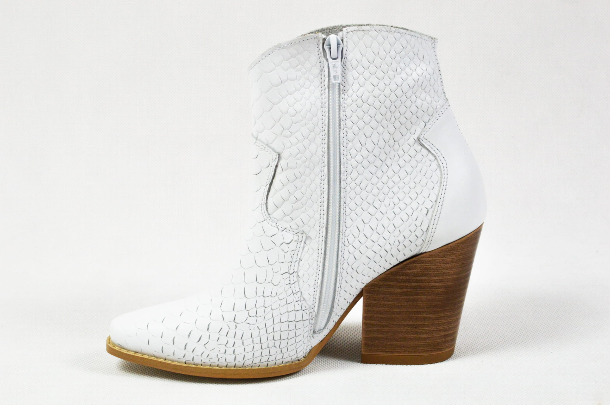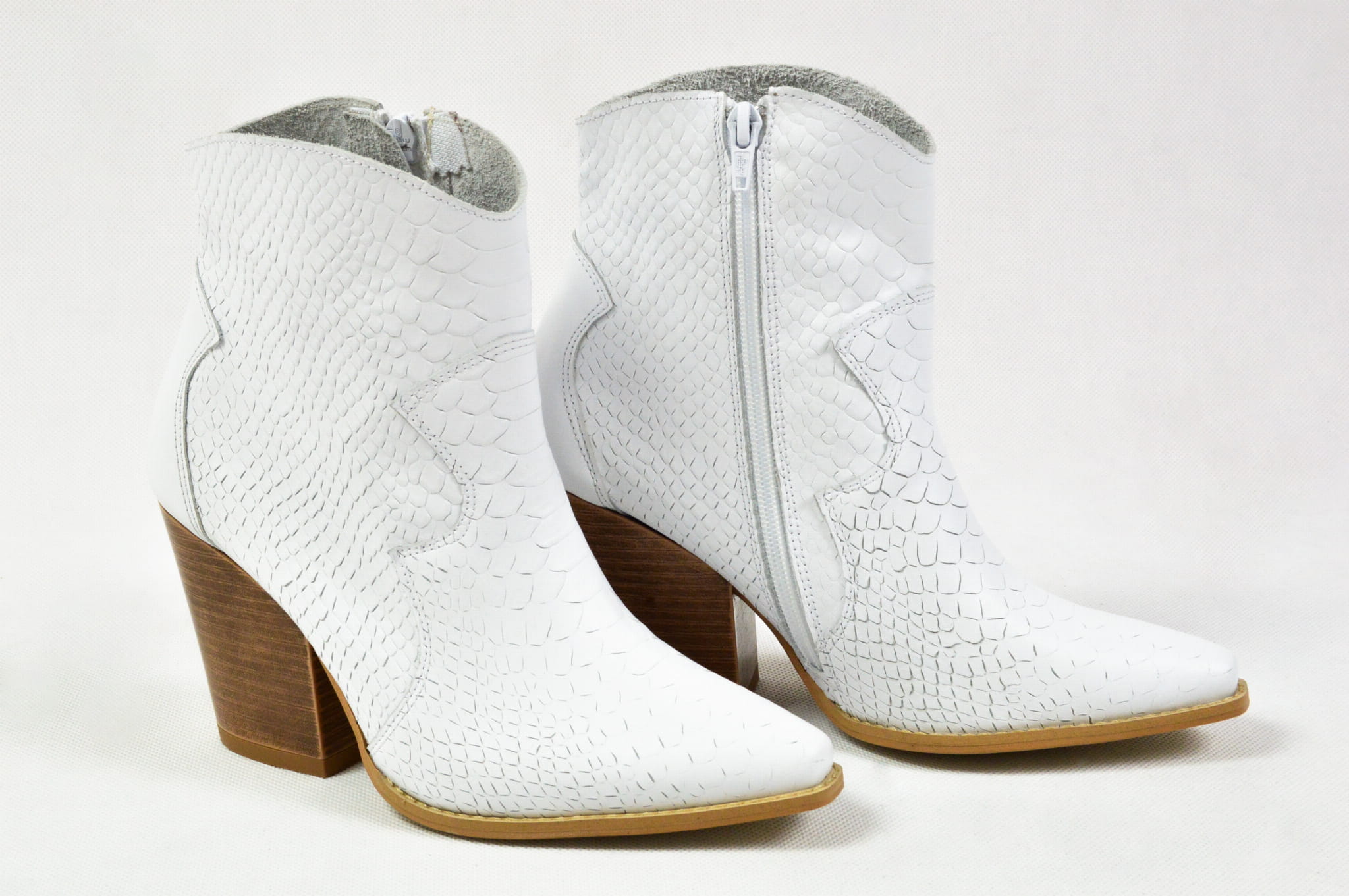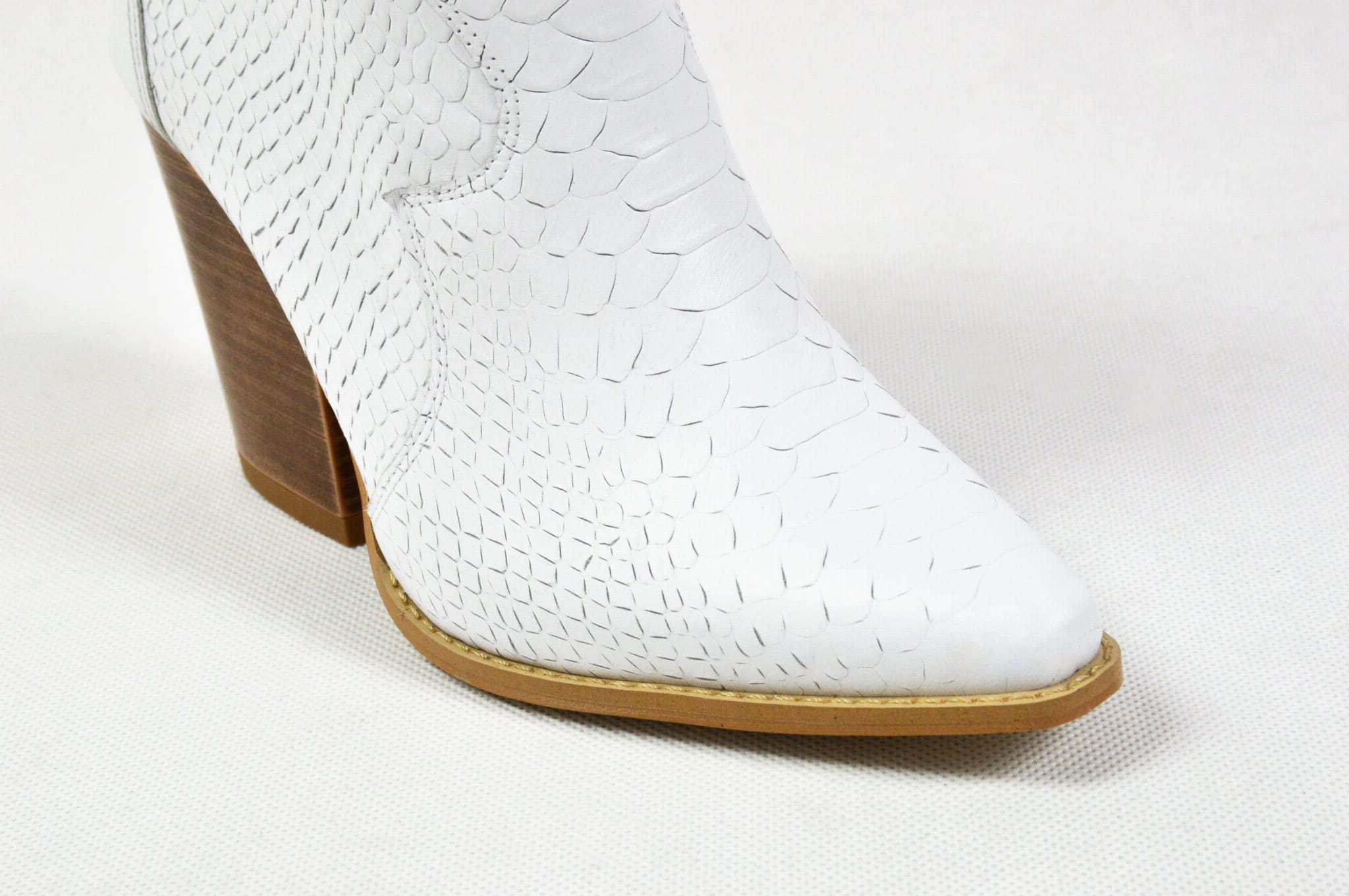 MargoShoes białe wężowe kowbojki damskie botki kowboje żmija skóra naturalna ostry nosek czubek na obcasie klocku