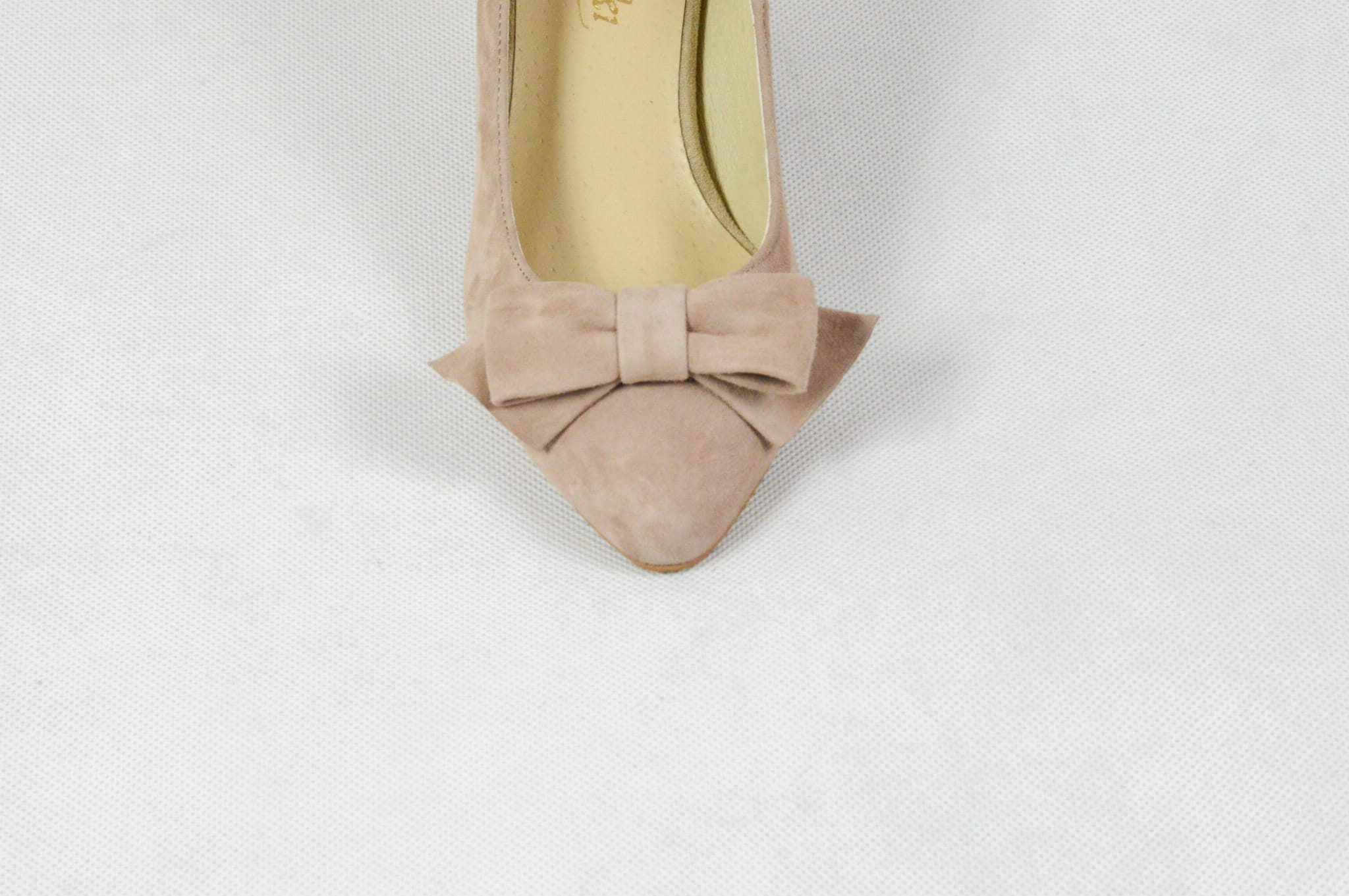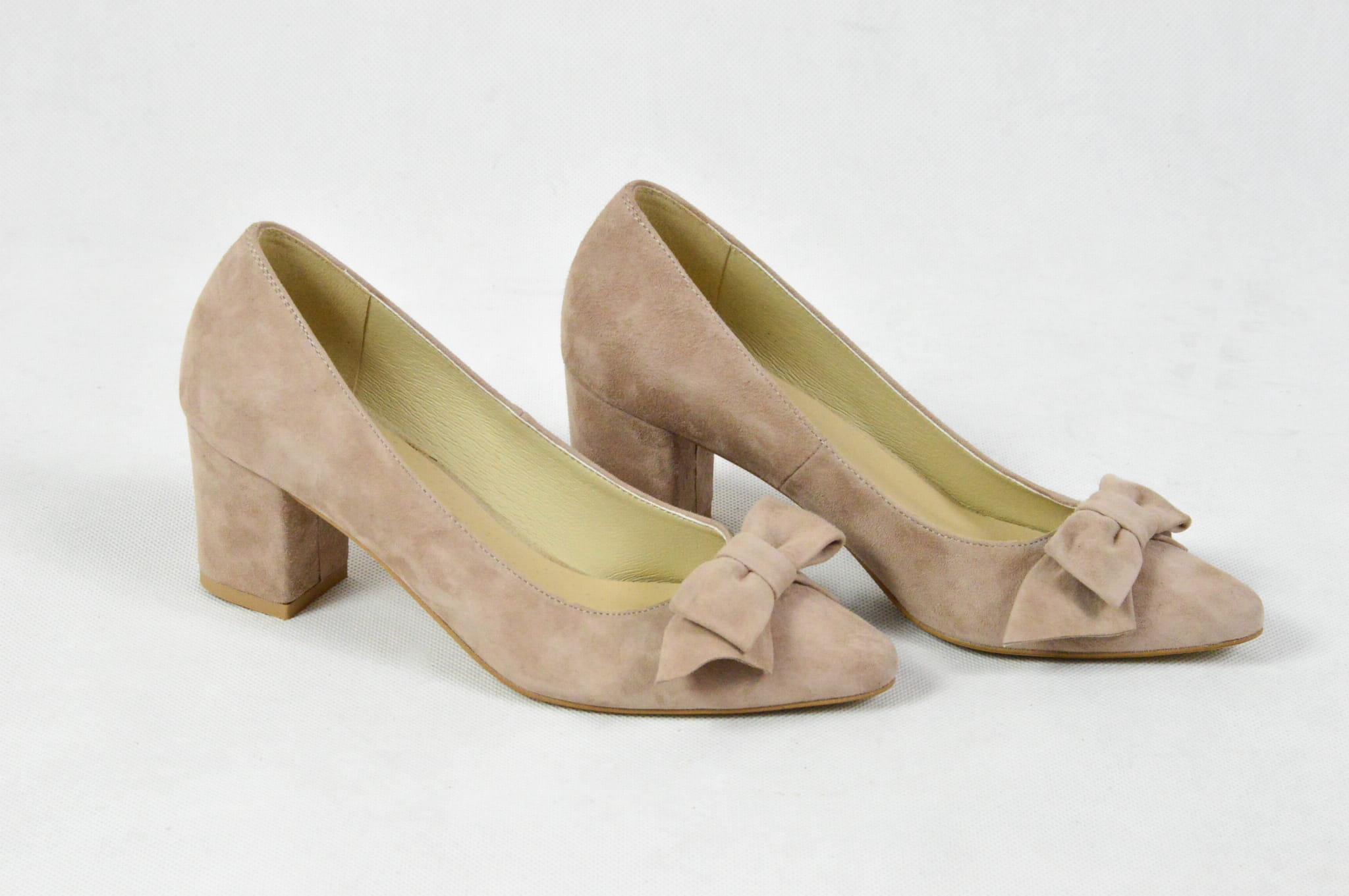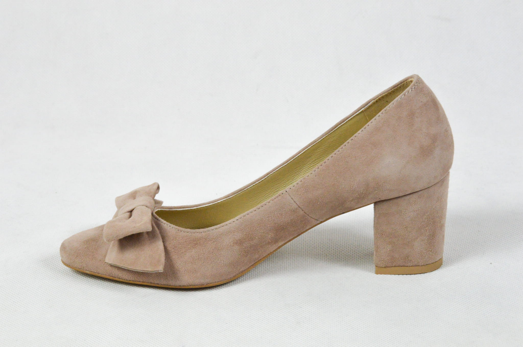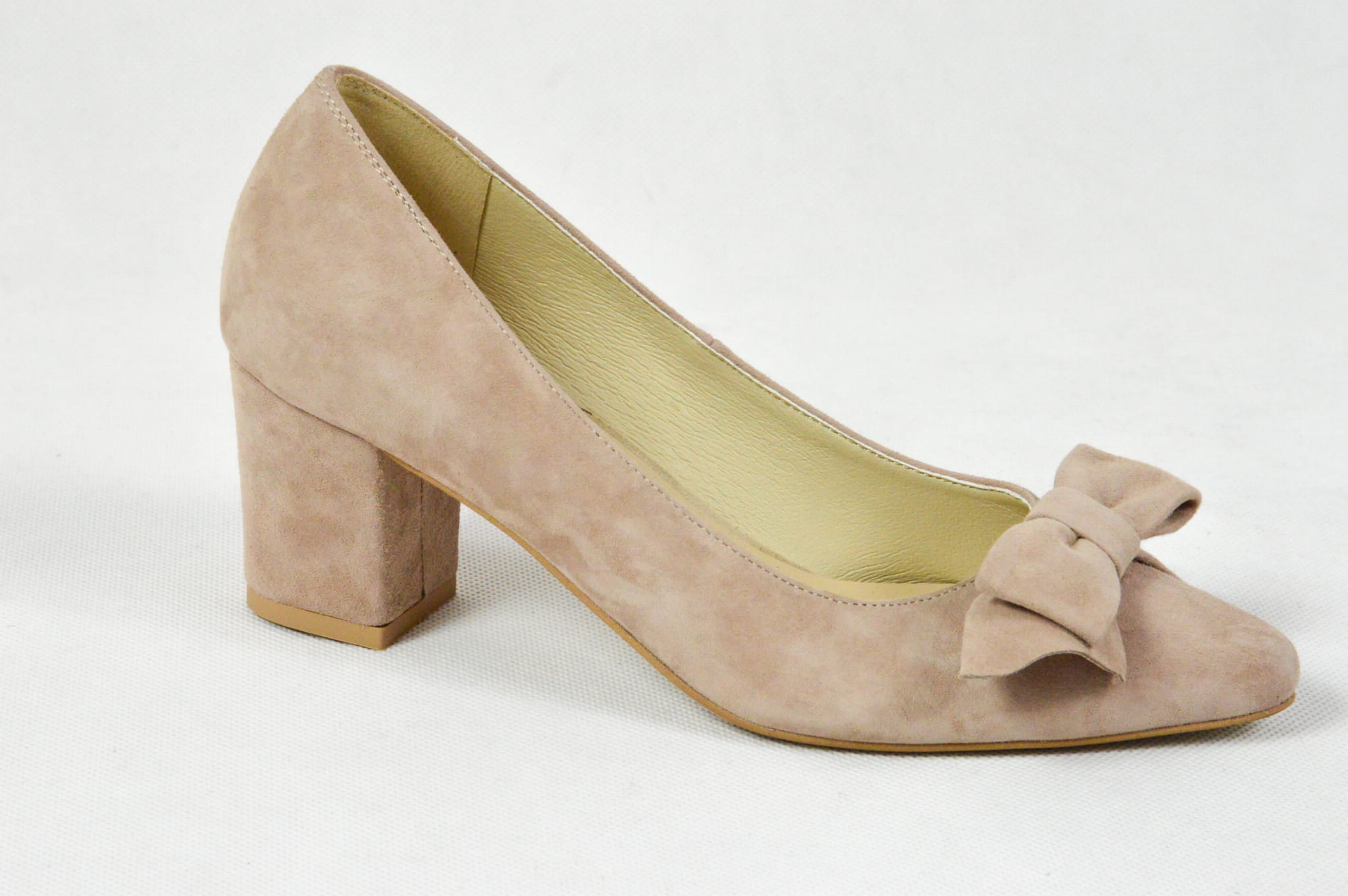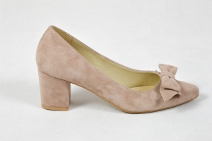 MargoShoes cappuccino beżowe czółenka na niskim obcasie z ozdobną kokardą wykonane ze skóry naturalnej zamsz