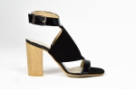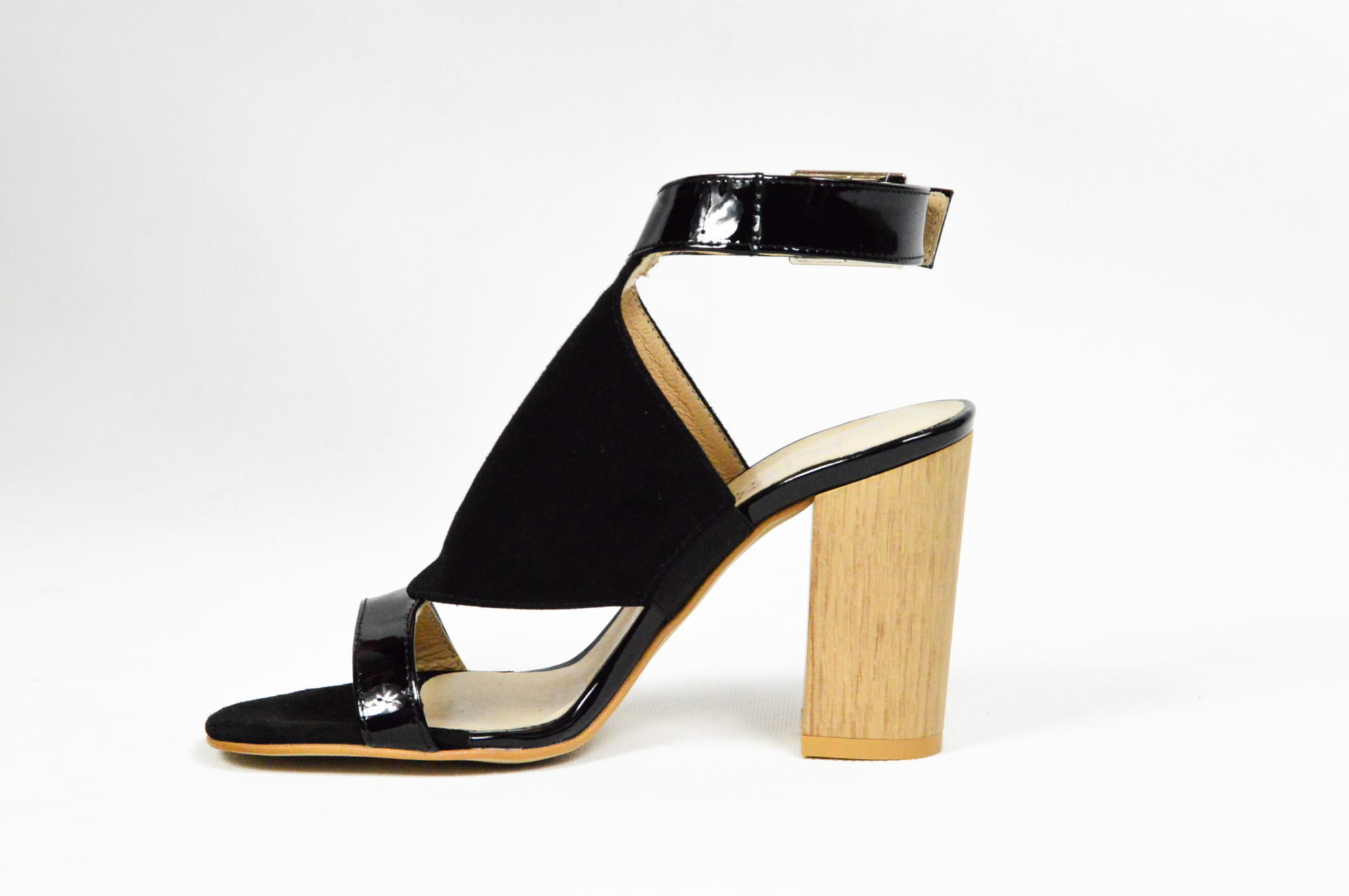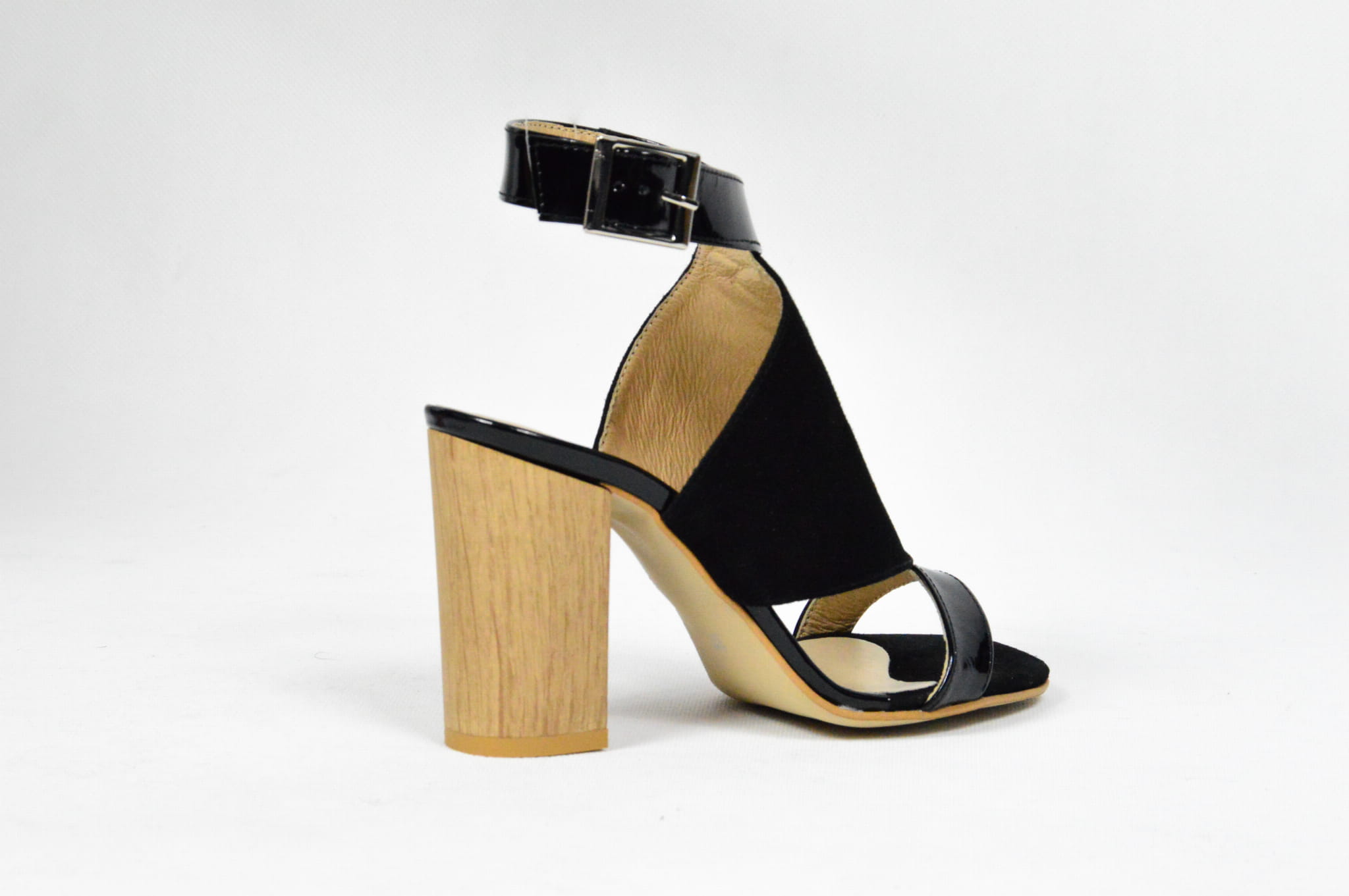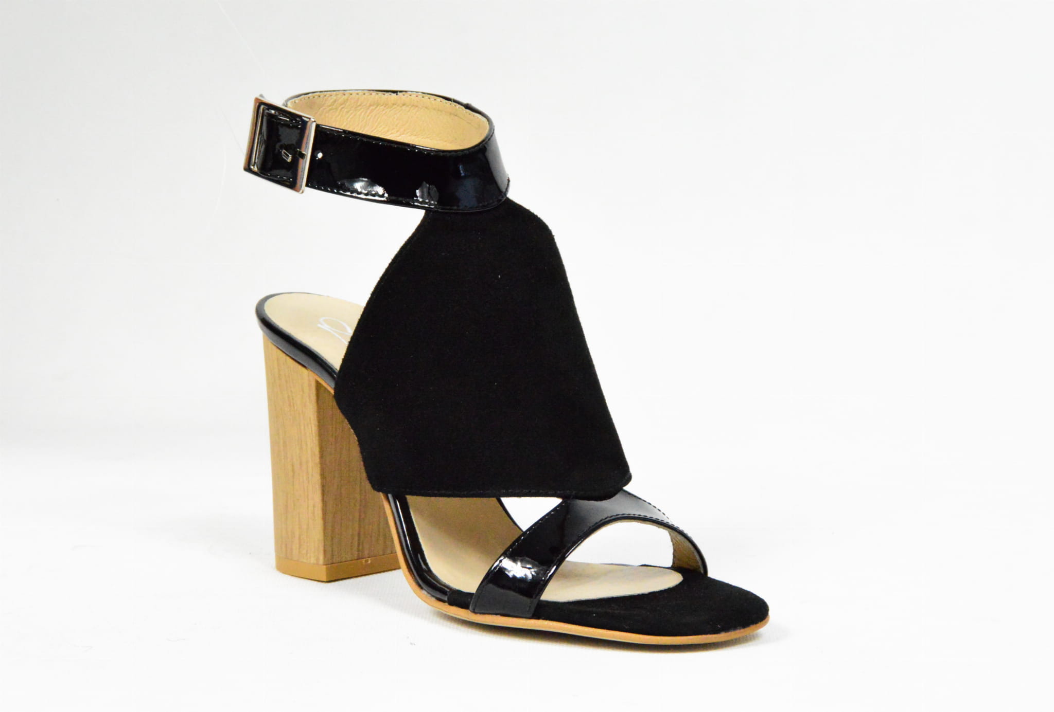 MargoShoes czarne sandałki na obcasie słupku o wysokości 8 cm wykonane ze skóry naturalnej lakierowanej i zamszowej