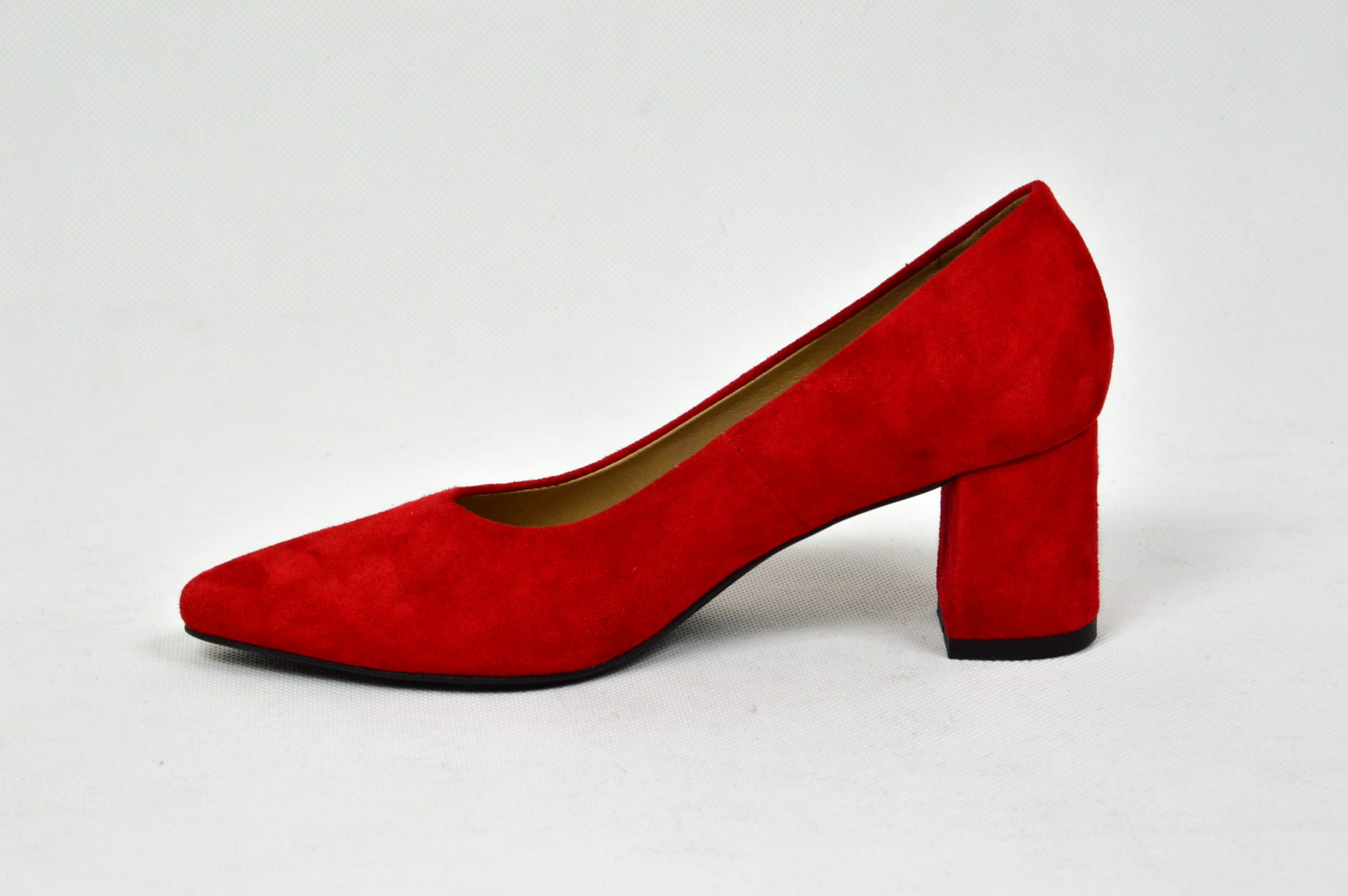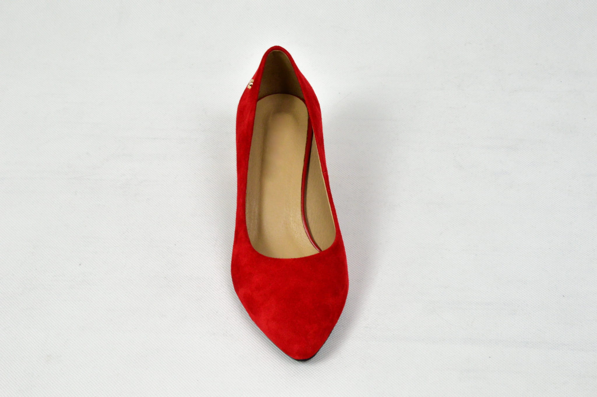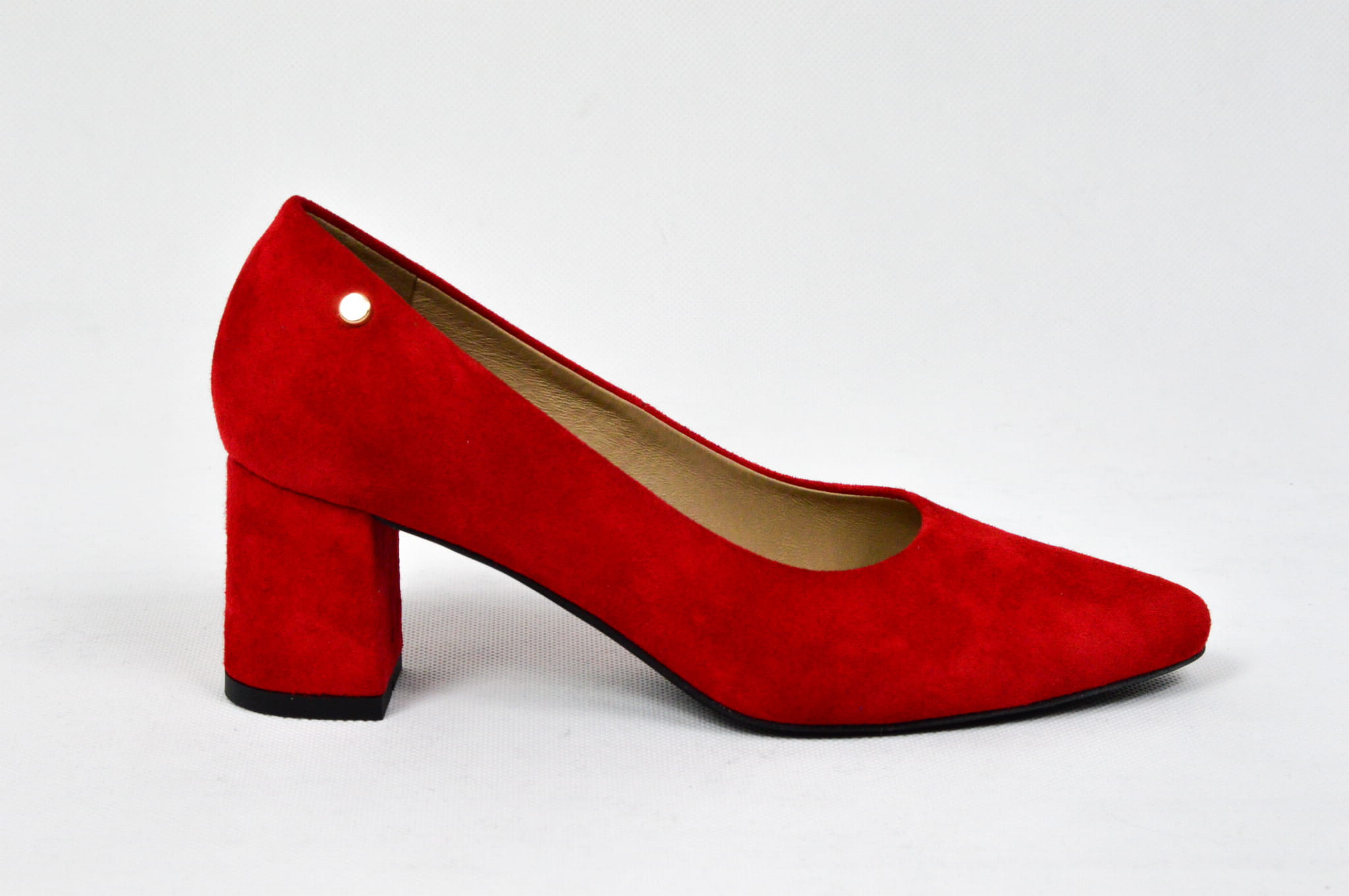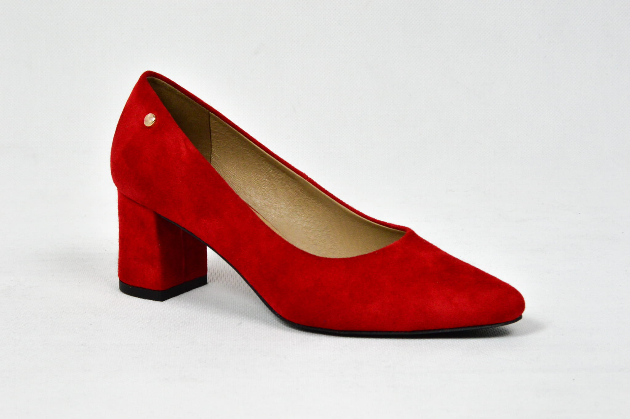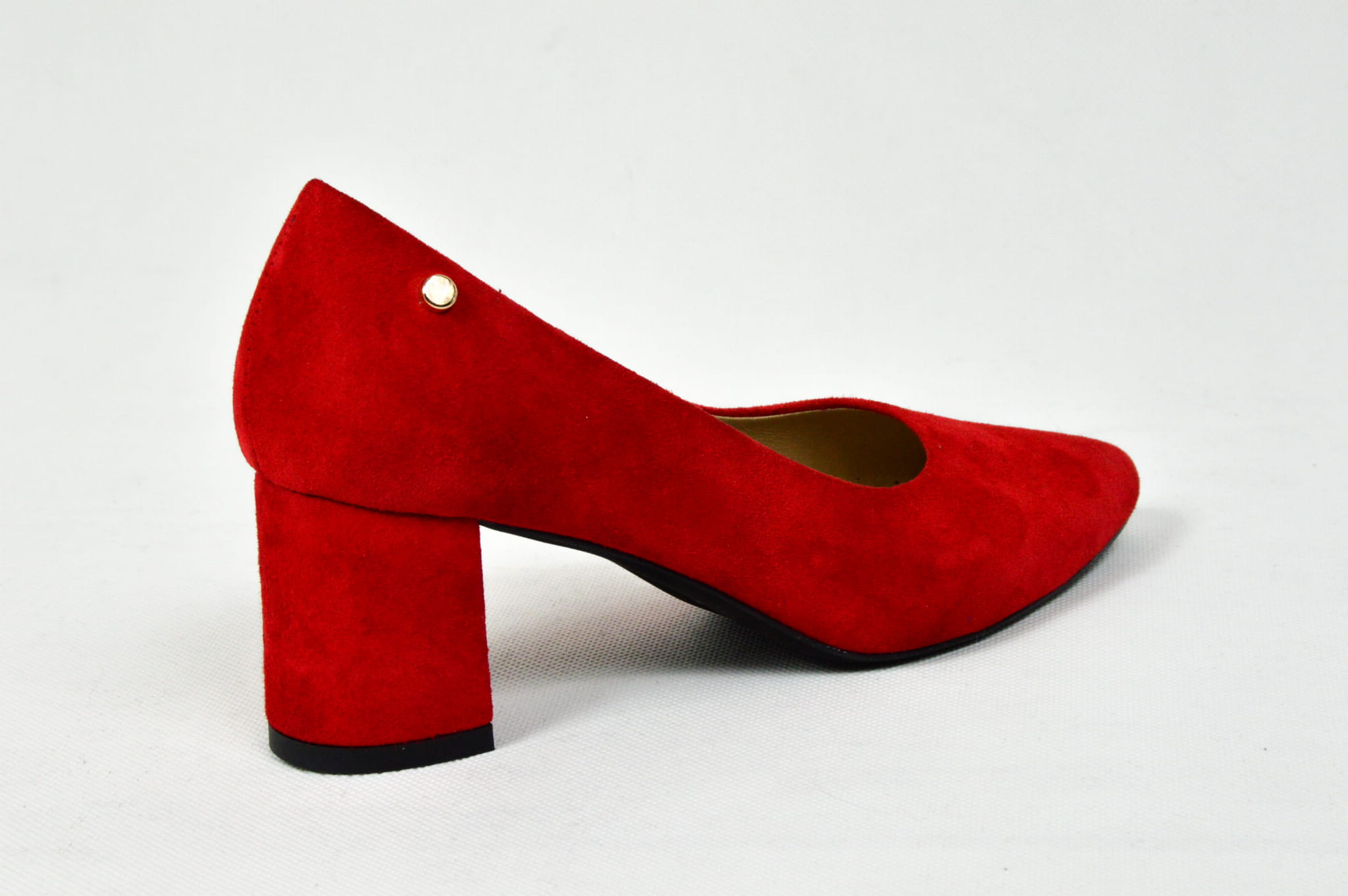 MargoShoes czerwone zamszowe skórzane czółenka w szpic na niskim klocku gładkie skóra naturalna produkt polski