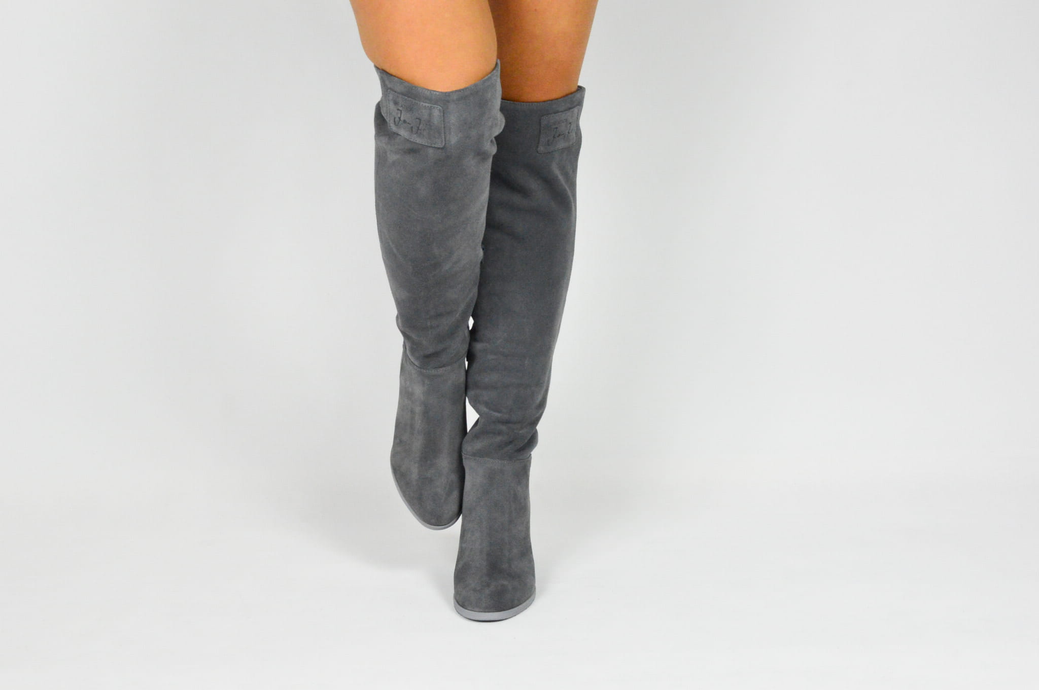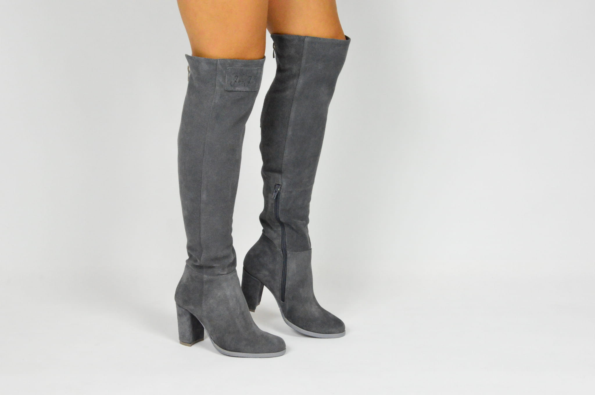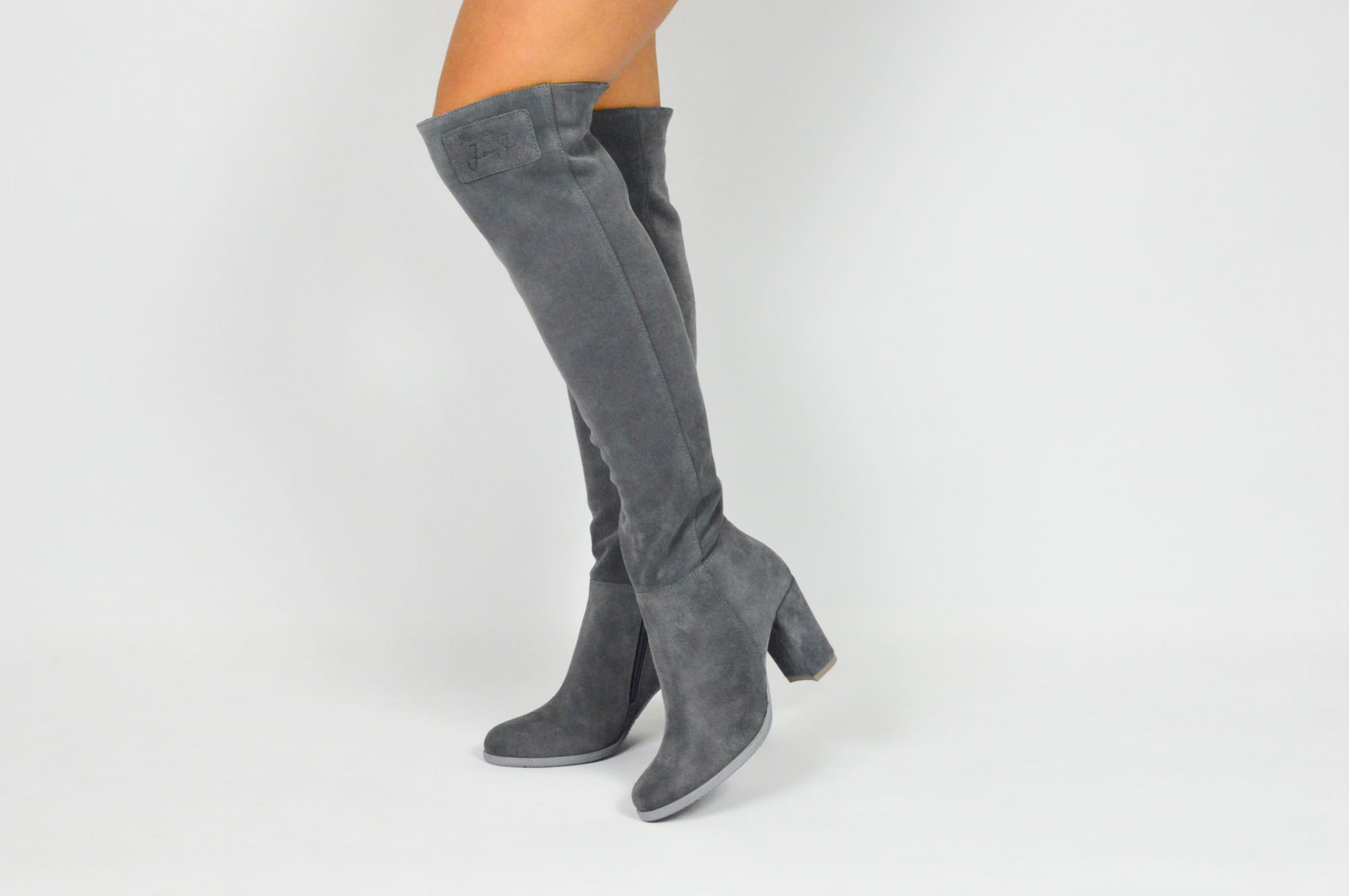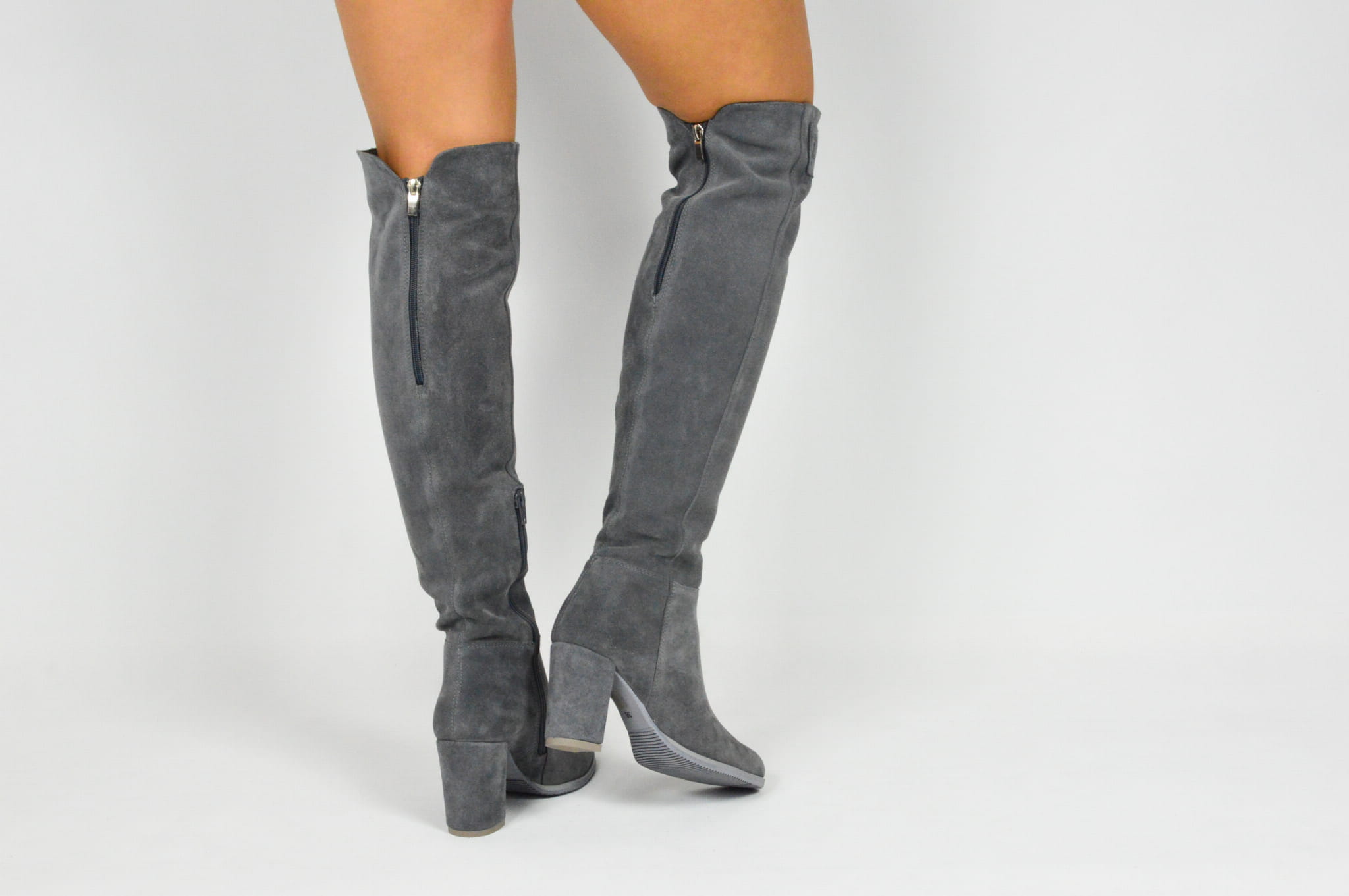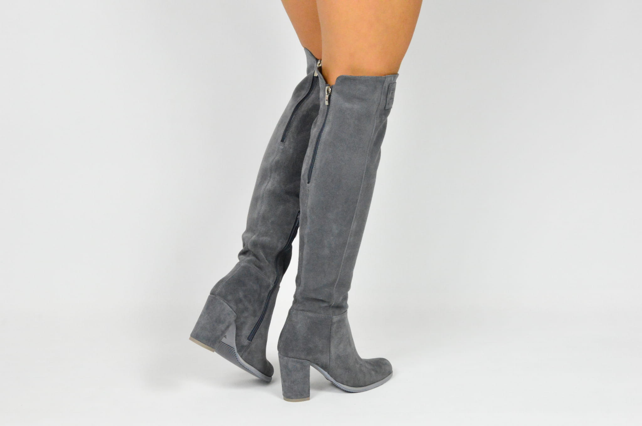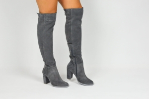 MargoShoes grafitowe kozaki na obcasie słupek za kolano skóra naturalna welurowa zamsz