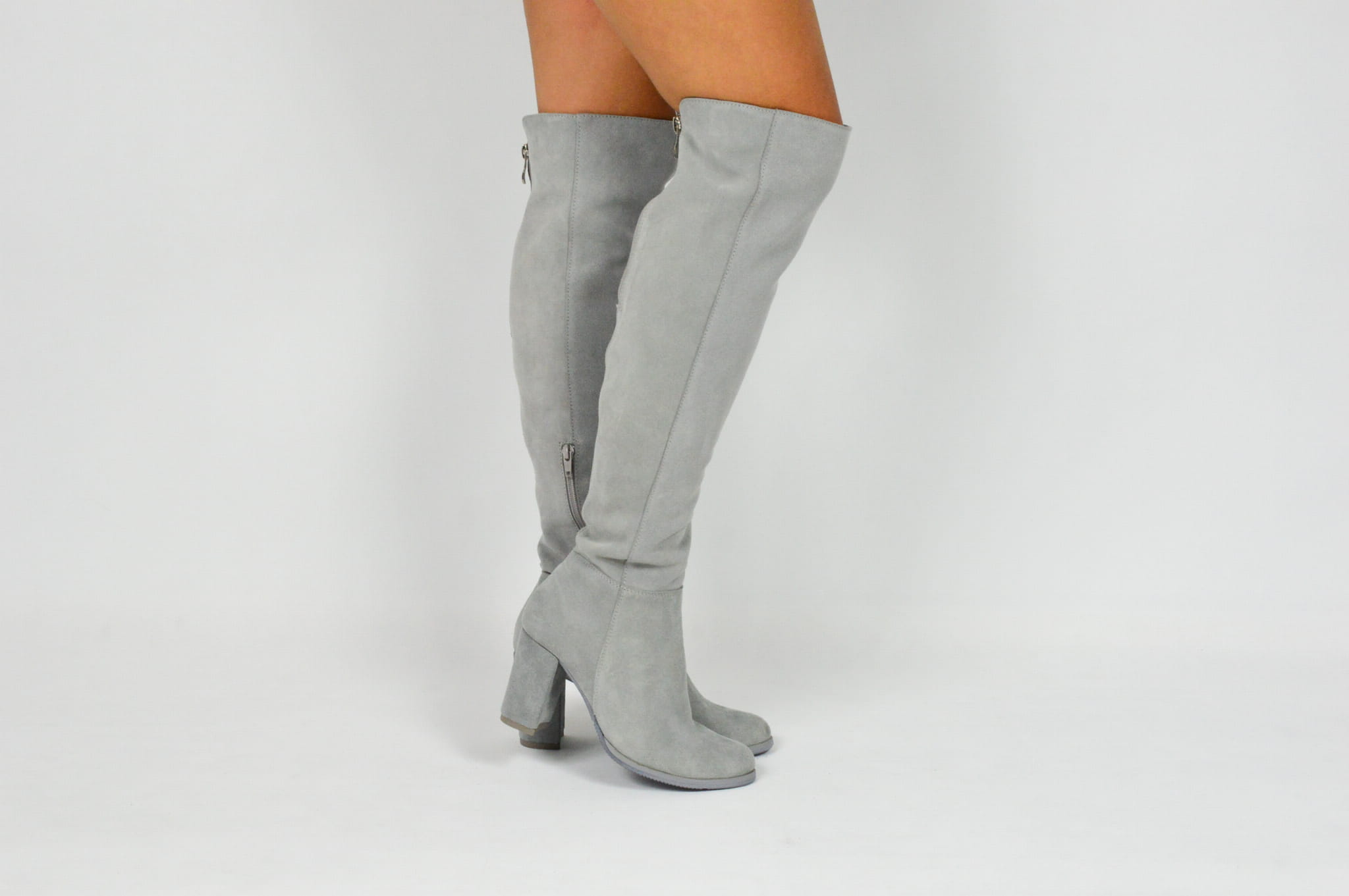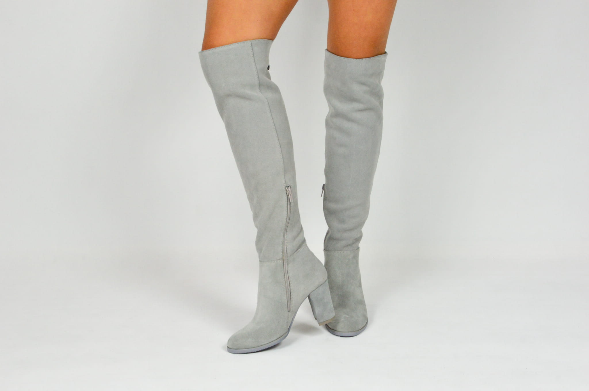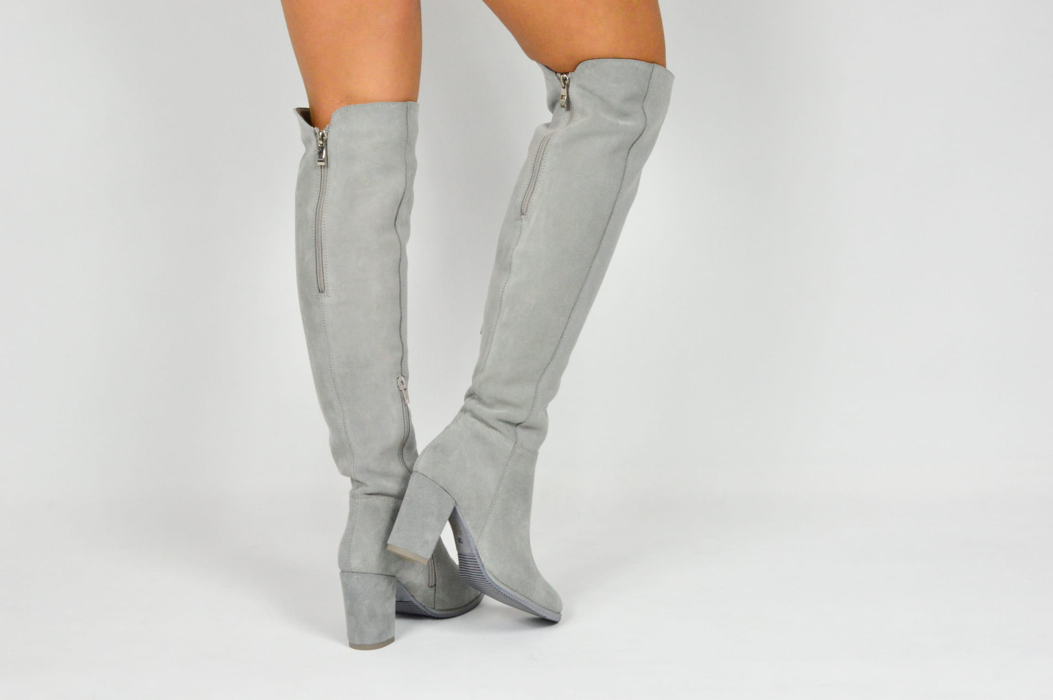 MargoShoes szare skórzane kozaki na obcasie słupku za kolano zapinane na zamek skóra naturalna zamszowa welurowa