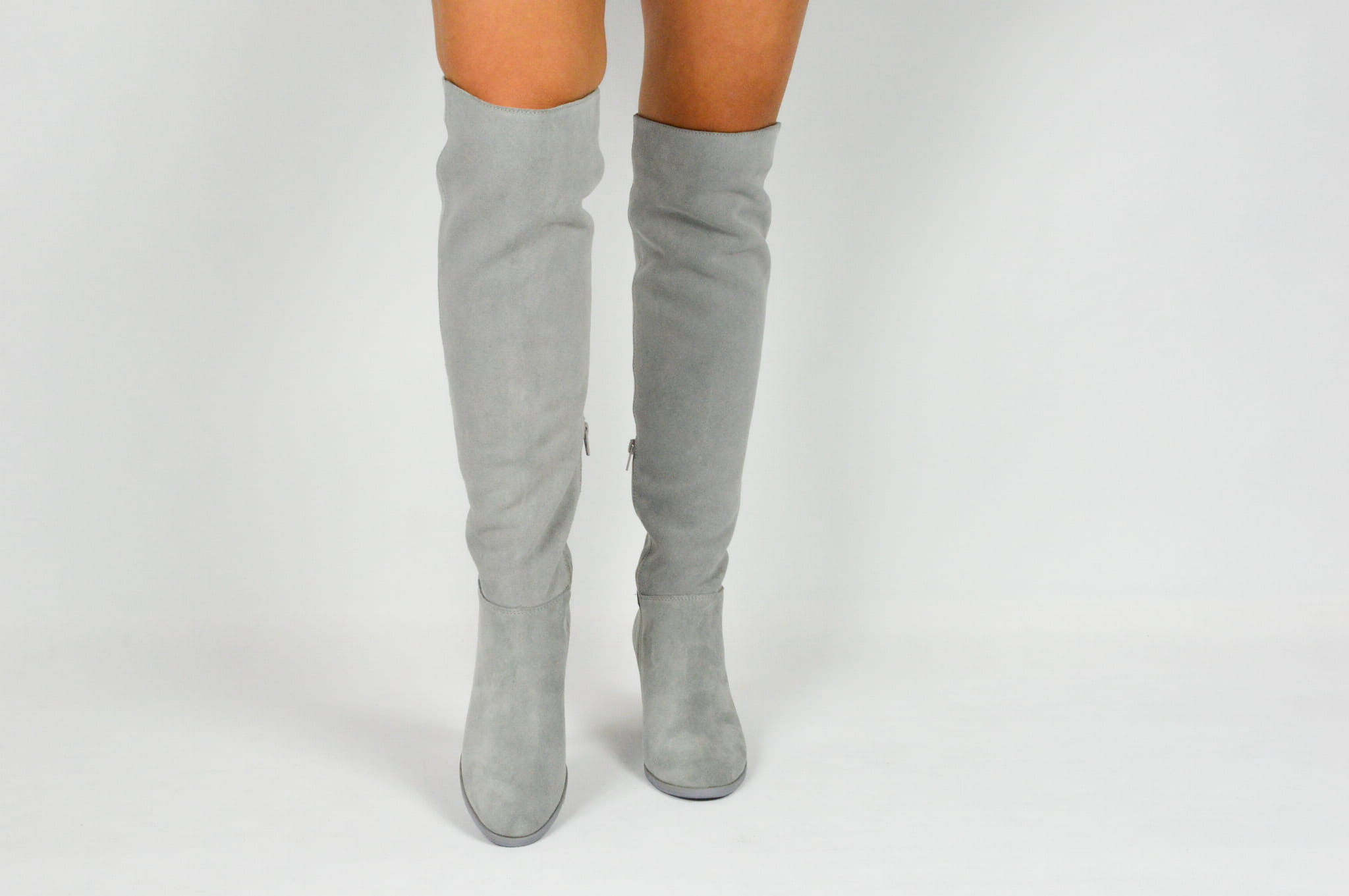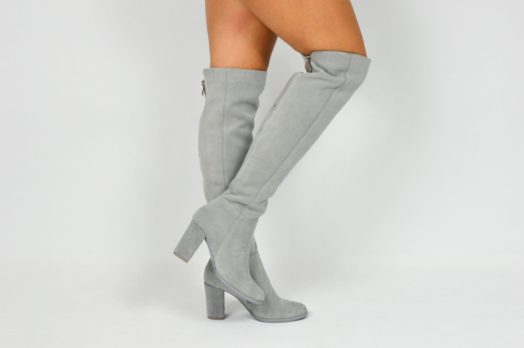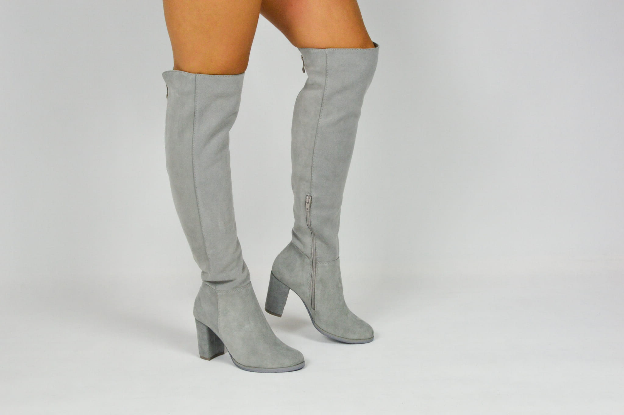 MargoShoes szare skórzane kozaki na obcasie słupku za kolano zapinane na zamek skóra naturalna zamszowa welurowa
