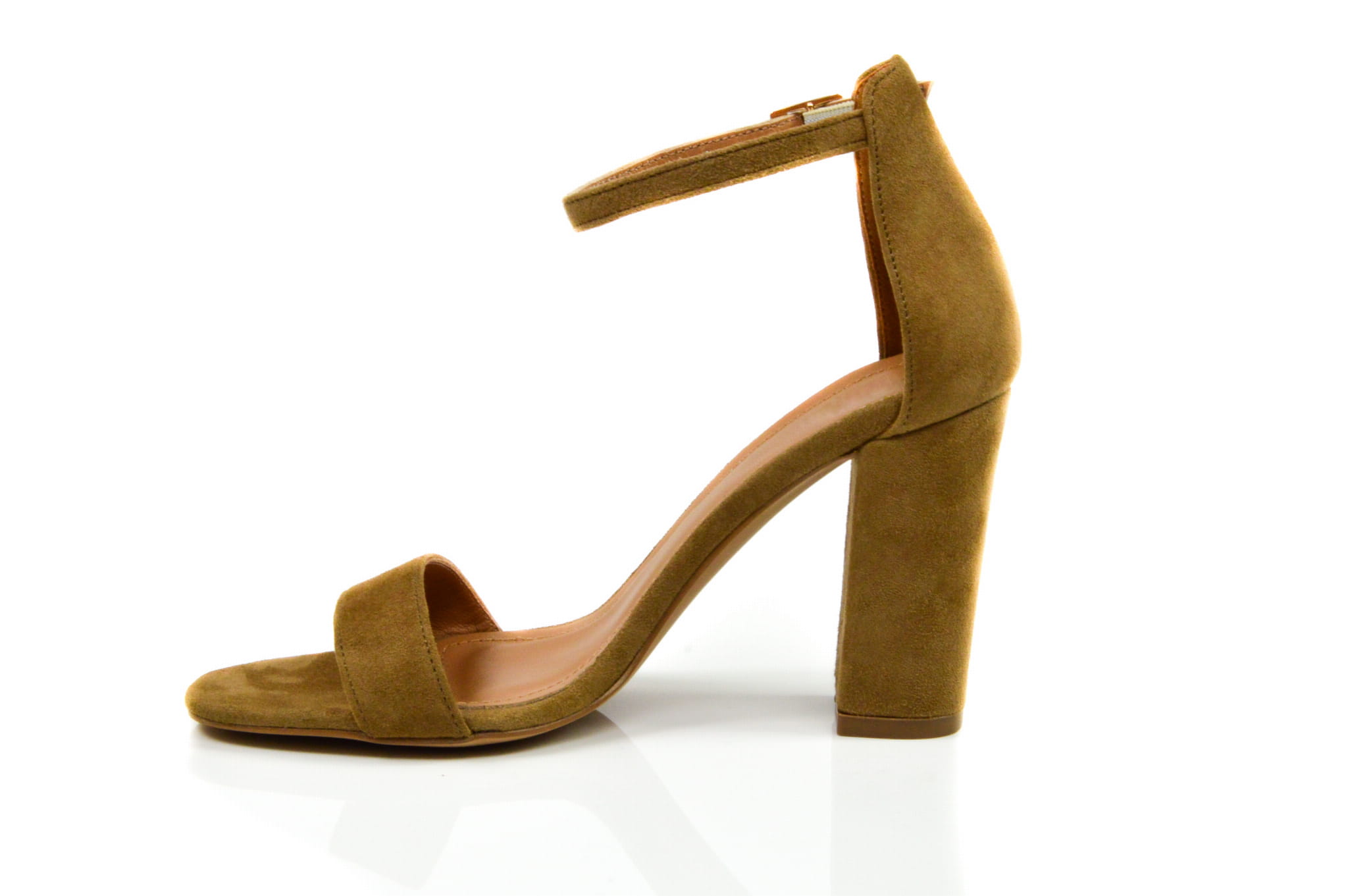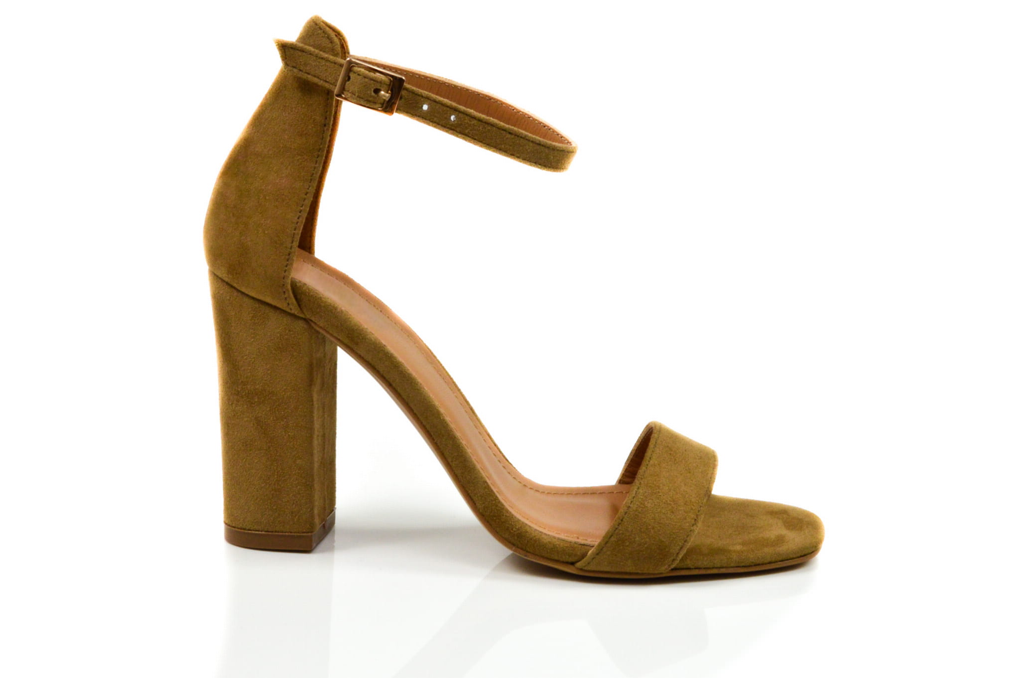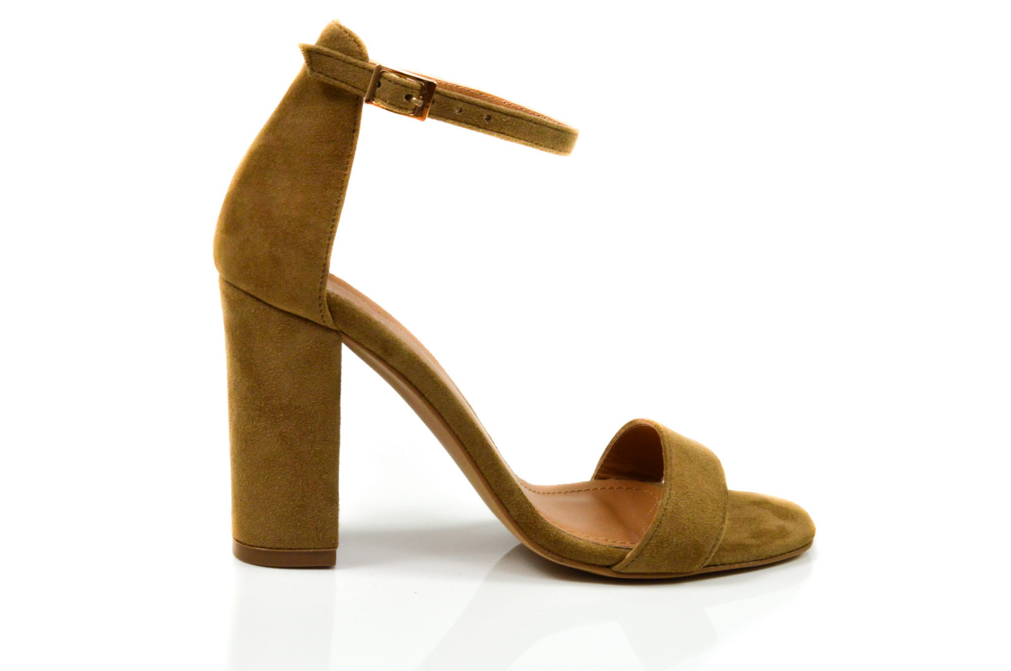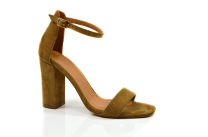 Rude sandałki damskie wykonane ze skóry naturalnej: zamszowej, w butach zastosowano obcas typu słupek wysokości: 8 cm. Sandałki zapinane wokół kostki na klamerkę.