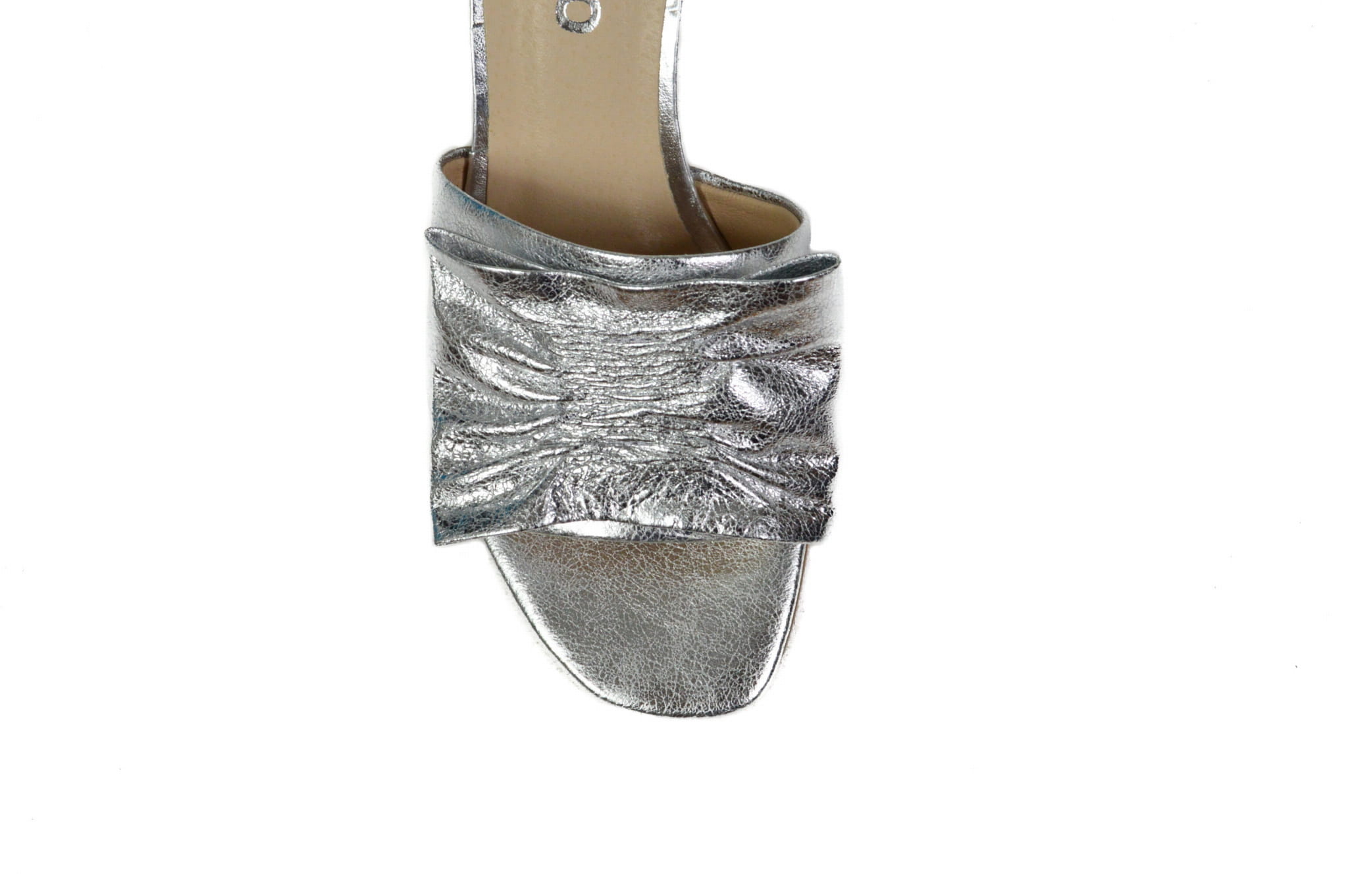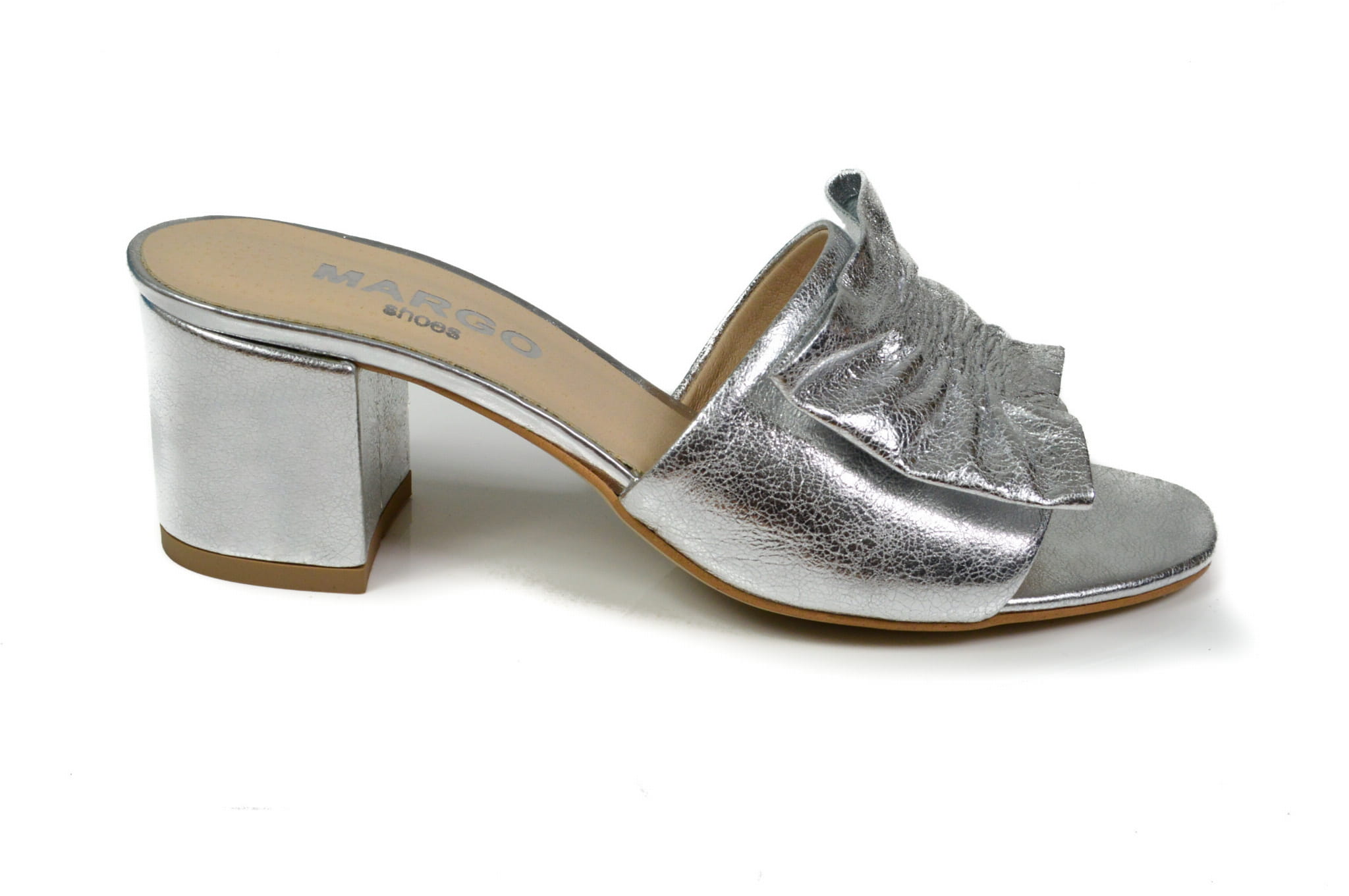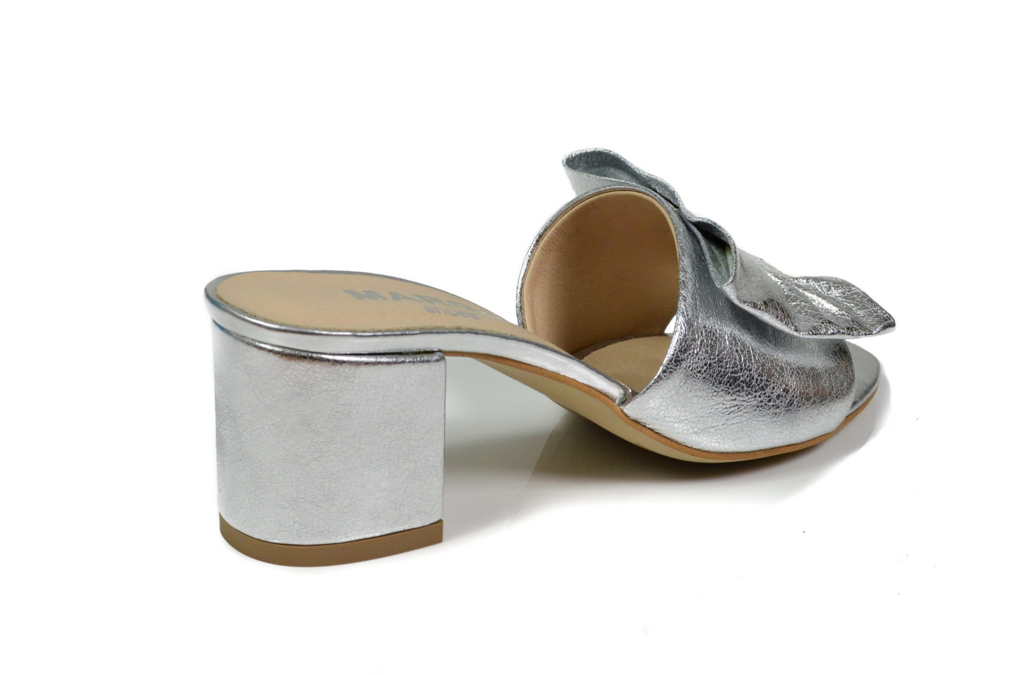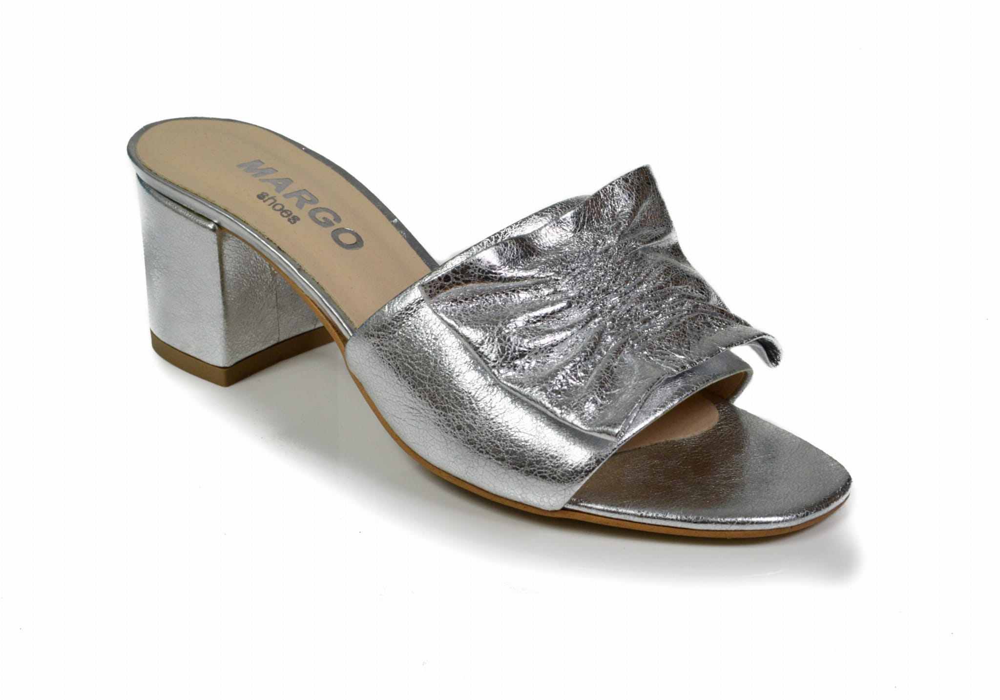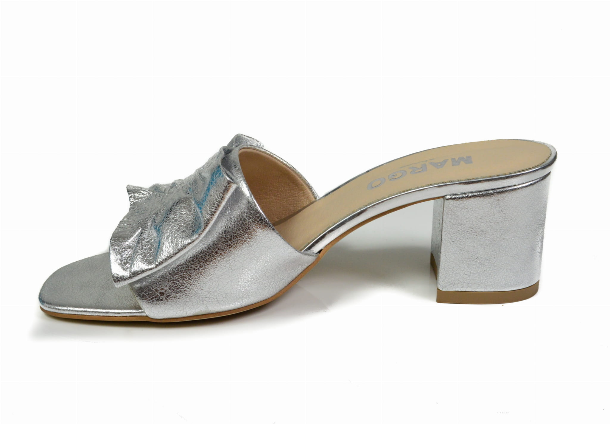 Srebrne klapki damskie na stabilnym obcasie z ozdobą, wykonane ze skóry naturalnej. Buty polskiej produkcji marki MargoShoes. W klapkach zastosowano niski obcas typu klocek. Klapeczki na klocku to świetne rozwiązanie dla Pań, które cenią sobie elegancję. Obuwie wygodne i stabilne, będą idealnym dopełnieniem każdej stylizacji!
