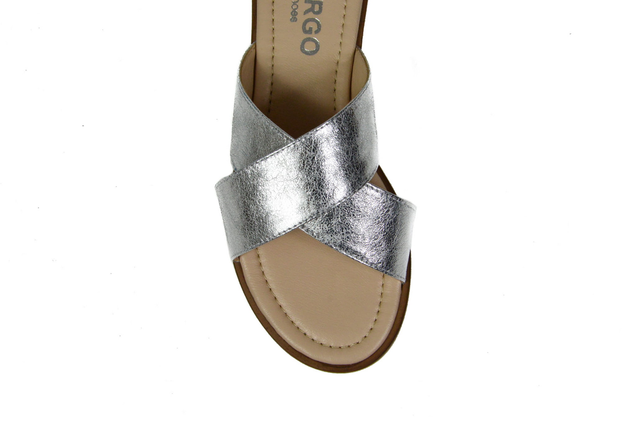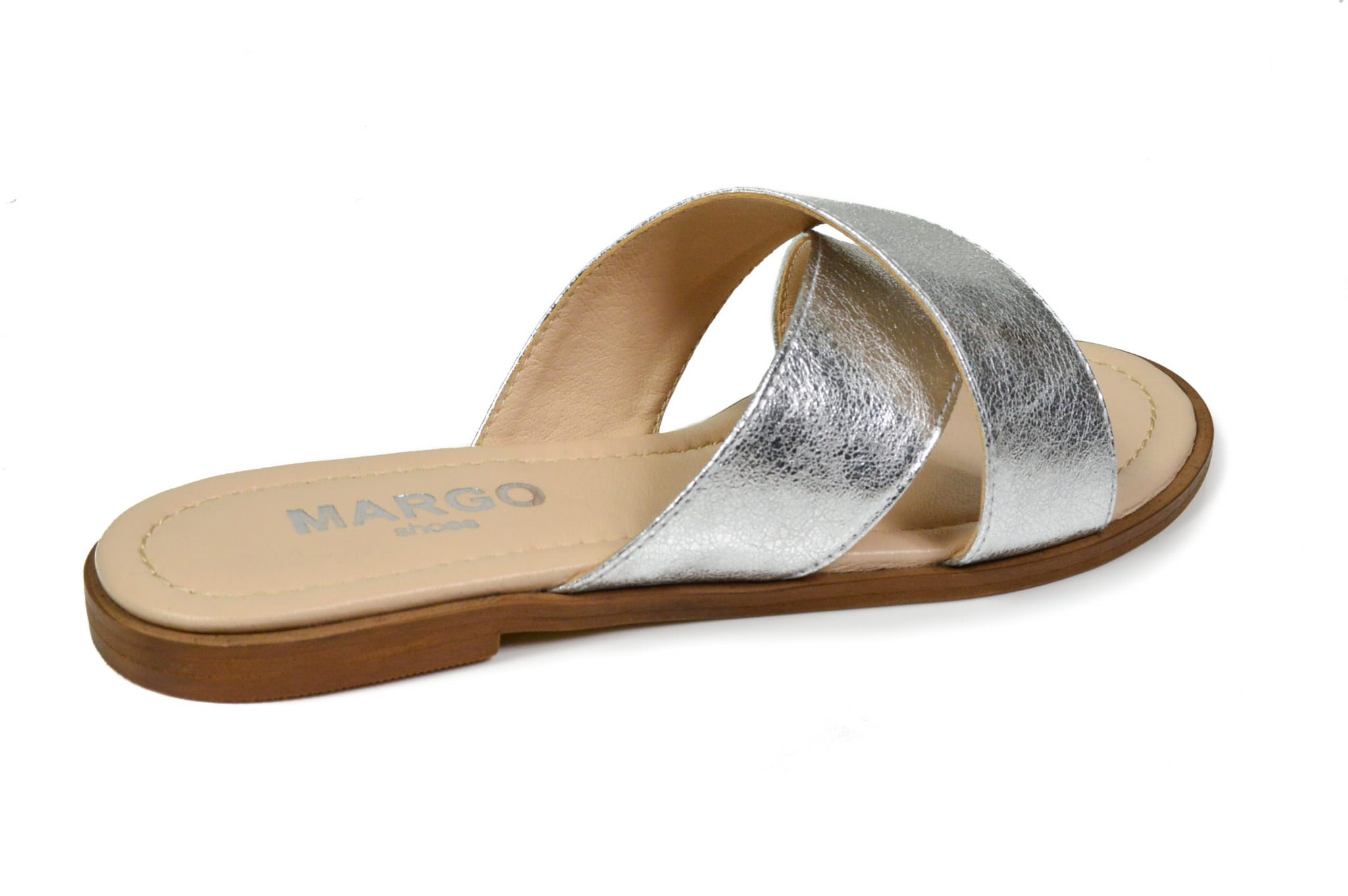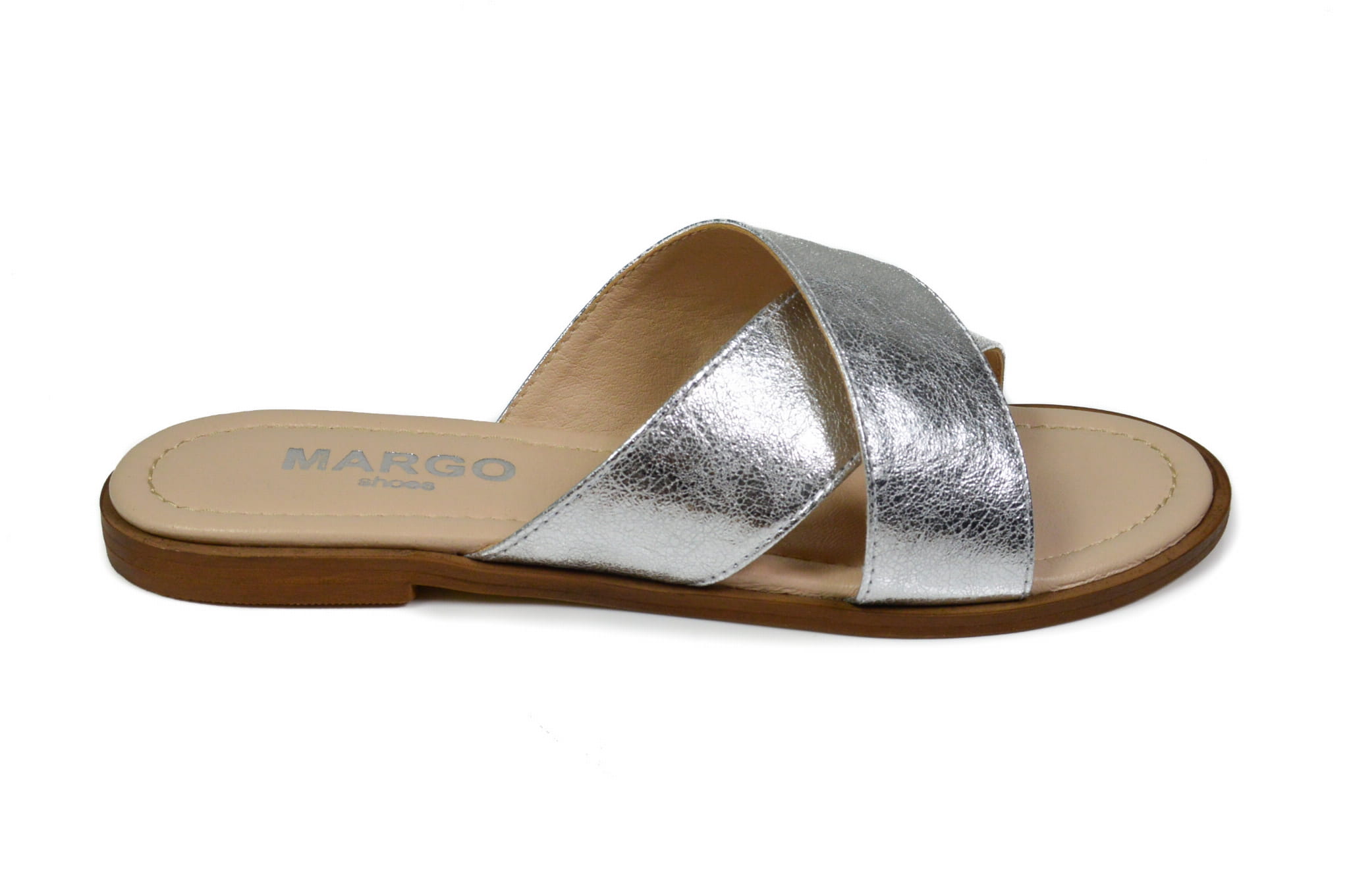 Srebrne klapki damskie, wykonane ze skóry naturalnej. Buty polskiej produkcji marki MargoShoes. W klapkach zastosowano płaską podeszwę.