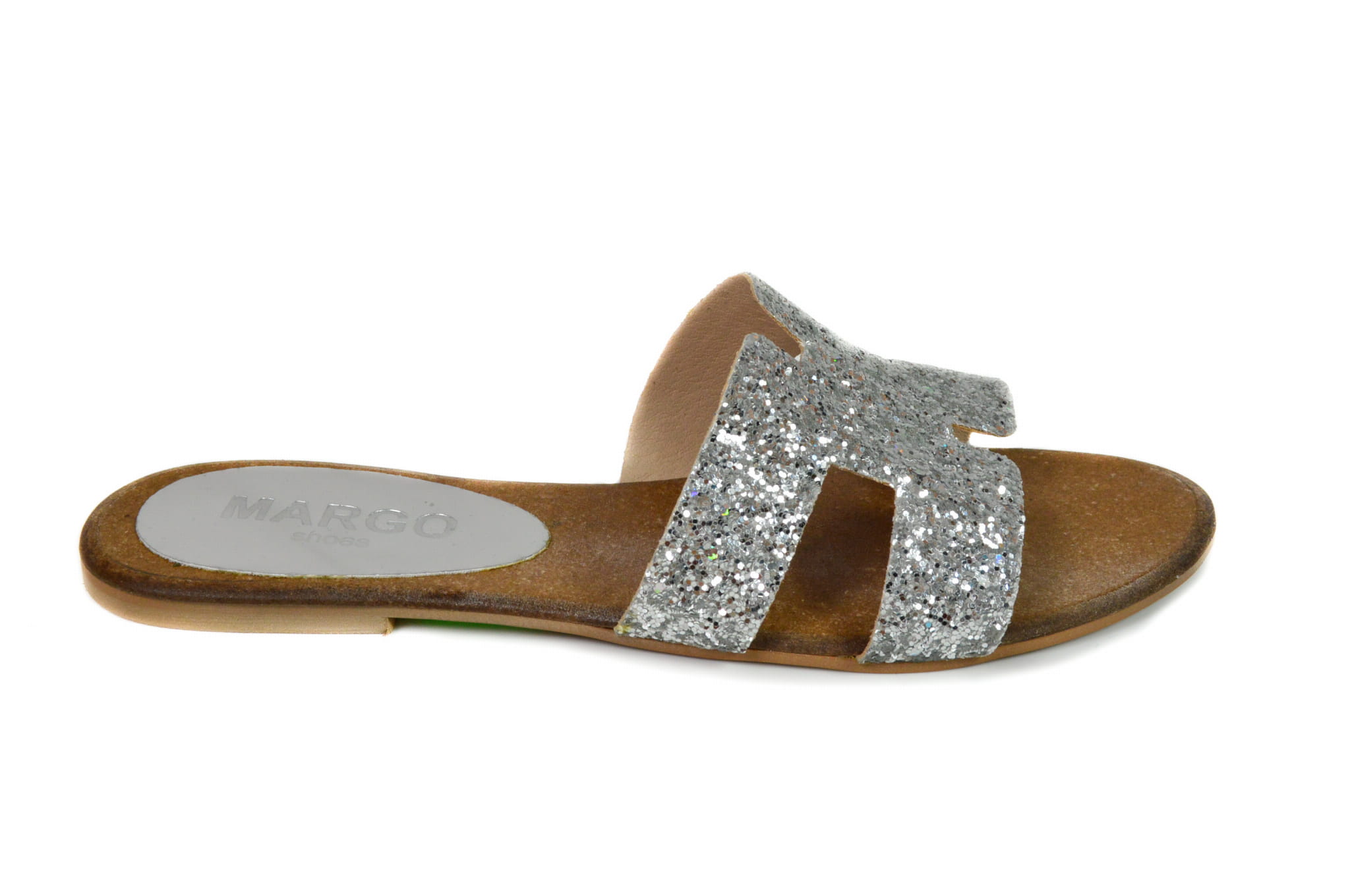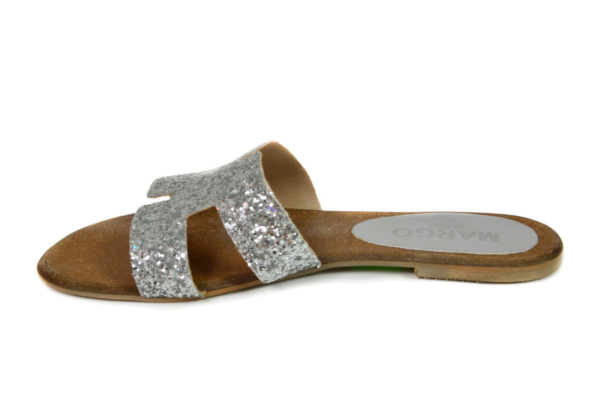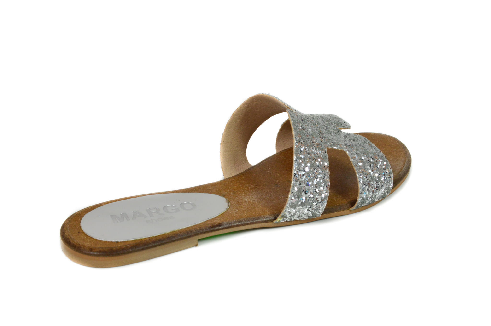 Srebrne klapki damskie, wykonane ze skóry naturalnej. Buty polskiej produkcji marki MargoShoes. W klapkach zastosowano płaską podeszwę.