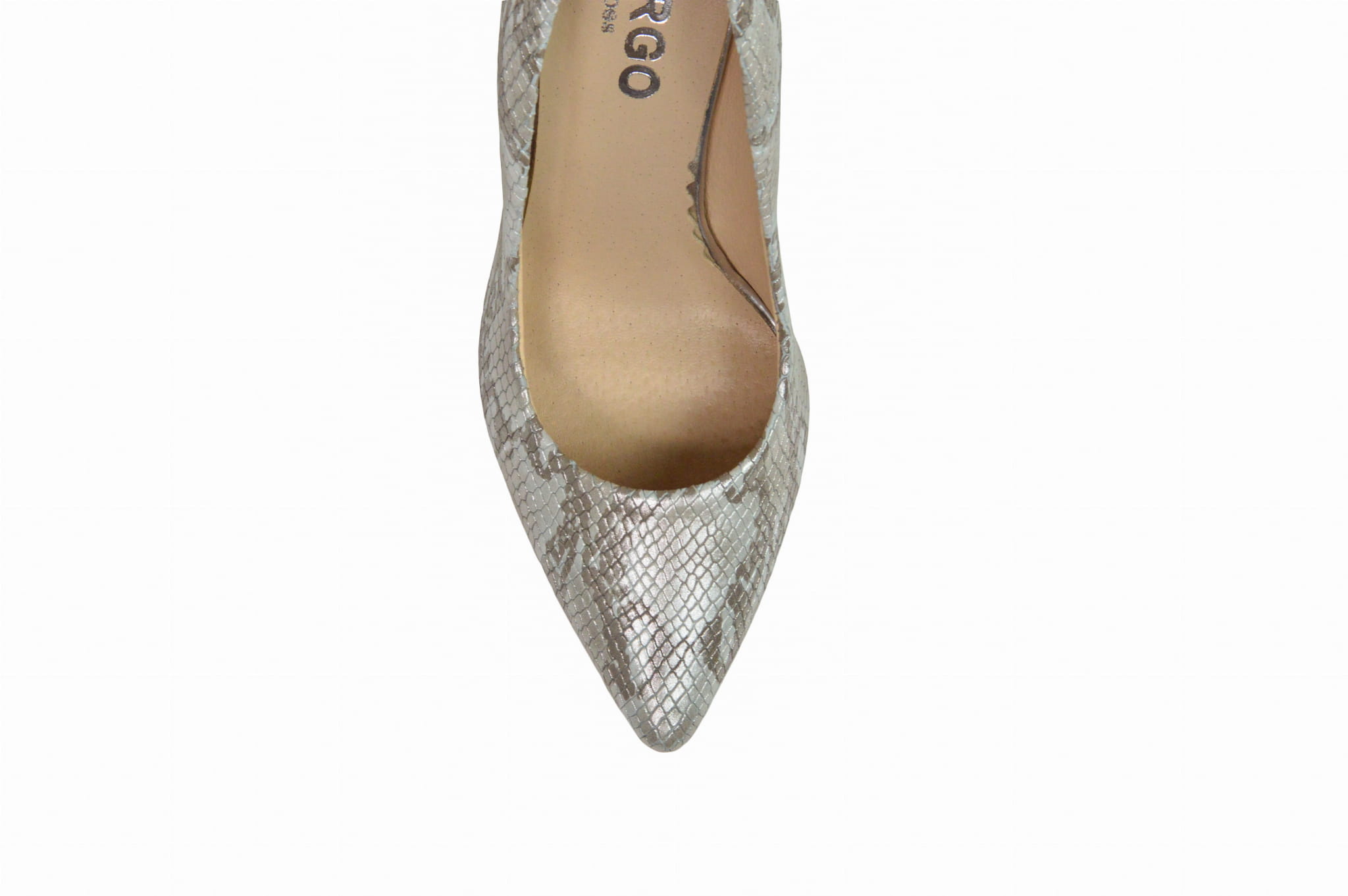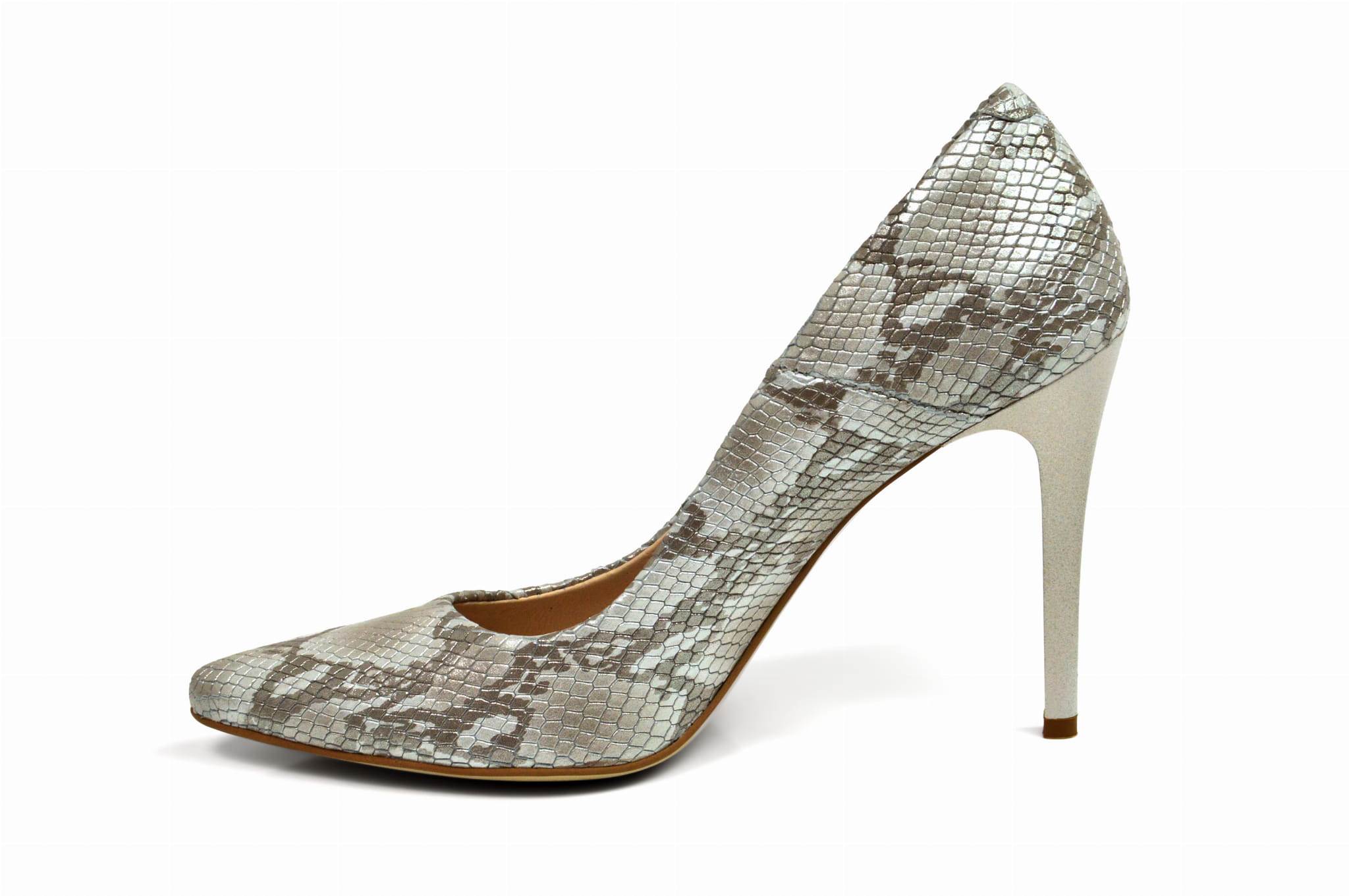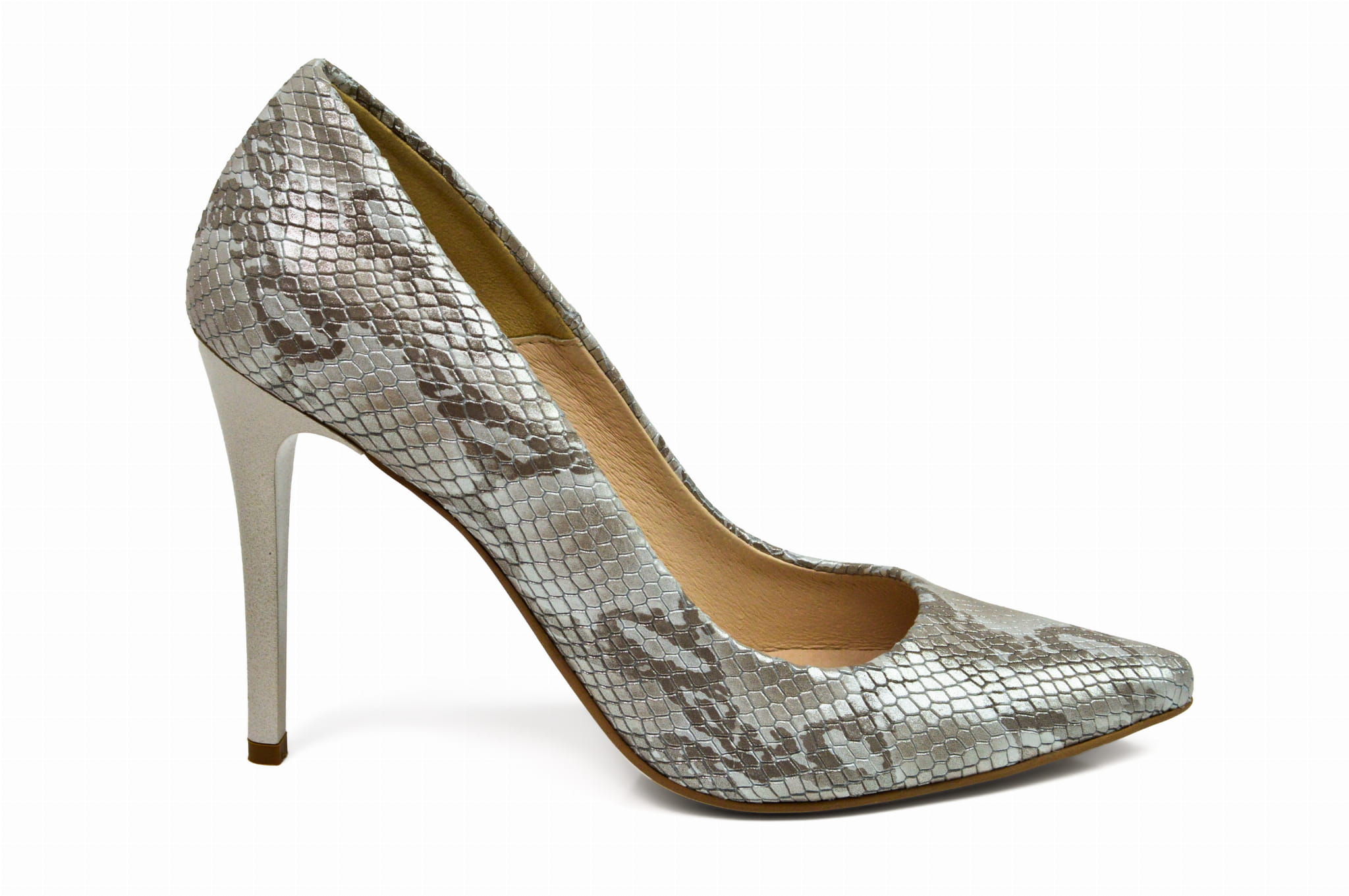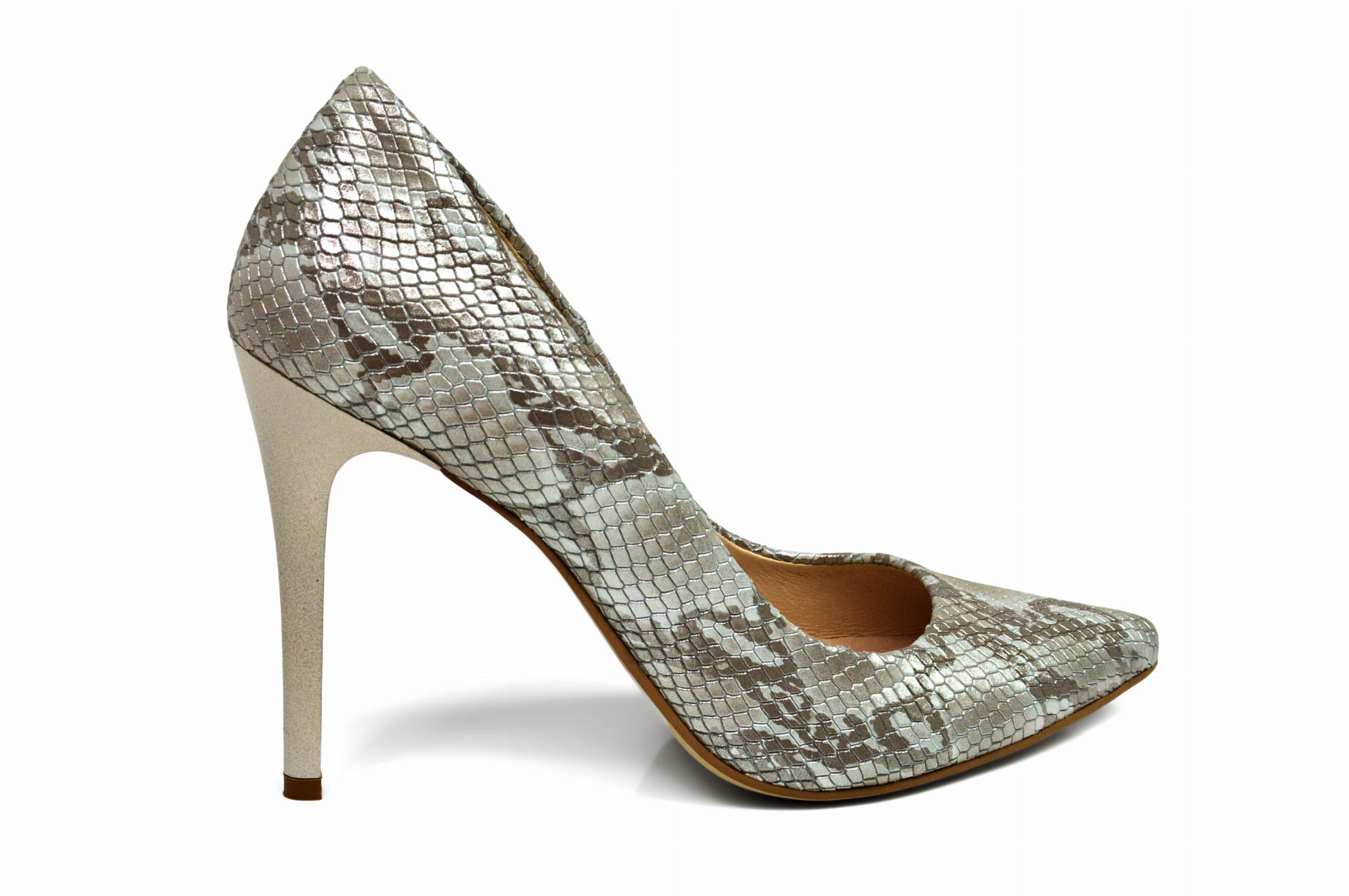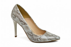 Srebrne wężowe czółenka skórzane na szpilce