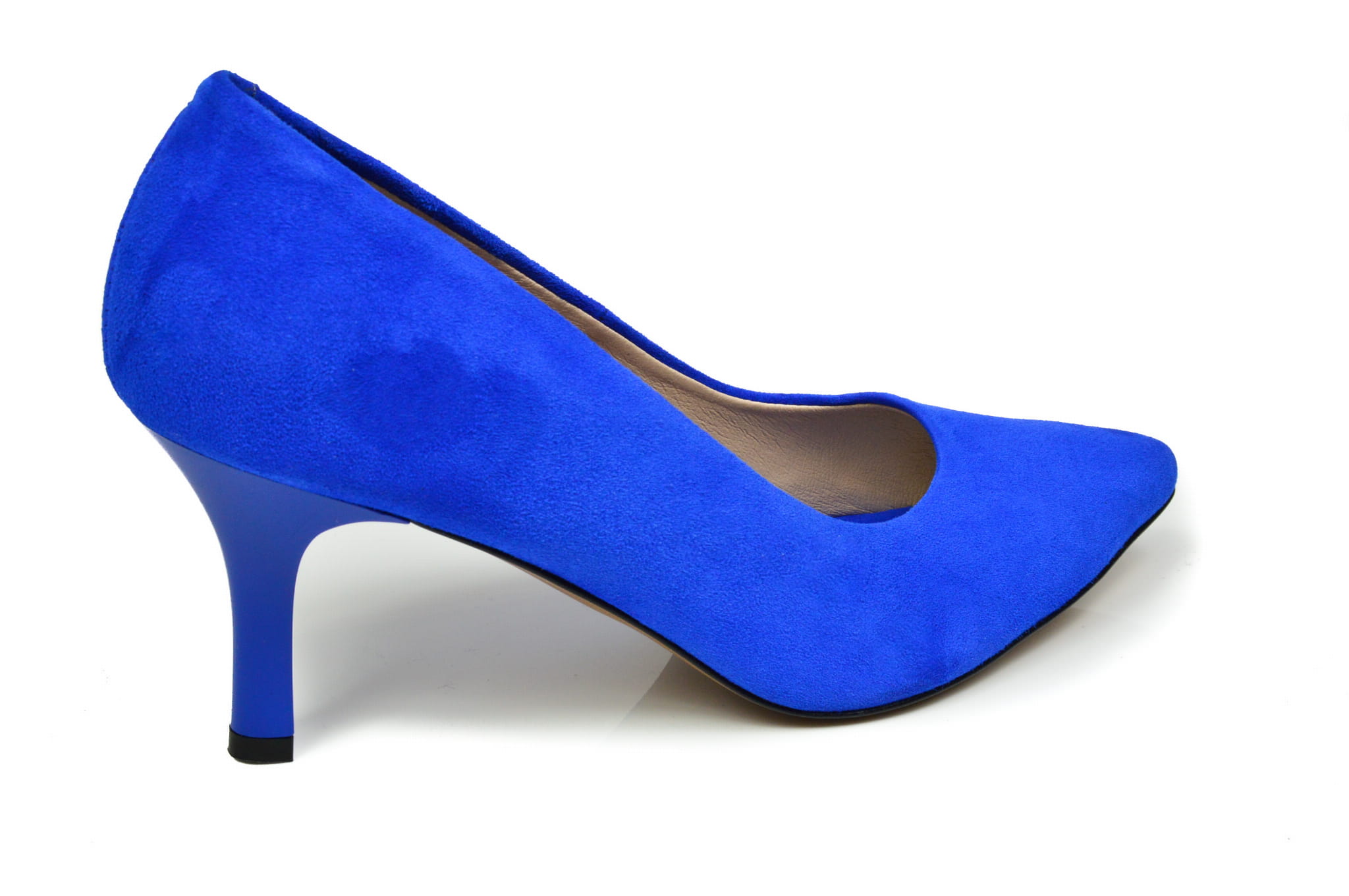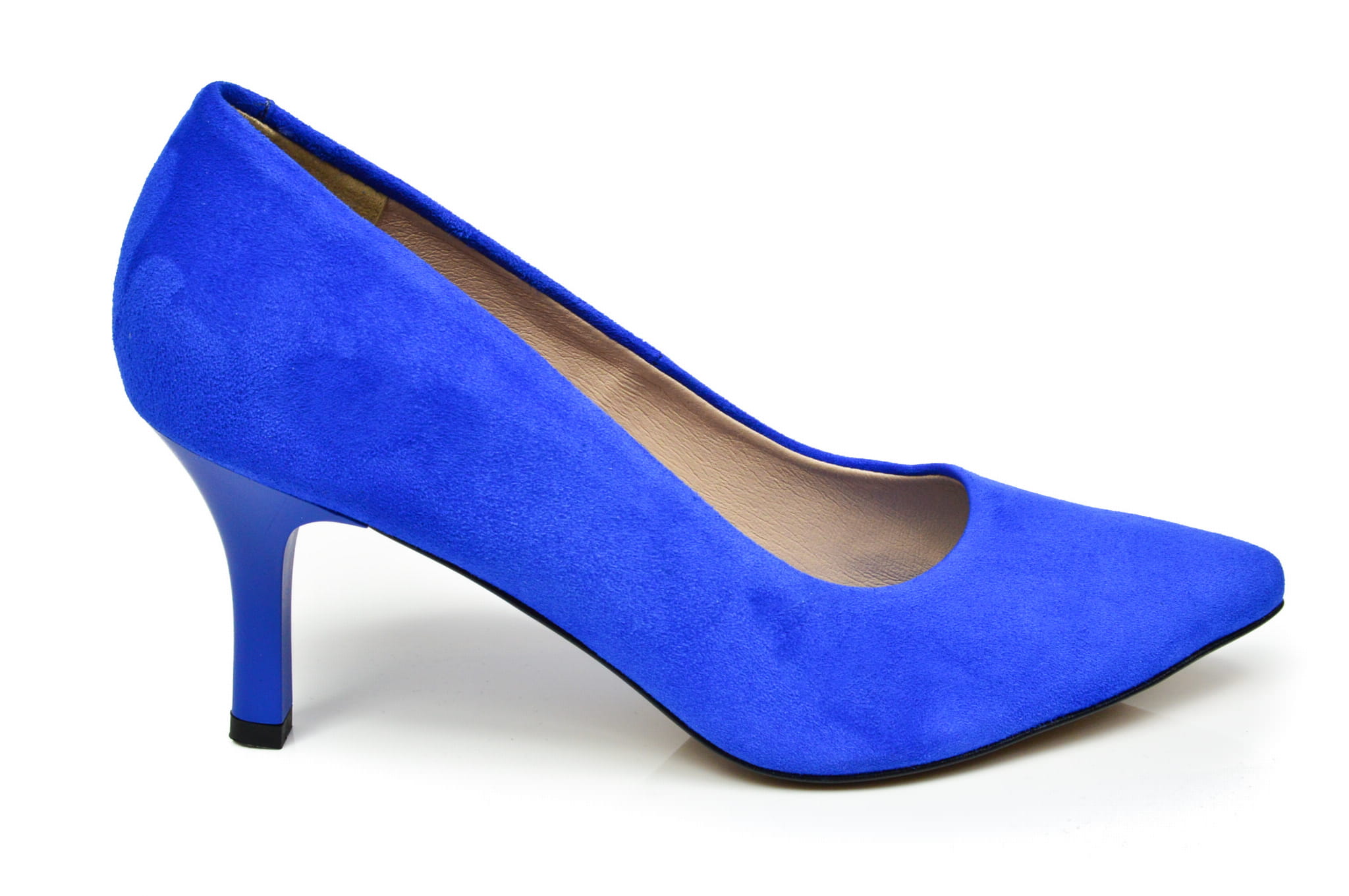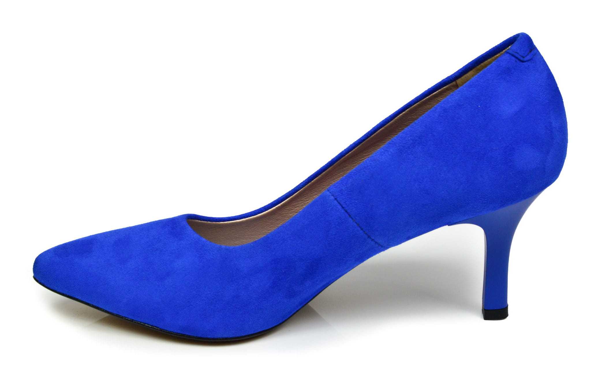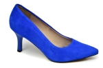 Szafirowe czółenka damskie w szpic, polskiej marki MargoShoes, wykonane ze skóry naturalnej- zamszowej, w butach zastosowano obcas typu szpilka o wysokości 7 cm.