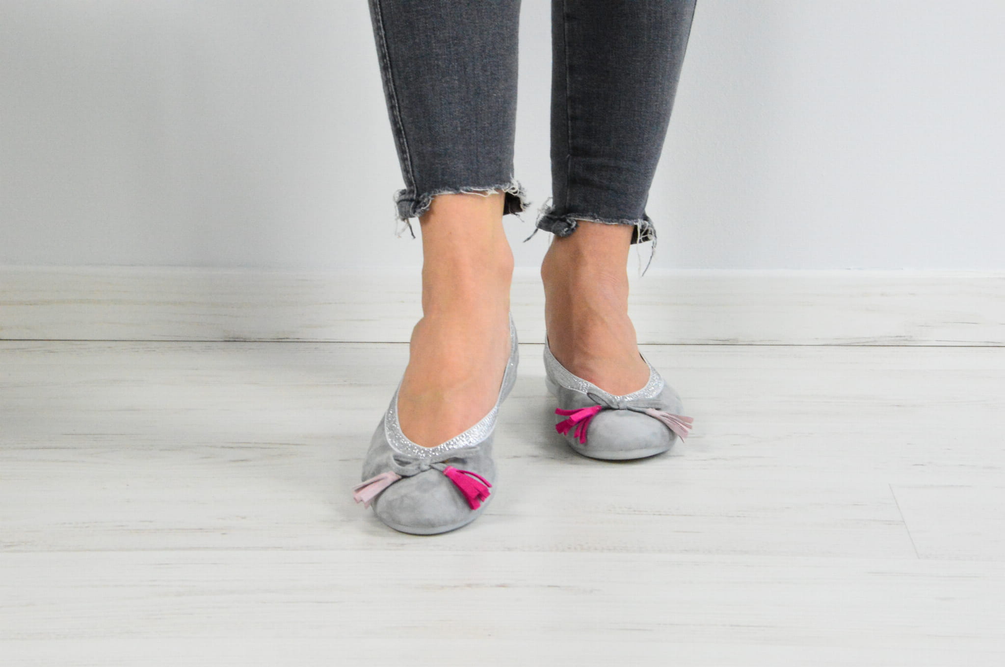 Co jest w trendach? Szare baleriny skórzane z uroczą kokardką i srebrnym paskiem!