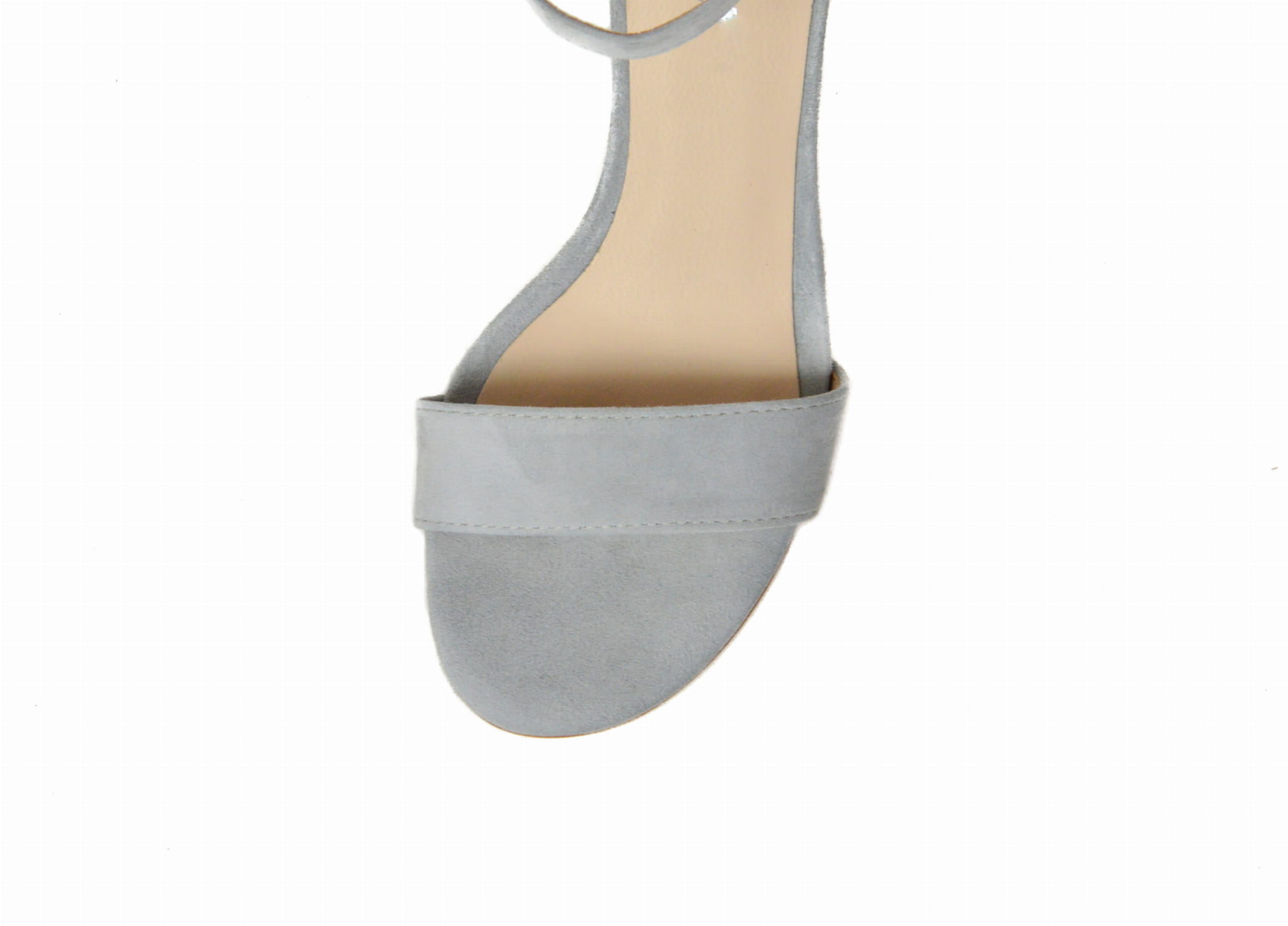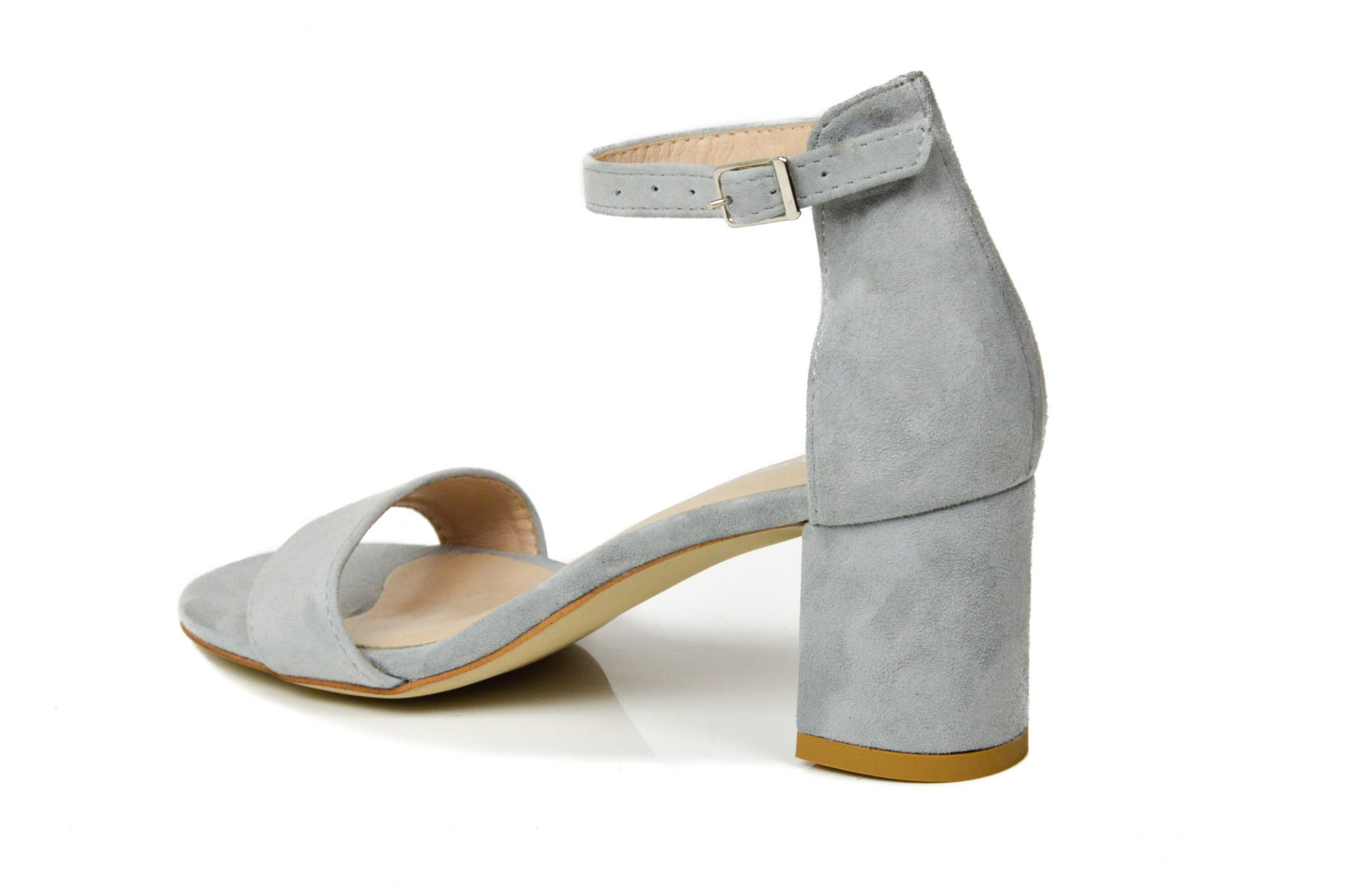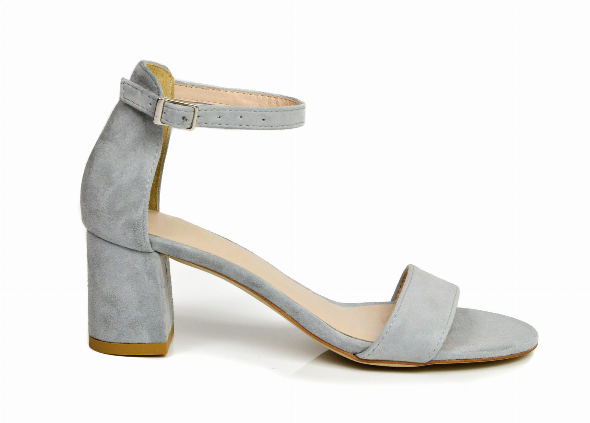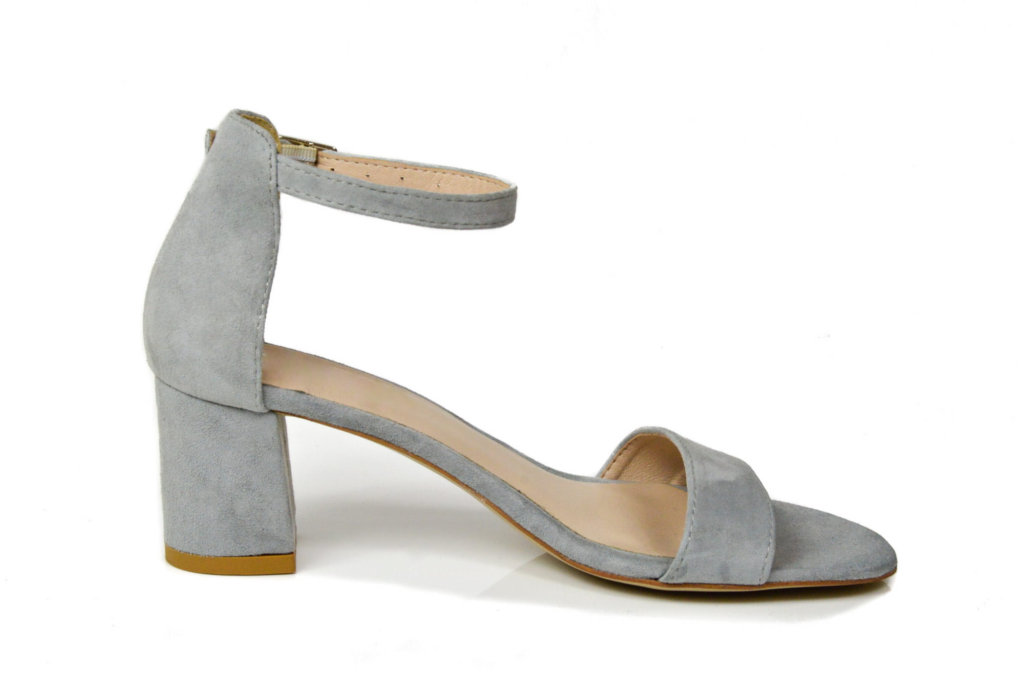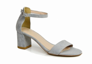 Szare sandałki damskie wyprodukowane z naturalnej skóry zamszowej, polskiej marki MargoShoes, wykonane na niskim obcasie typu klocek, zapinane wokół kostki klamerką.