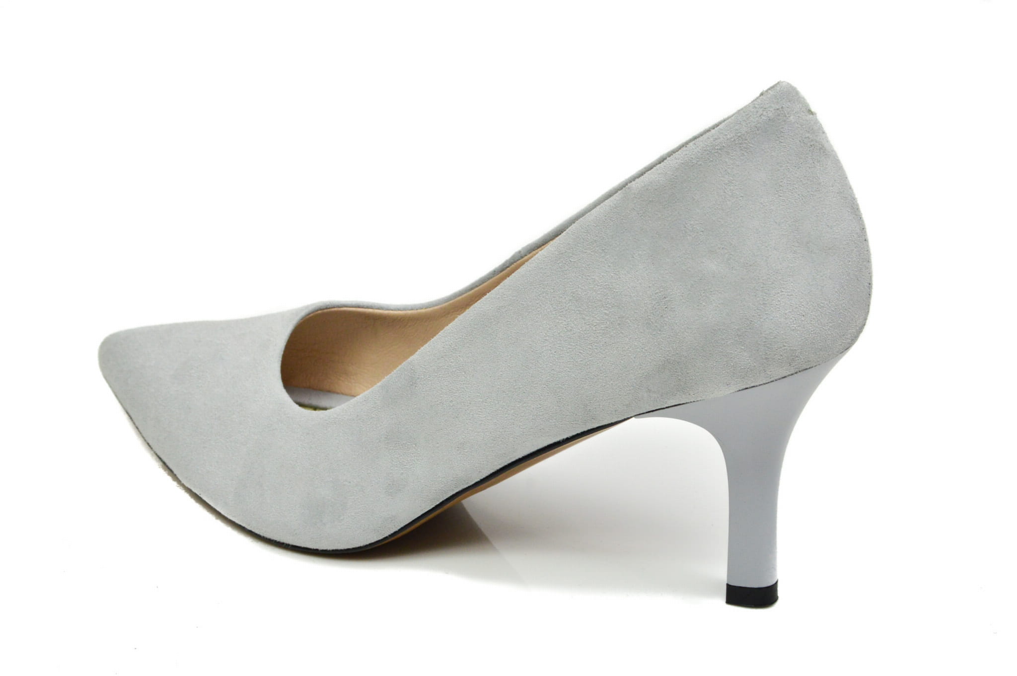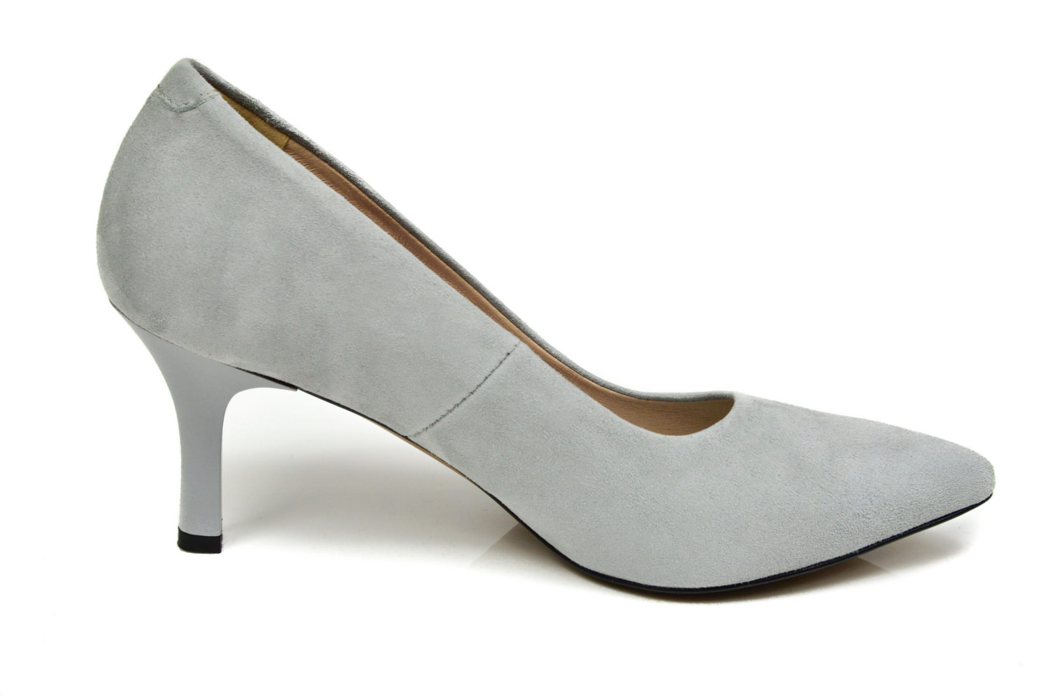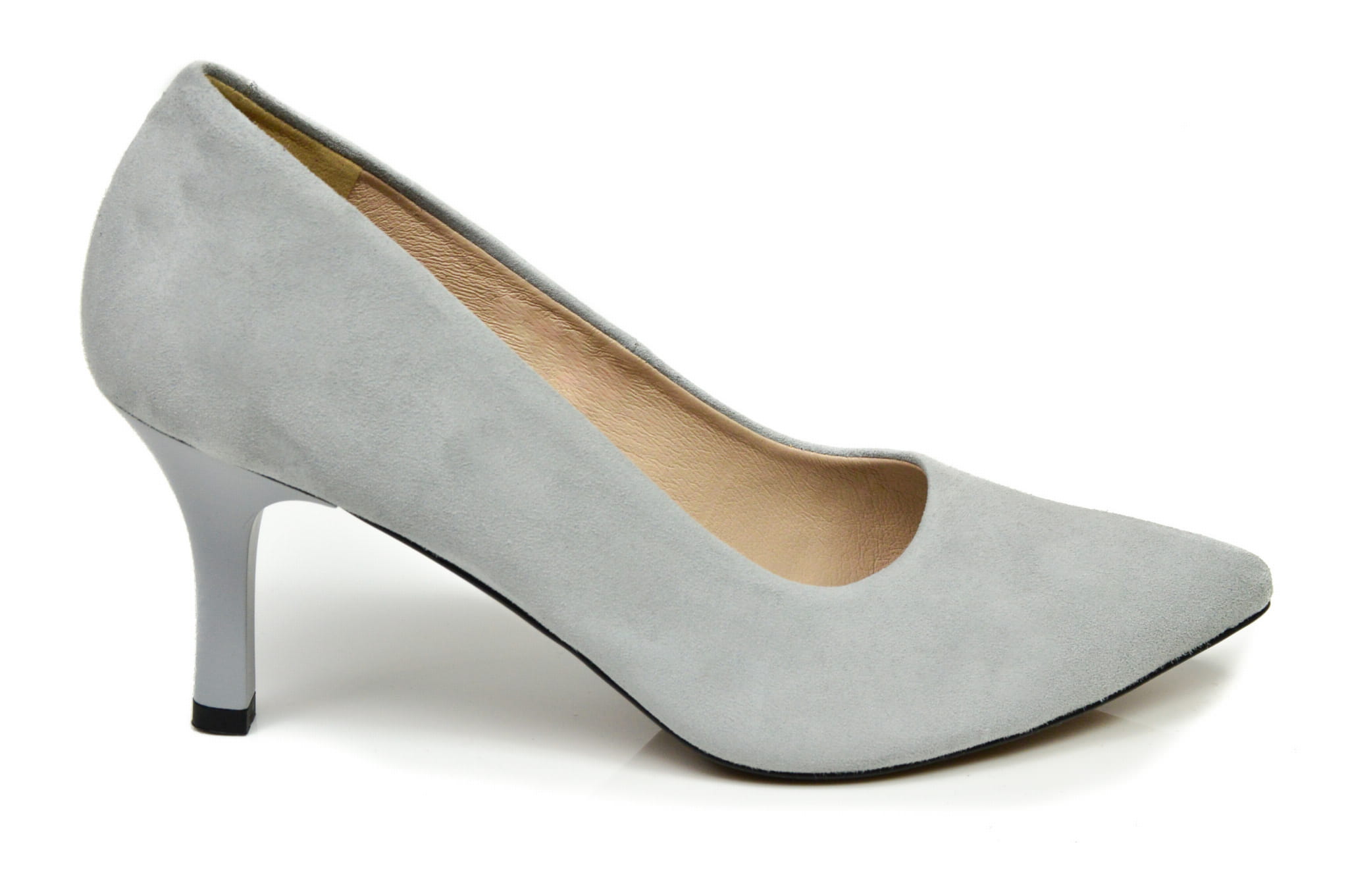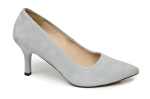Szare czółenka damskie w szpic, polskiej marki MargoShoes, wykonane ze skóry naturalnej- zamszowej, w butach zastosowano obcas typu szpilka o wysokości 7 cm.