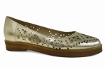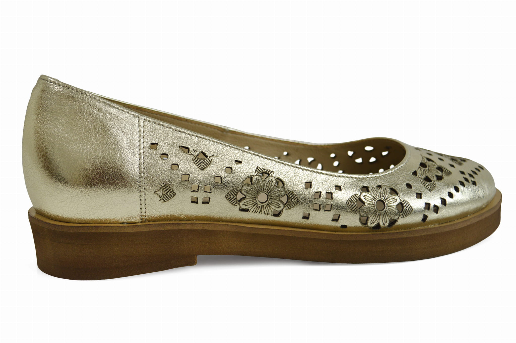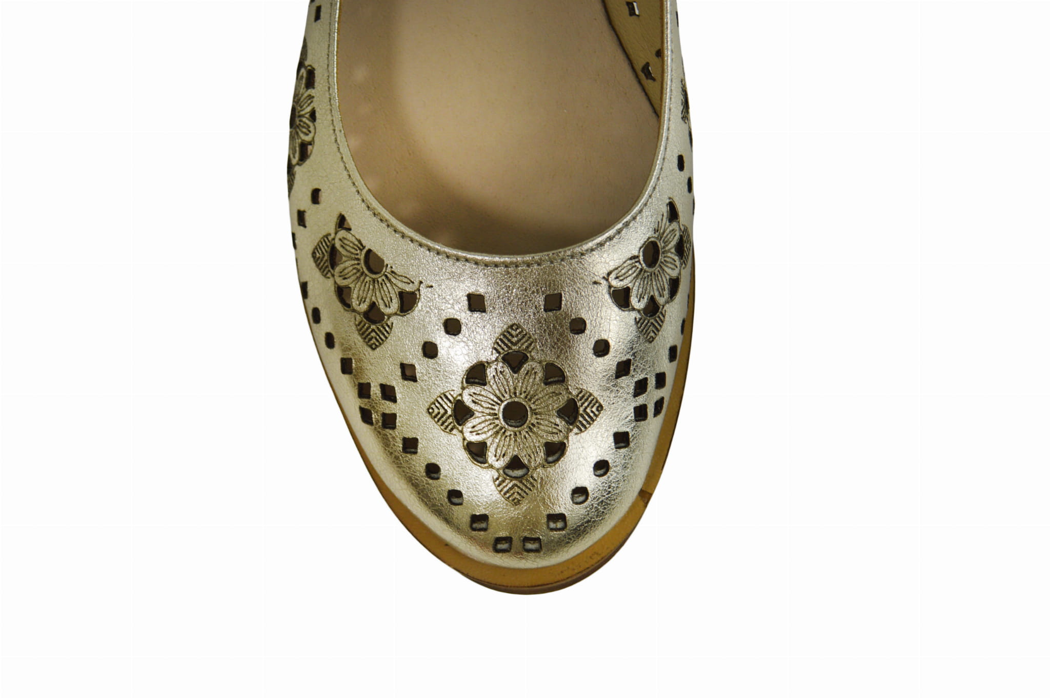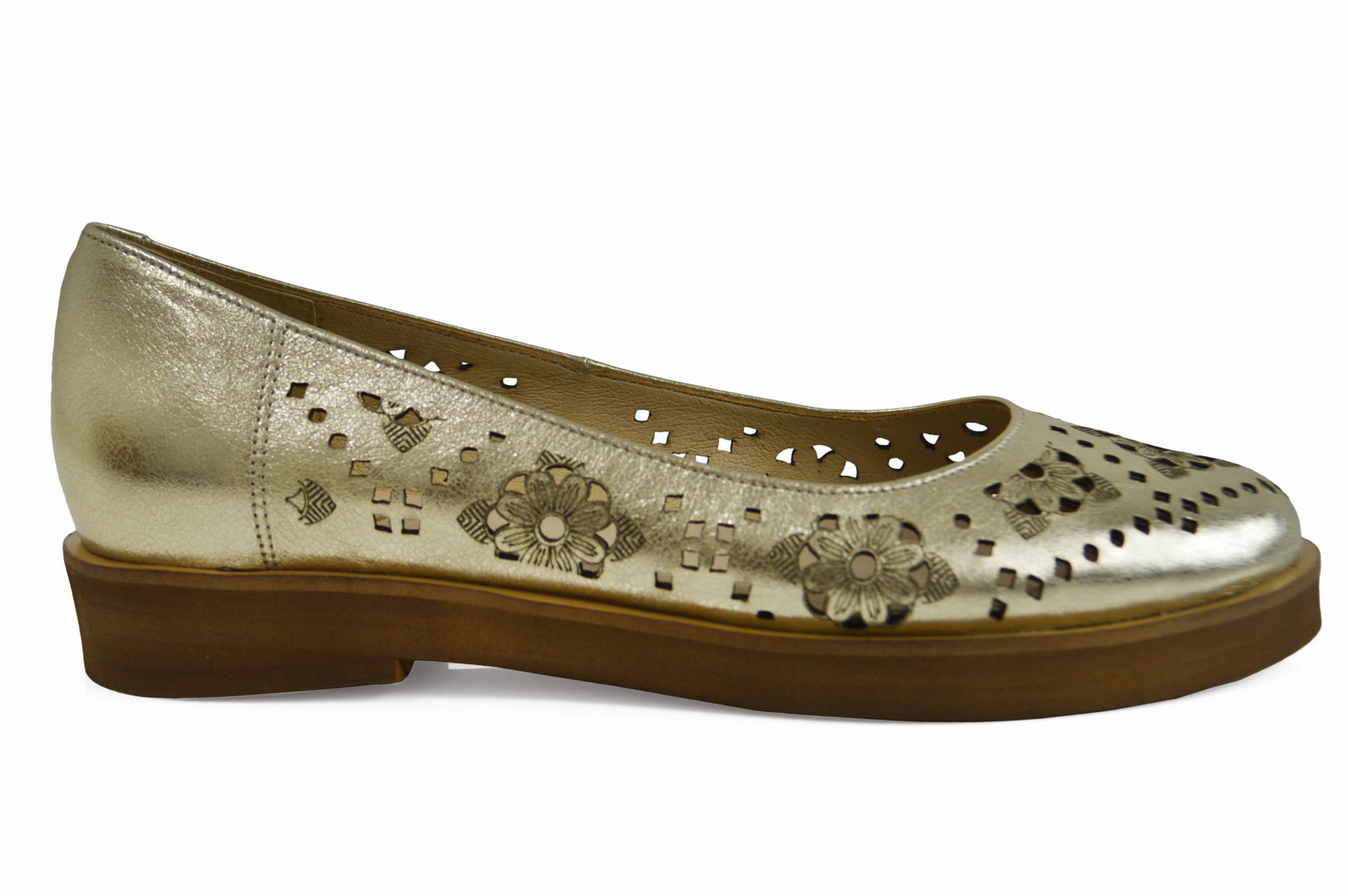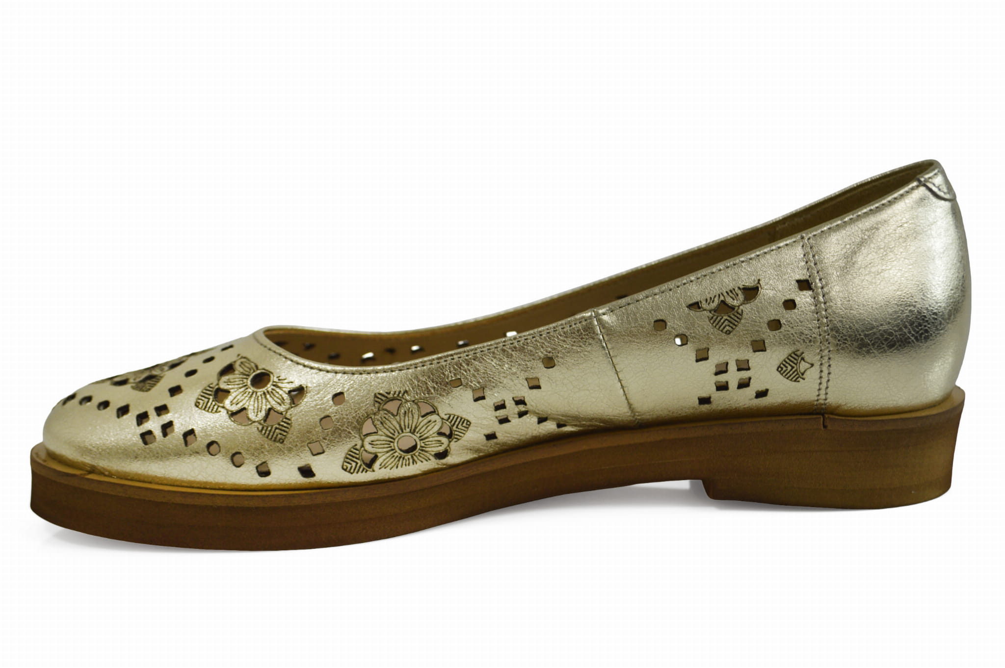 Złote baleriny mokasyny perforowane gruby spód skóra naturalna