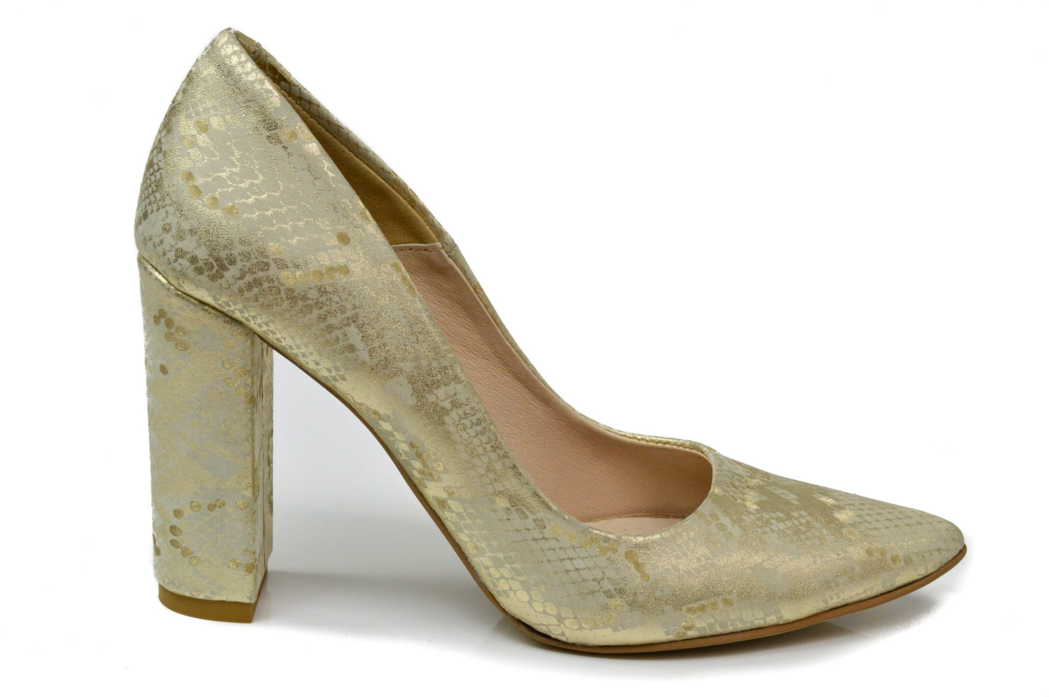 Pragniesz podkreślić swoje kobiece wdzięki? Chcesz zwrócić na siebie uwagę bez bycia zbyt krzykliwą czy nadmiernie ekstrawagancką? Jeśli tak – wszystko, czego Ci potrzeba, to wykonane z najwyższej jakości skóry naturalnej złote czółenka damskie na obcasie (na słupku). Stanowią one kuszącą propozycję dla każdej niezależnej kobiety, ceniącej sobie połączenie sprawdzonej klasyki z odważnym designem. Oryginalny motyw, wzorowany na teksturze łusek węża, nadaje butom niepowtarzalny charakter, a wnętrze z prawdziwej skóry zapewnia odpowiednią wentylację i niezrównany komfort podczas chodzenia.