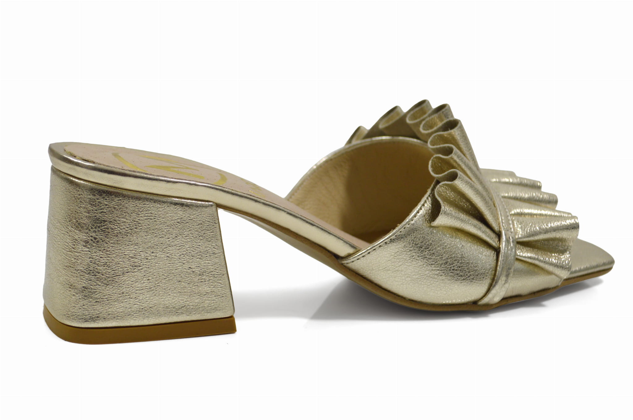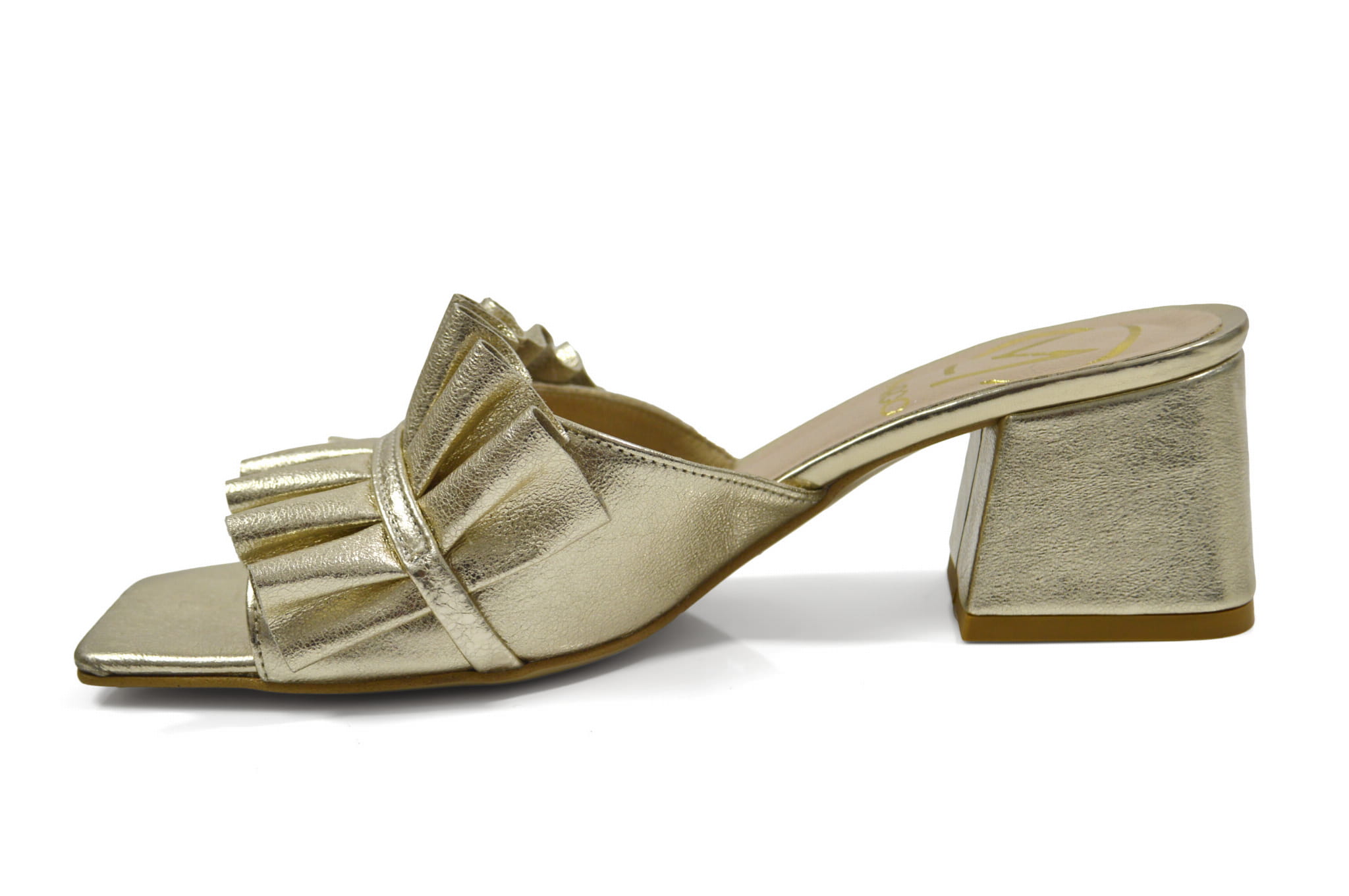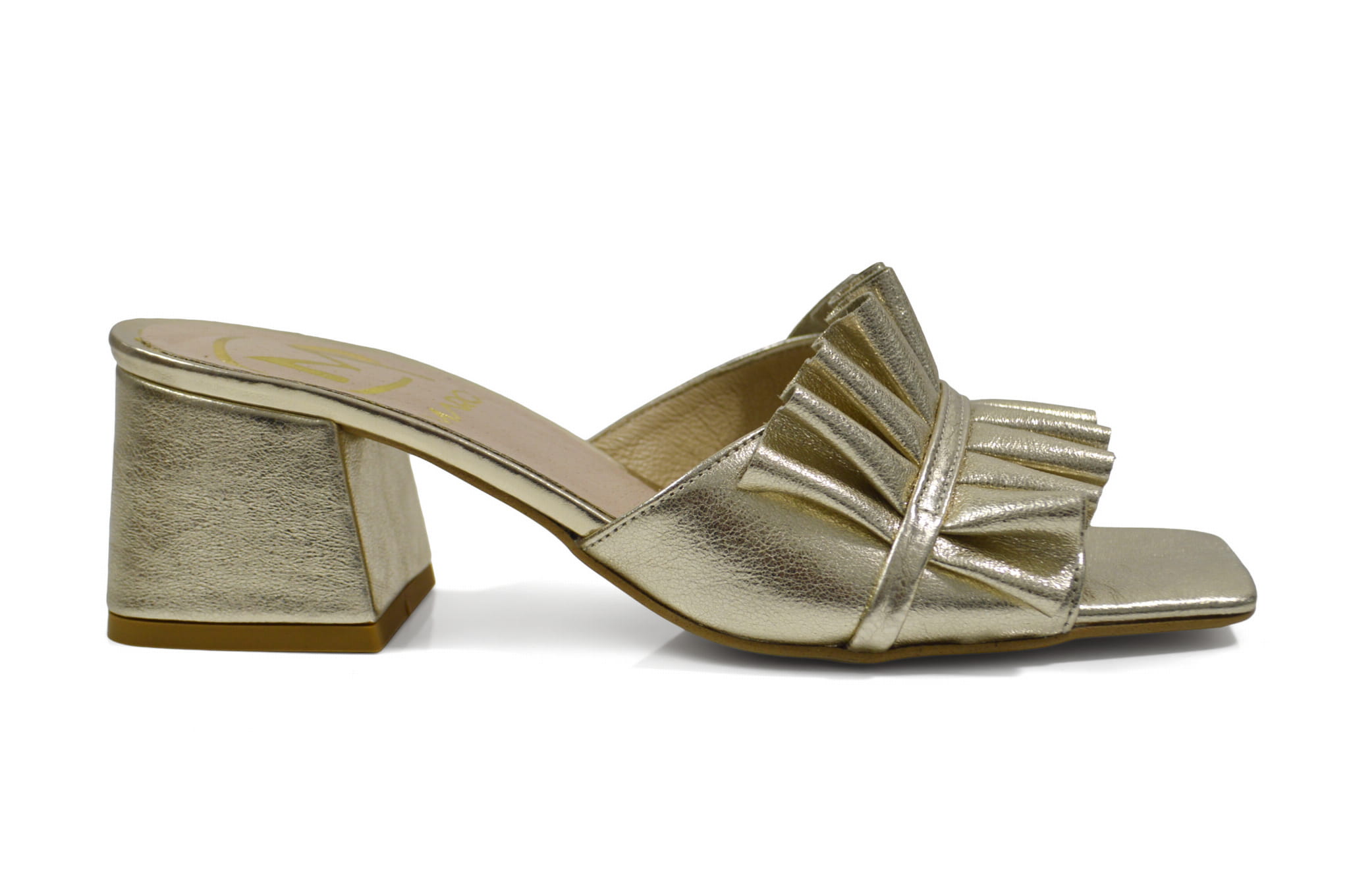 Złote klapki skórzane z ozdobą obcas klocek
