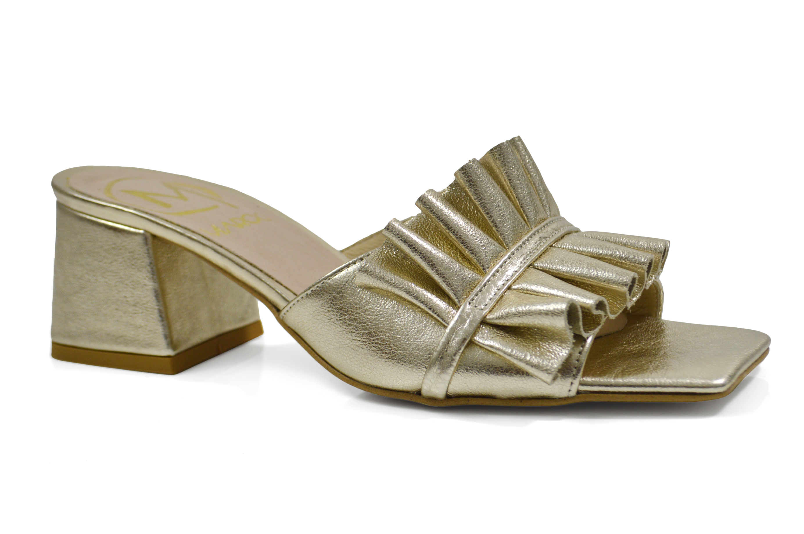 Podkreśl swój letni styl z naszymi złotymi klapkami skórzanymi na obcasie klocku. Wykonane z najwyższej jakości skóry, te klapki łączą wygodę z elegancją. Obcas typu klocek zapewnia stabilność kroku, natomiast subtelna ozdoba dodaje im unikatowego charakteru. Ich złoty połysk sprawia, że są idealne na letnie wieczory i specjalne okazje. Złote klapki skórzane na obcasie klocku z ozdobą to nie tylko modny dodatek, ale również niezawodne obuwie, które doda blasku Twojej garderobie.